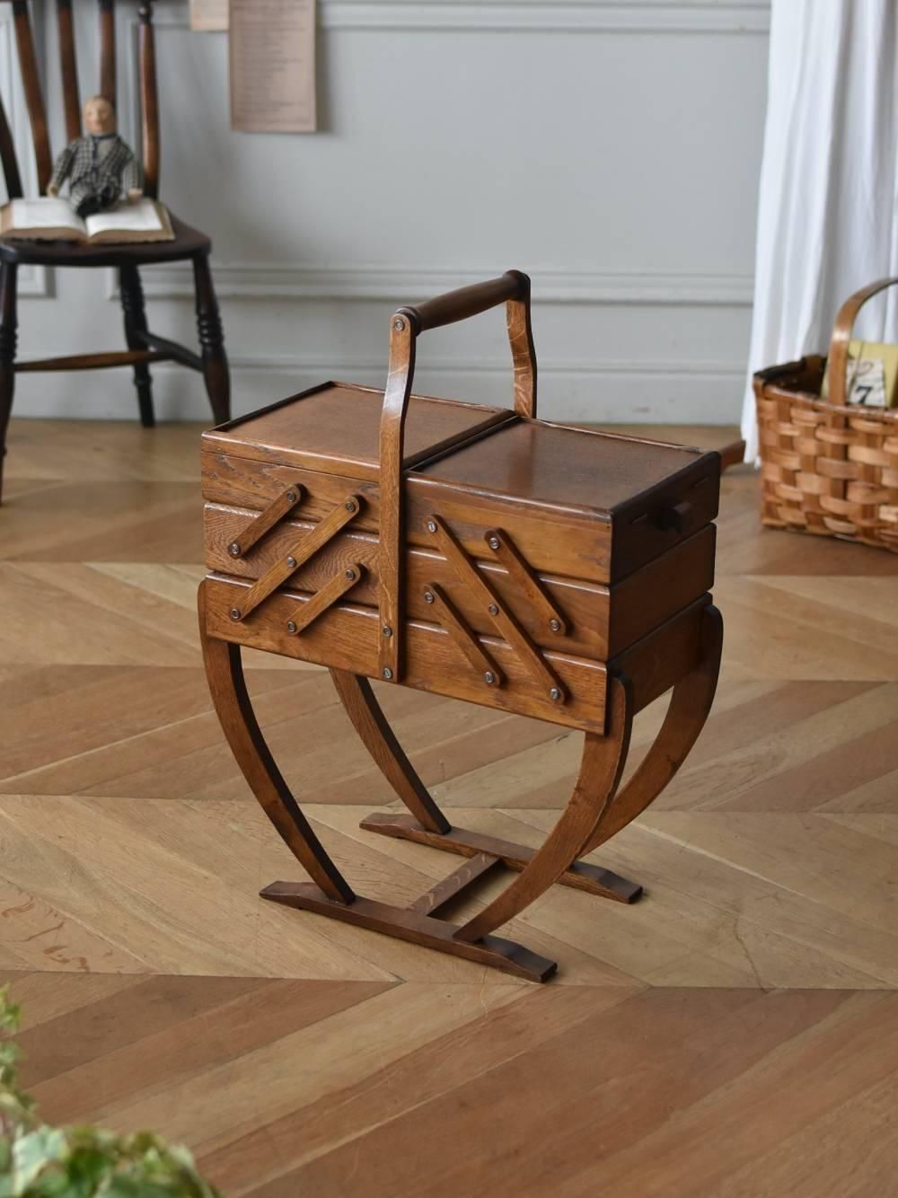 フランスの脚付きソーイングボックス。 優しげなブラウンカラーのボディは上品な艶のある質感で、しなやかなラインを描く脚元が柔らかな印象と抜け感を漂わせてくれる佇まい。天板部分の縁は盛り上がっており、置いたものが転がり落ちにくい形状で機能的にもしっかりと考えられたデザインです。 一度バラして、パーツごとに剥離からウレタン塗装までし直しております。しっかりと組み直しているのでがたつきや緩みもなく、安心してお使いいただける逸品に。 左右に大きく階段状に開くので細かな物の出し入れもしやすく、高さがある作りでソファなどに座って作業する際にも使い勝手が良い機能的なアイテムです。 W 約53cm(広げた際のW 約130cm) D 約27cm H 約69cm 内寸(上から) 深さ約4.3cm/6.7cm/6.5cm
