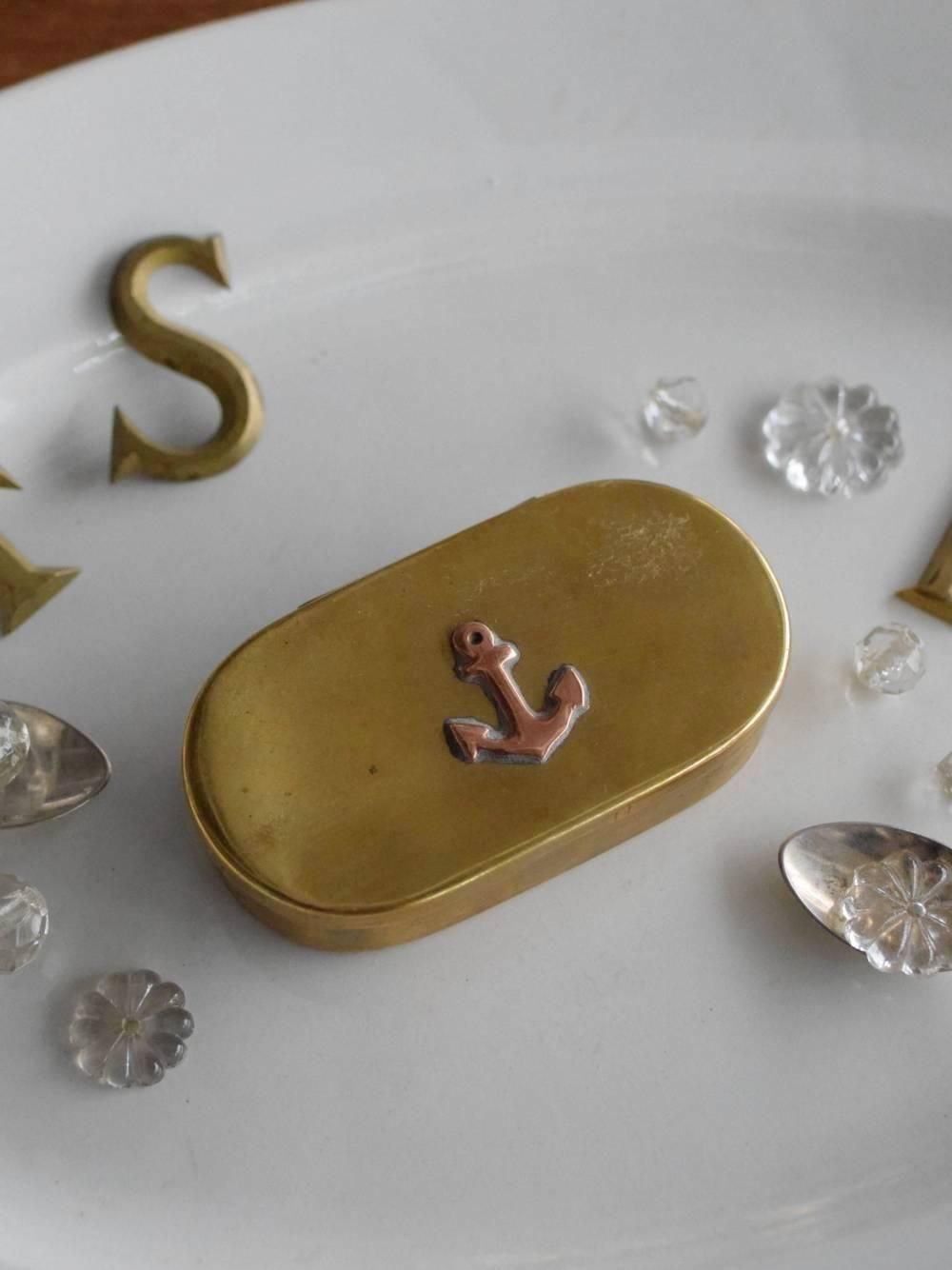 フランスのヴィンテージピルケース。 ポケットサイズの小さなケースで、ぷっくりとしたイカリのマークがワンポイントに。表面は真鍮加工され、経年による味わいが色濃く感じられ、雰囲気のある質感が魅力的です。元々はおそらくピルケースかと思われますが、小さなアクセサリーやヘアピン、絆創膏など、ちょっとしたものを持ち運ぶのにも便利そう。携帯も可能なサイズ感ですが、インテリアの一部としてさりげなく飾ってみても素敵ですよ。 形状が異なりますが、似たデザインのものがもう一点あります。(ピルケース anchor.1) W 約11cm D 約6cm H 約2.3cm 内寸 W約10.5cm×D約5.6×H約2.2cm