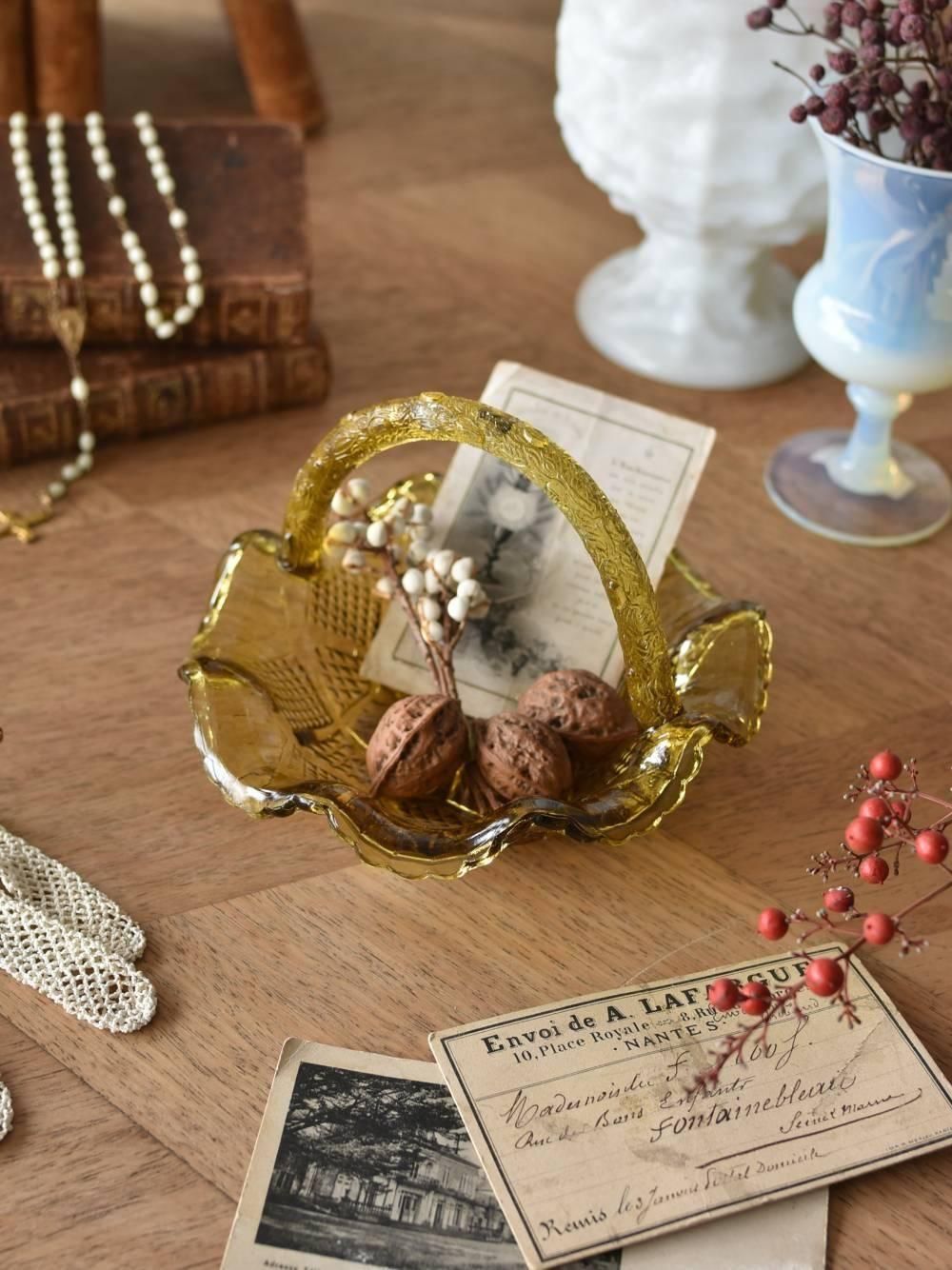 フランスのパニエ型小物入れ。 アンバーカラーのガラスが落ち着きあるシックな装いで、波打つフリルラインと細やかな凹凸で模様が描かれたハンドルが特徴的。光を反射して陰影の美しさを魅せるプレストガラス製で、長い歴史を持つフランスのガラスメーカー"Portieux(ポルティユー)"の刻印がしっかりと入れられています。 小ぶりですが独自の存在感を漂わせてくれるデザインで、卓上ディスプレイをより華やかに演出してくれるアイテムです。 W 約16.5cm D 約17.3cm H 約11cm