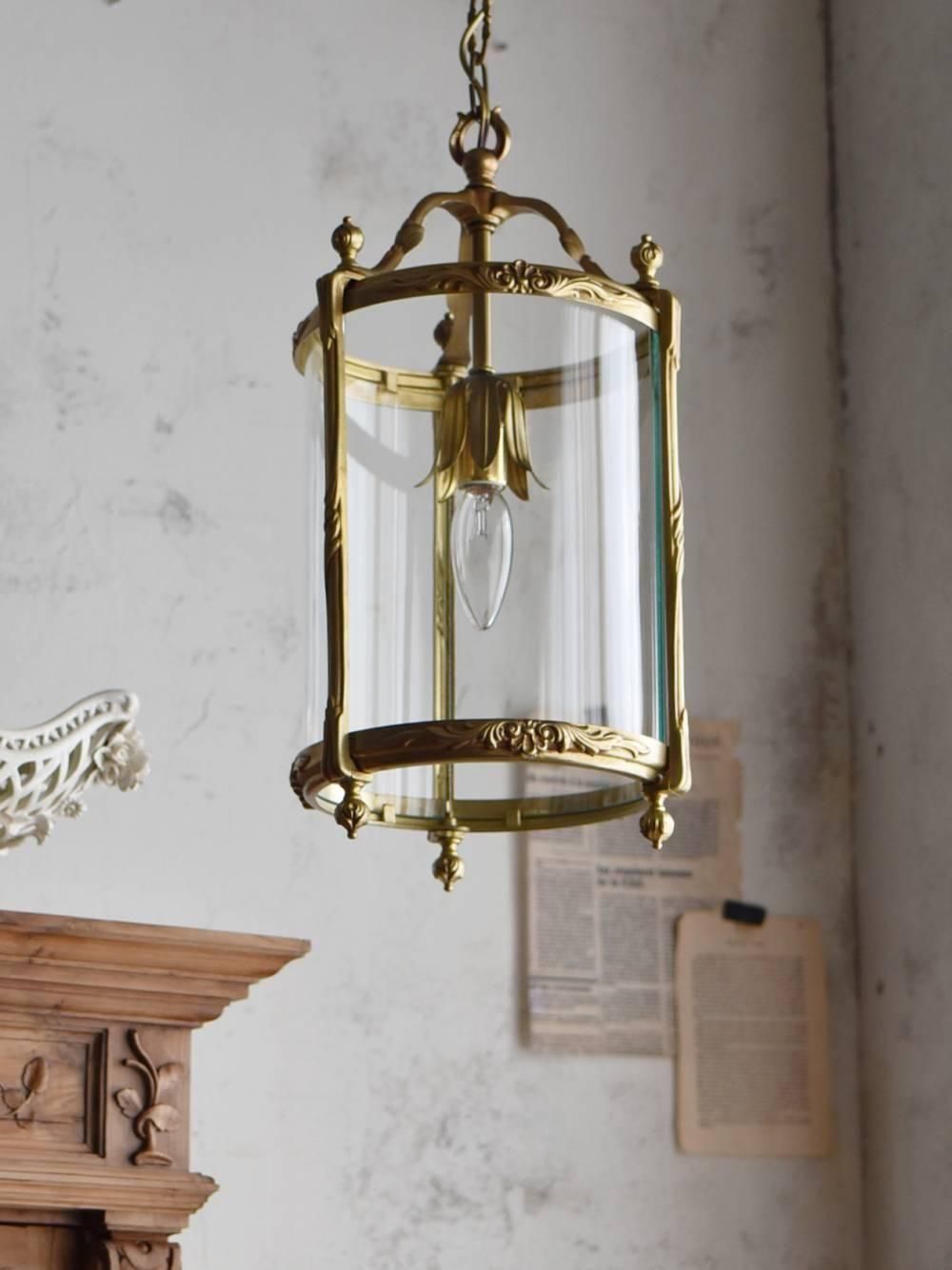 フランスの筒型ランタンランプ。 湾曲したガラス3面で囲まれ、明るいゴールドカラーのフレームに施されたシェルや植物などの自然豊かなレリーフが優美な雰囲気を演出してくれます。上下にはぽってりとした小さな装飾が施されており、花の蕾のようになった可憐な姿も楽しめ、すっきりとした縦長シルエットとなった美しいデザインです。 コード・ソケット・シーリングは新しいものに交換済みです。こちらの商品は条件を満たしているので引掛シーリングをご使用いただけます。元は直付けで使われていた物で天井カバーが浅い為、天井との間に隙間ができます。天井との隙間が気になられる方は直付け工事をおすすめします。 電球は付属しません。 直径 約20.5cm H 約40.5cm コード含む全長 約66cm 重量 約2.9kg 電球口径 E17 *60W以下をご使用下さい。