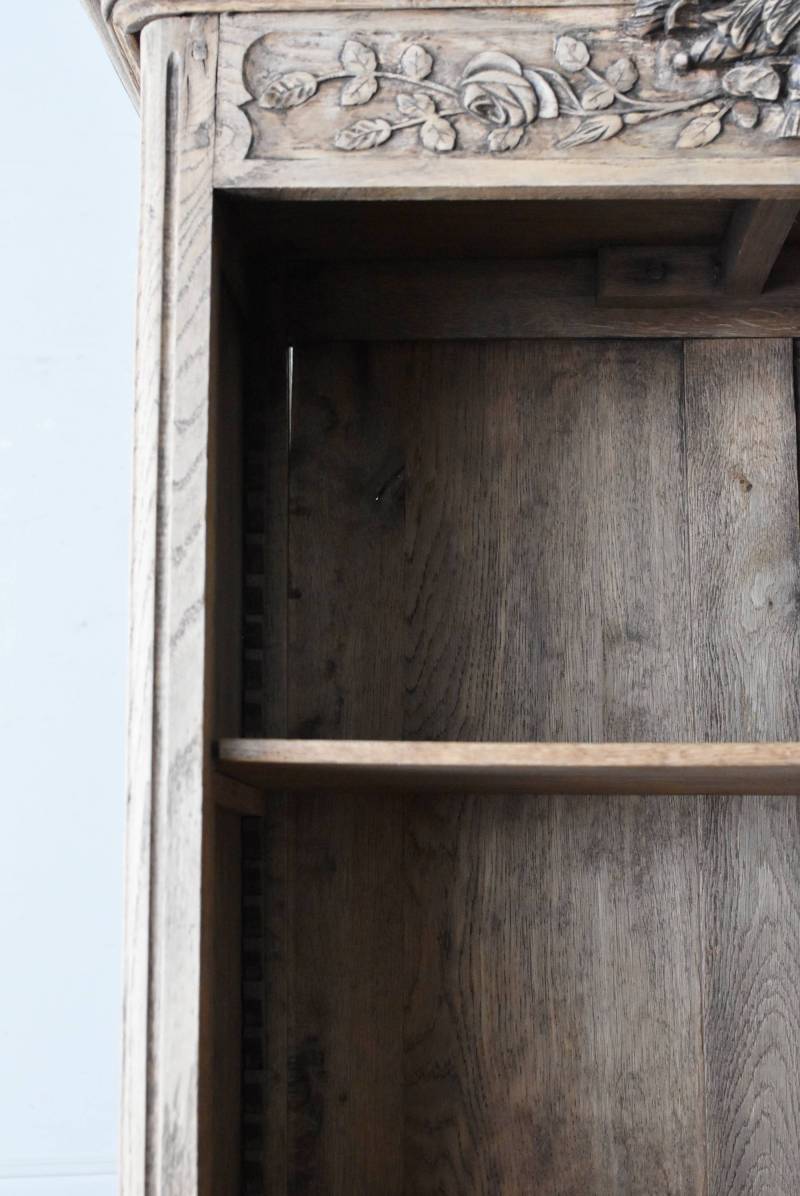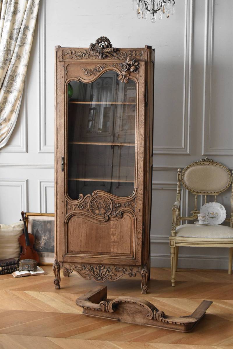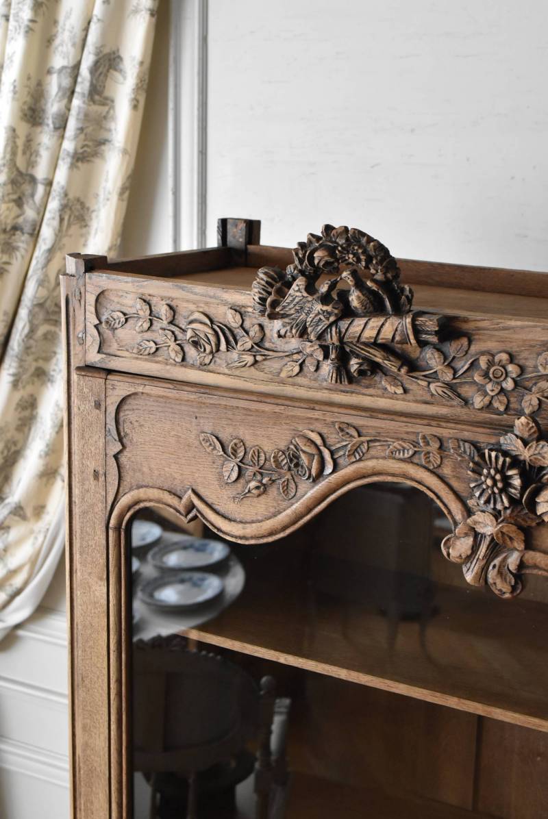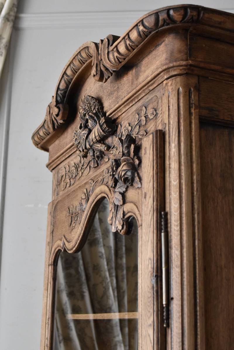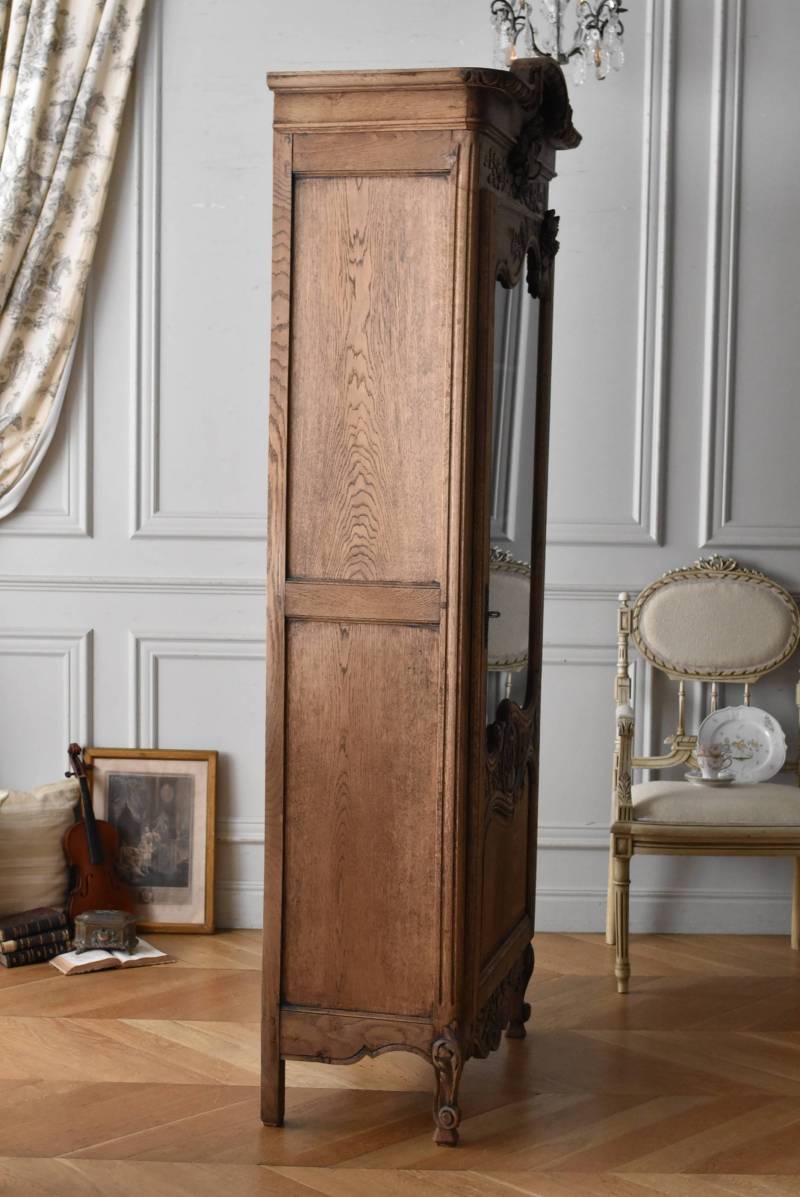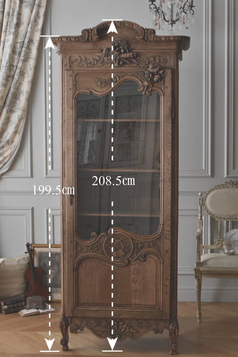 フランス・19世紀後半のアンティークガラスキャビネット。 剥離されたオーク材は素朴ながらも重厚感のある雰囲気が漂い、ガラス周りを流れるような曲線が囲んだ優美な佇まいです。向かいあった小鳥やハープ、植物などのはっきりとした陰影のあるレリーフが豪華に施されており、一つ一つの細工にうっとりさせられるような豊かさが伝わってきます。 上部の装飾は取り外しが出来、はめ込むような構造となっており、ずれ落ちる事はありません。鍵は施錠可能です。棚板の高さ調節は若干ではありますが調整する事が出来、お気に入りの雑貨を並べたり、食器棚としても活躍してくれそうです。 W 約88.5cm D 約45cm H 約208.5cm 棚面積 W約70.5cm×D約30cm 搬入経路について こちらの商品の配送について