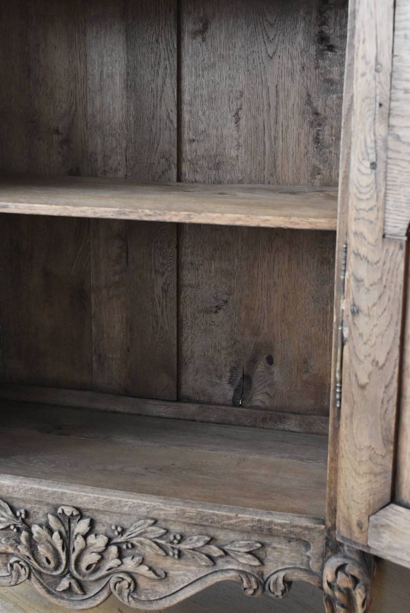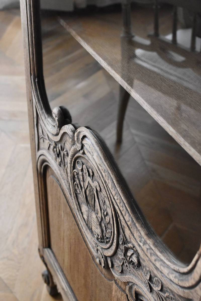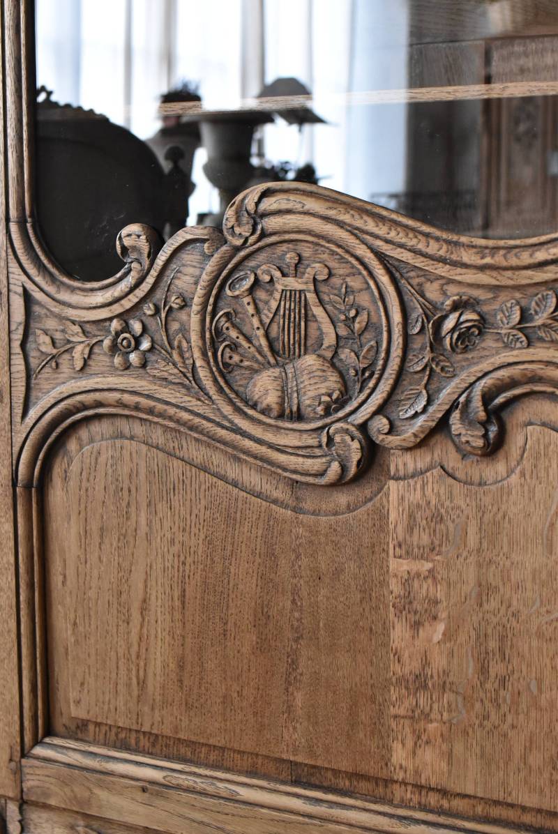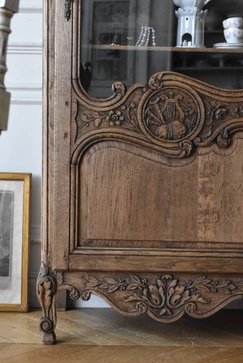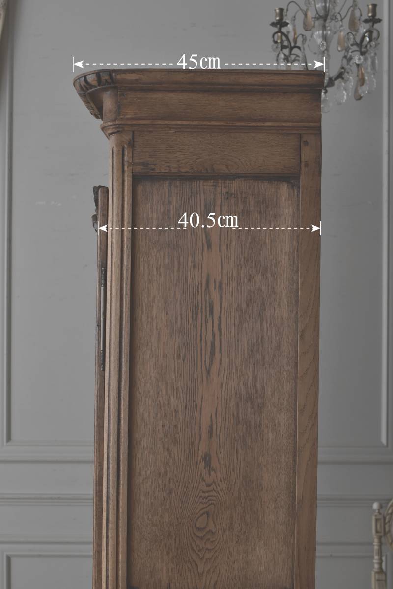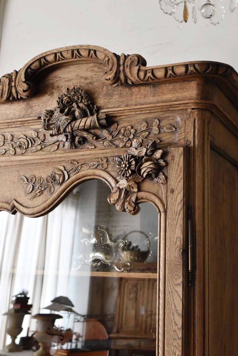 フランス・19世紀後半のアンティークガラスキャビネット。 剥離されたオーク材は素朴ながらも重厚感のある雰囲気が漂い、ガラス周りを流れるような曲線が囲んだ優美な佇まいです。向かいあった小鳥やハープ、植物などのはっきりとした陰影のあるレリーフが豪華に施されており、一つ一つの細工にうっとりさせられるような豊かさが伝わってきます。 上部の装飾は取り外しが出来、はめ込むような構造となっており、ずれ落ちる事はありません。鍵は施錠可能です。棚板の高さ調節は若干ではありますが調整する事が出来、お気に入りの雑貨を並べたり、食器棚としても活躍してくれそうです。 W 約88.5cm D 約45cm H 約208.5cm 棚面積 W約70.5cm×D約30cm 搬入経路について こちらの商品の配送について
