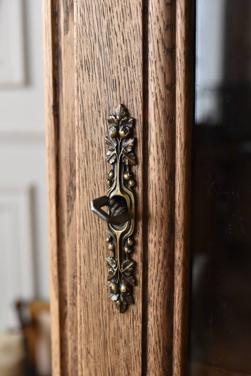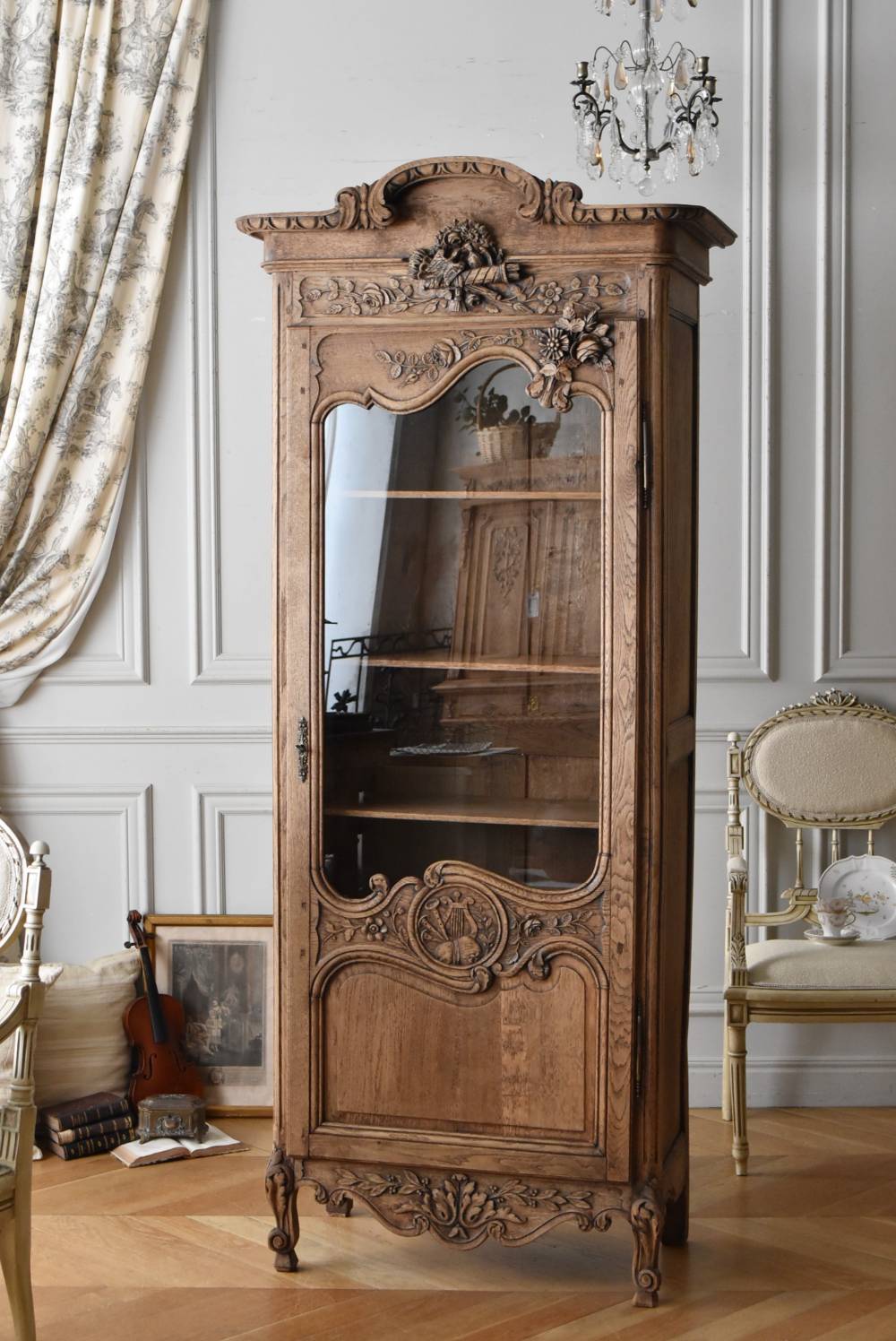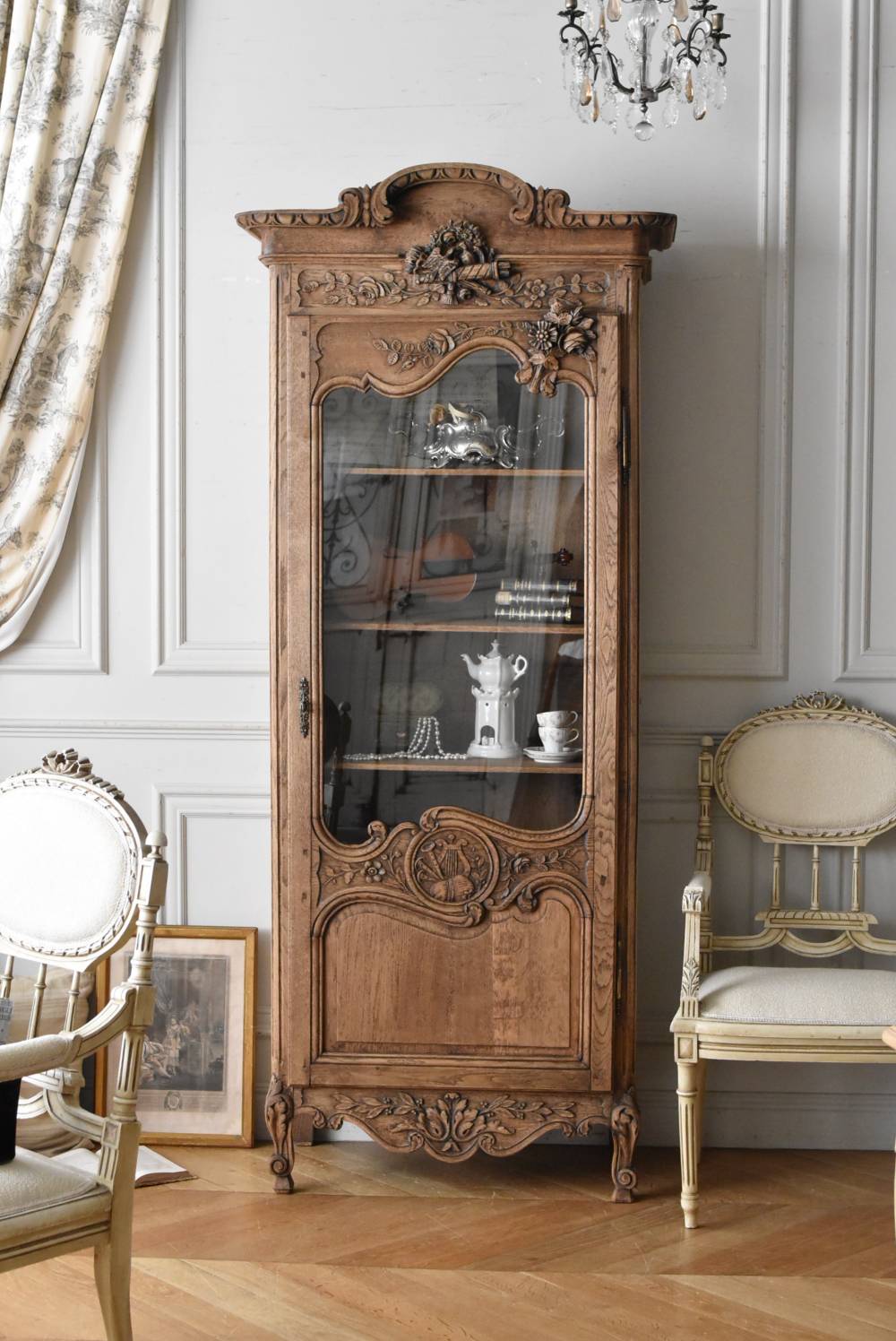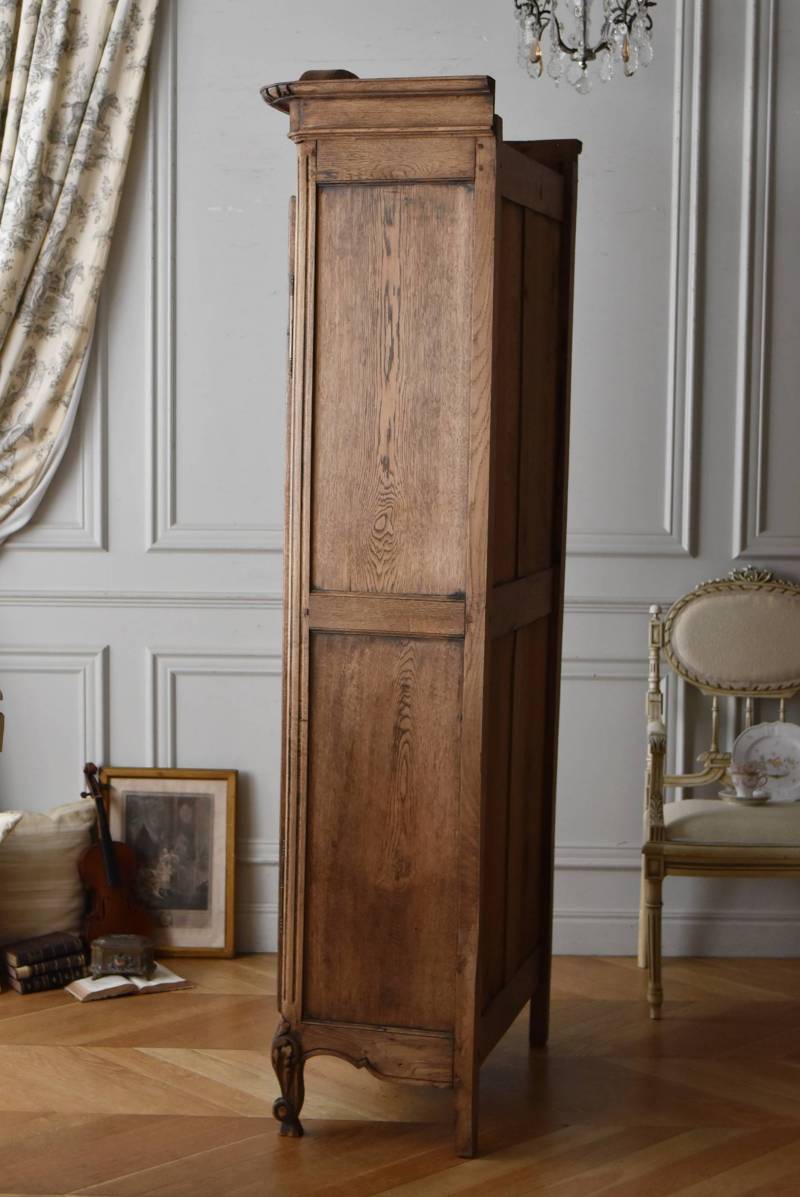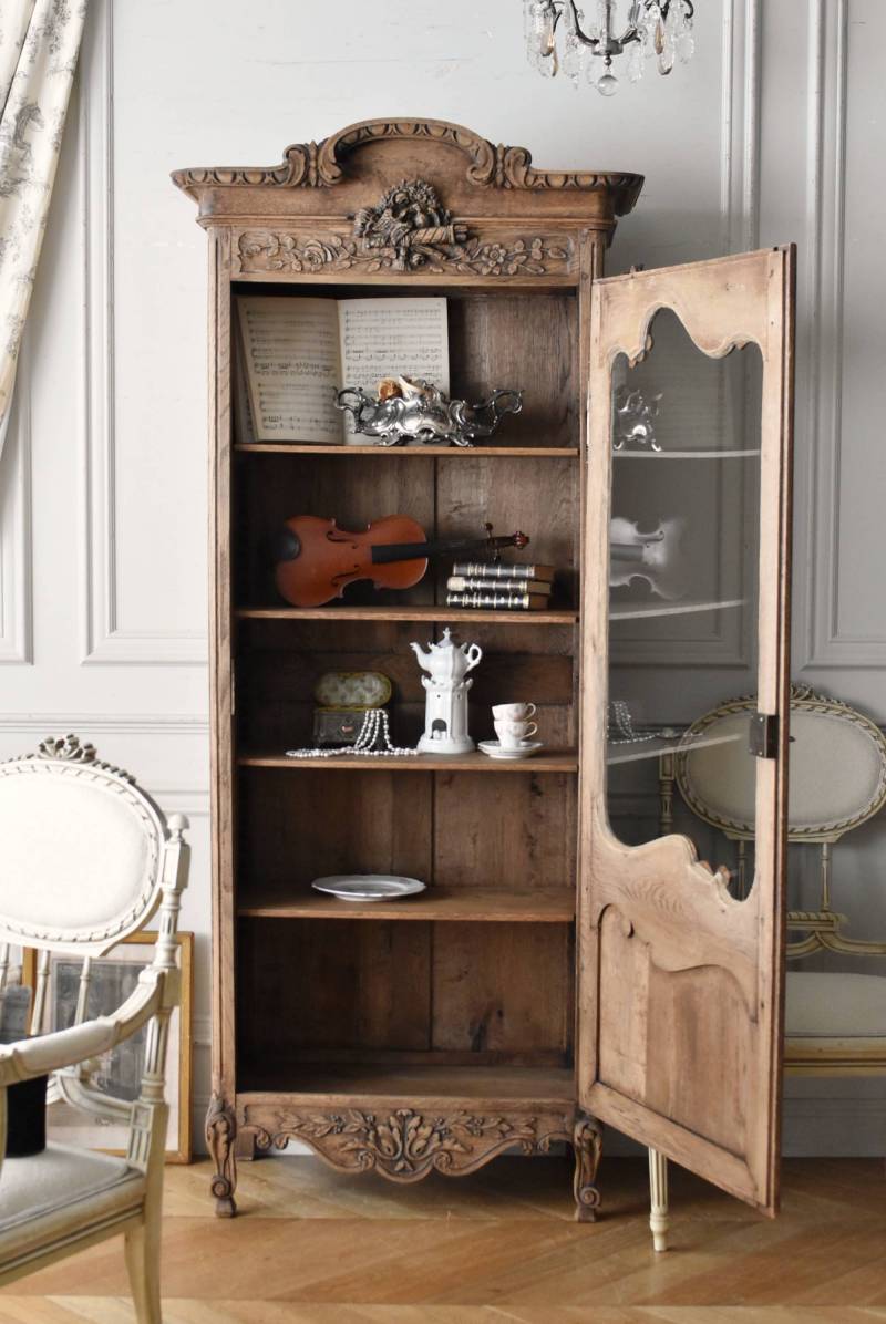 フランス・19世紀後半のアンティークガラスキャビネット。 剥離されたオーク材は素朴ながらも重厚感のある雰囲気が漂い、ガラス周りを流れるような曲線が囲んだ優美な佇まいです。向かいあった小鳥やハープ、植物などのはっきりとした陰影のあるレリーフが豪華に施されており、一つ一つの細工にうっとりさせられるような豊かさが伝わってきます。 上部の装飾は取り外しが出来、はめ込むような構造となっており、ずれ落ちる事はありません。鍵は施錠可能です。棚板の高さ調節は若干ではありますが調整する事が出来、お気に入りの雑貨を並べたり、食器棚としても活躍してくれそうです。 W 約88.5cm D 約45cm H 約208.5cm 棚面積 W約70.5cm×D約30cm 搬入経路について こちらの商品の配送について