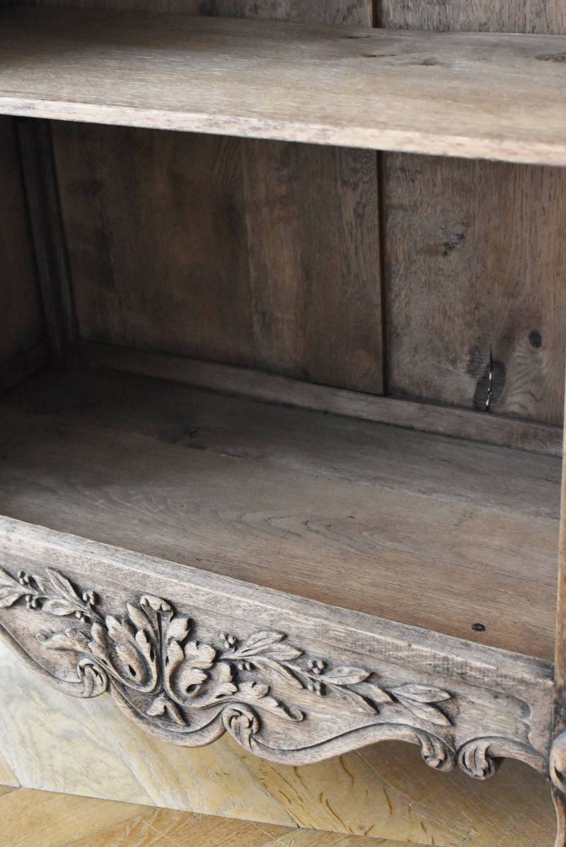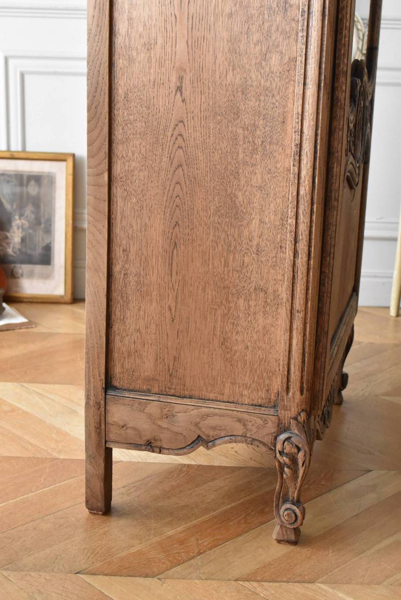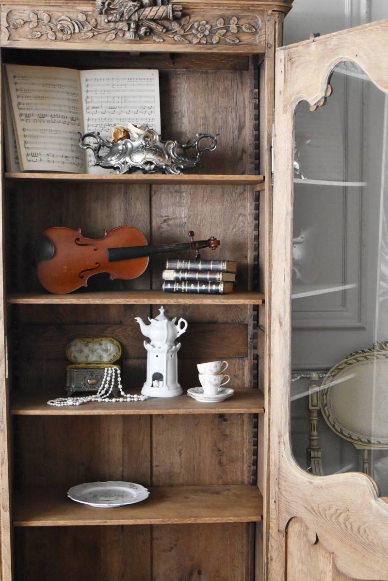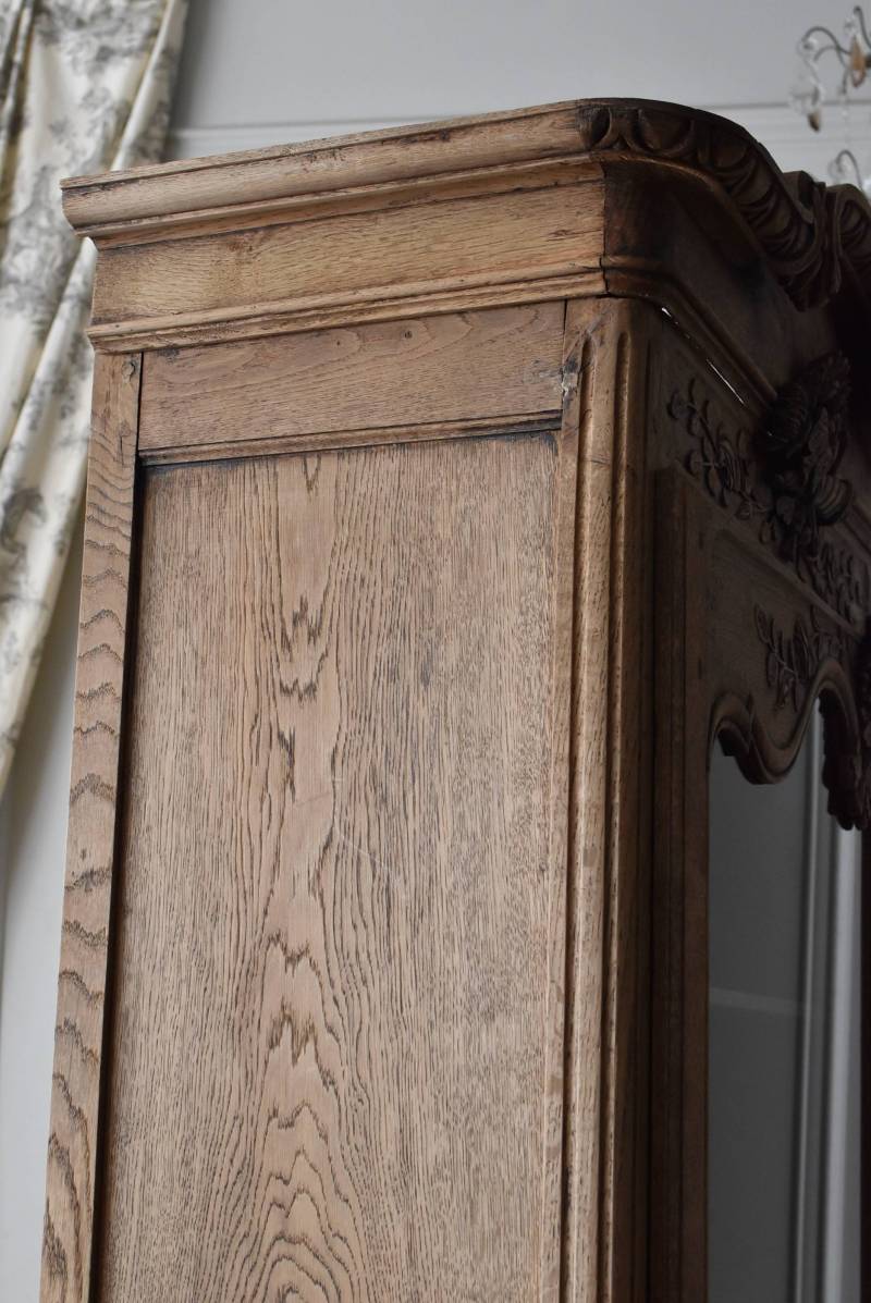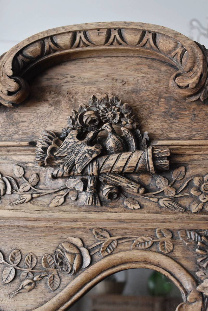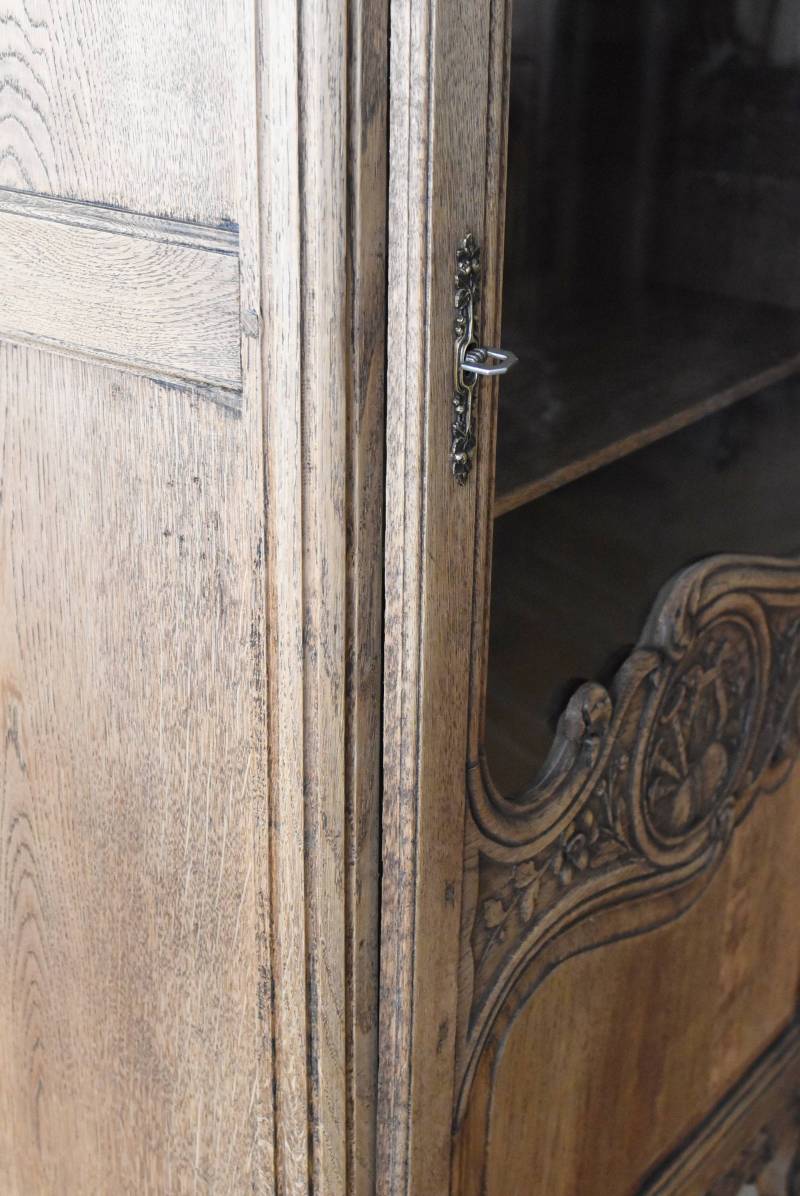 フランス・19世紀後半のアンティークガラスキャビネット。 剥離されたオーク材は素朴ながらも重厚感のある雰囲気が漂い、ガラス周りを流れるような曲線が囲んだ優美な佇まいです。向かいあった小鳥やハープ、植物などのはっきりとした陰影のあるレリーフが豪華に施されており、一つ一つの細工にうっとりさせられるような豊かさが伝わってきます。 上部の装飾は取り外しが出来、はめ込むような構造となっており、ずれ落ちる事はありません。鍵は施錠可能です。棚板の高さ調節は若干ではありますが調整する事が出来、お気に入りの雑貨を並べたり、食器棚としても活躍してくれそうです。 W 約88.5cm D 約45cm H 約208.5cm 棚面積 W約70.5cm×D約30cm 搬入経路について こちらの商品の配送について