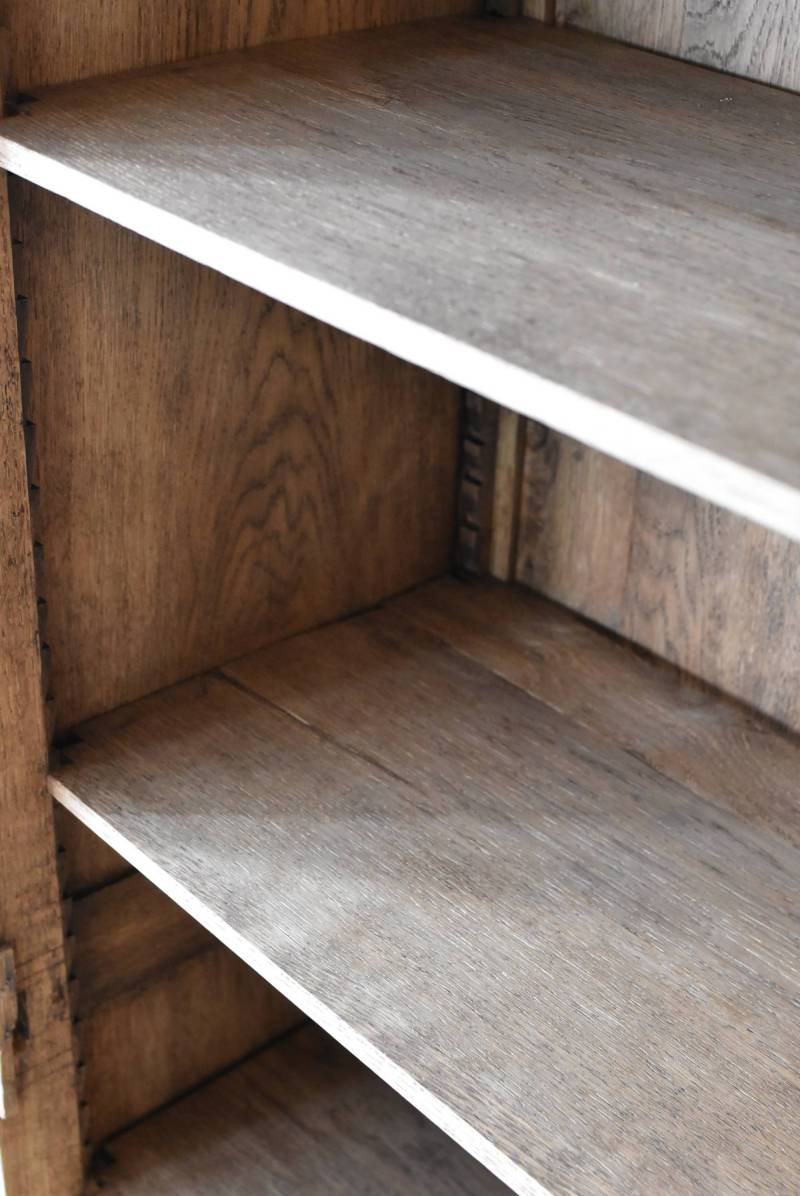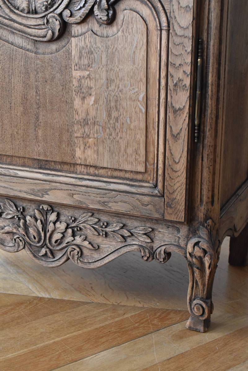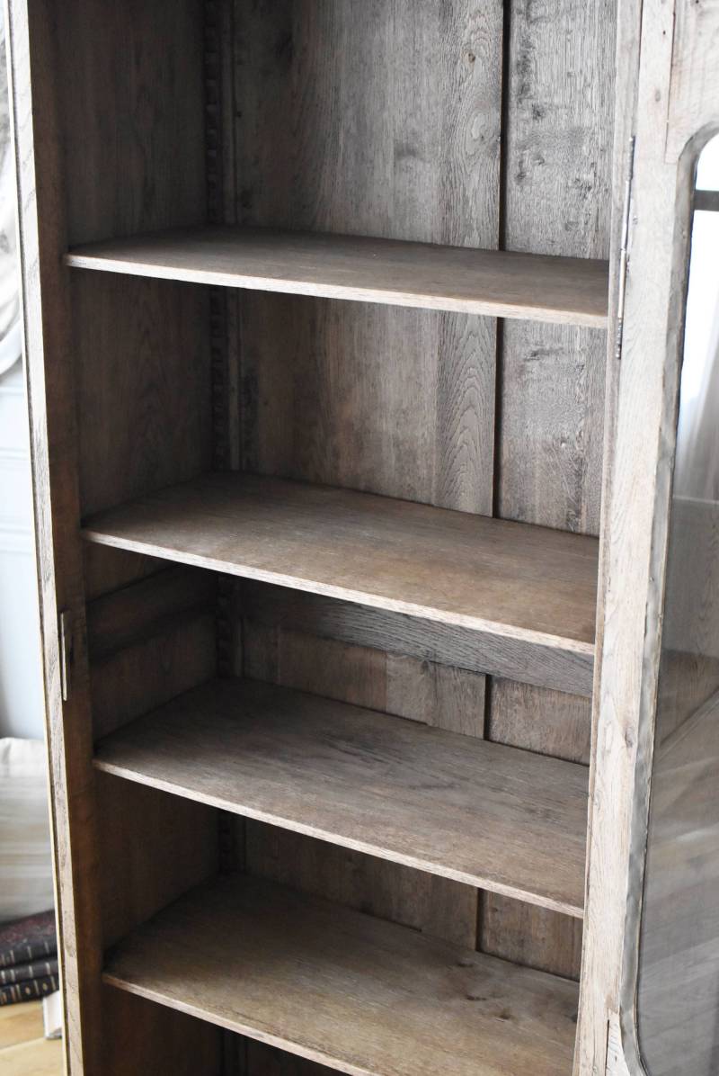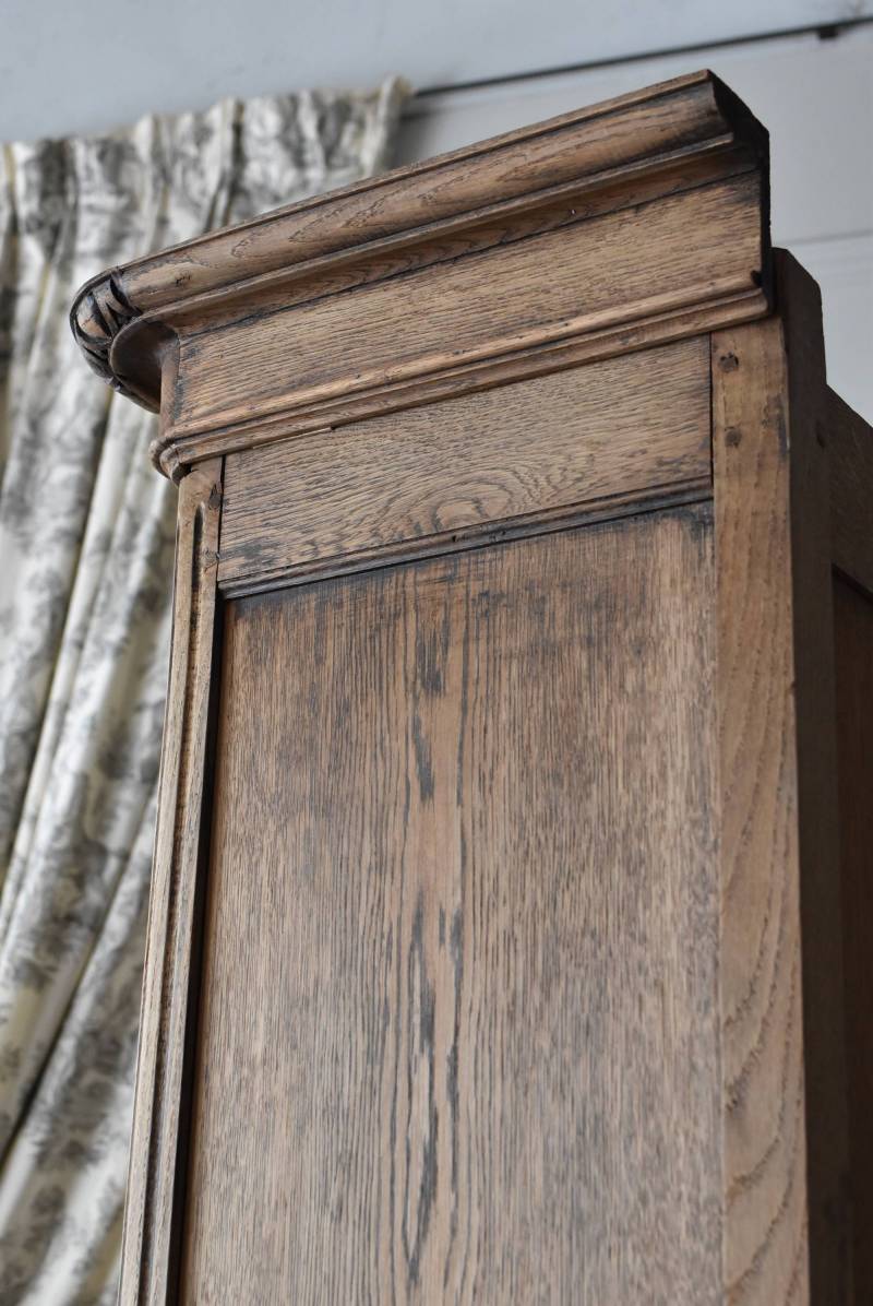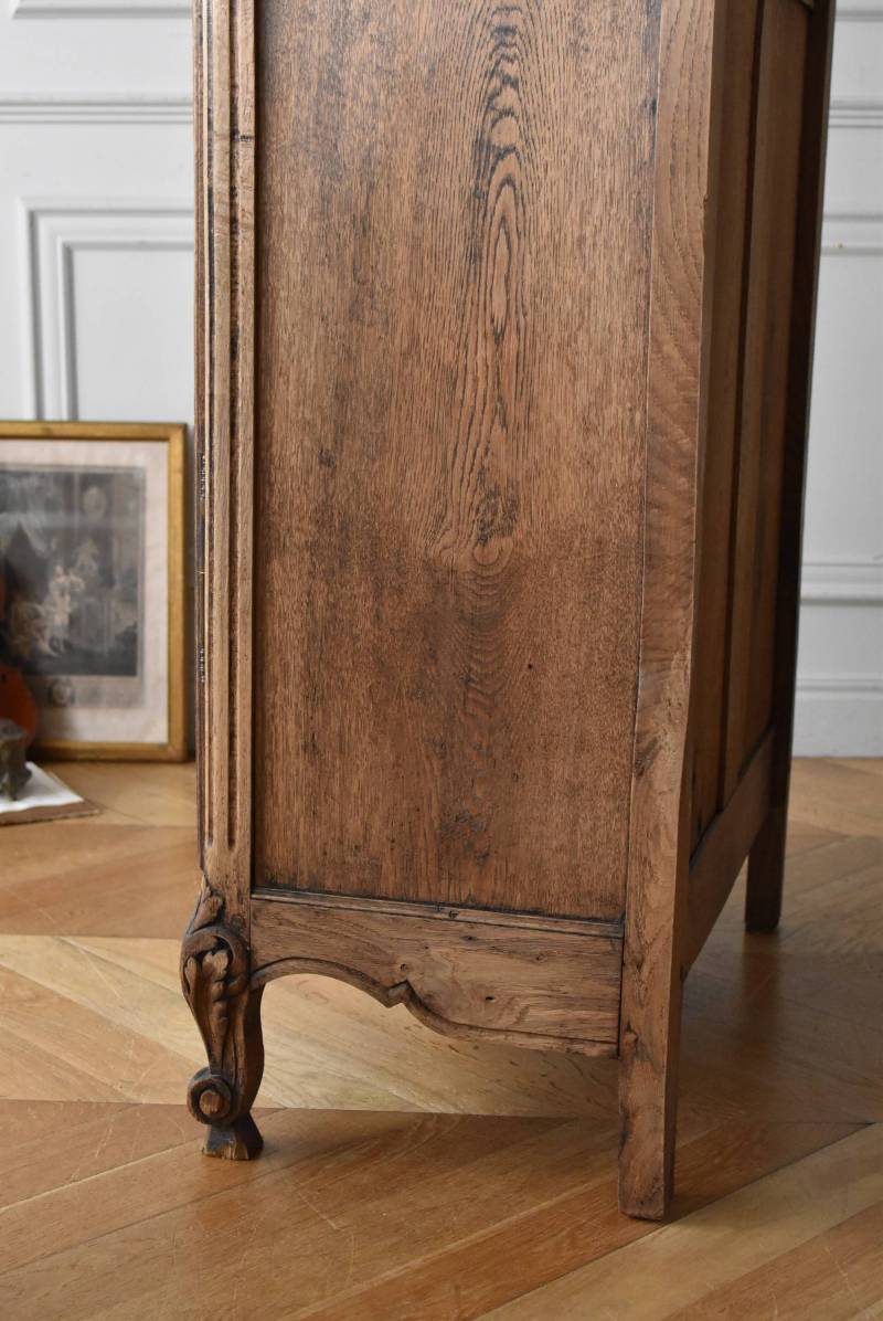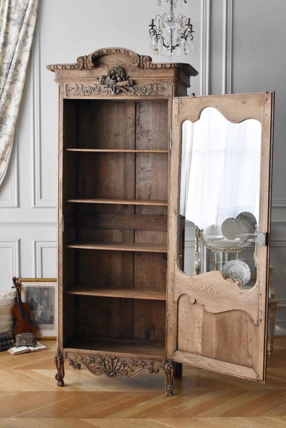 フランス・19世紀後半のアンティークガラスキャビネット。 剥離されたオーク材は素朴ながらも重厚感のある雰囲気が漂い、ガラス周りを流れるような曲線が囲んだ優美な佇まいです。向かいあった小鳥やハープ、植物などのはっきりとした陰影のあるレリーフが豪華に施されており、一つ一つの細工にうっとりさせられるような豊かさが伝わってきます。 上部の装飾は取り外しが出来、はめ込むような構造となっており、ずれ落ちる事はありません。鍵は施錠可能です。棚板の高さ調節は若干ではありますが調整する事が出来、お気に入りの雑貨を並べたり、食器棚としても活躍してくれそうです。 W 約88.5cm D 約45cm H 約208.5cm 棚面積 W約70.5cm×D約30cm 搬入経路について こちらの商品の配送について