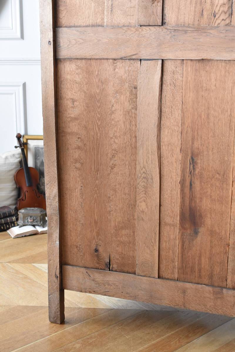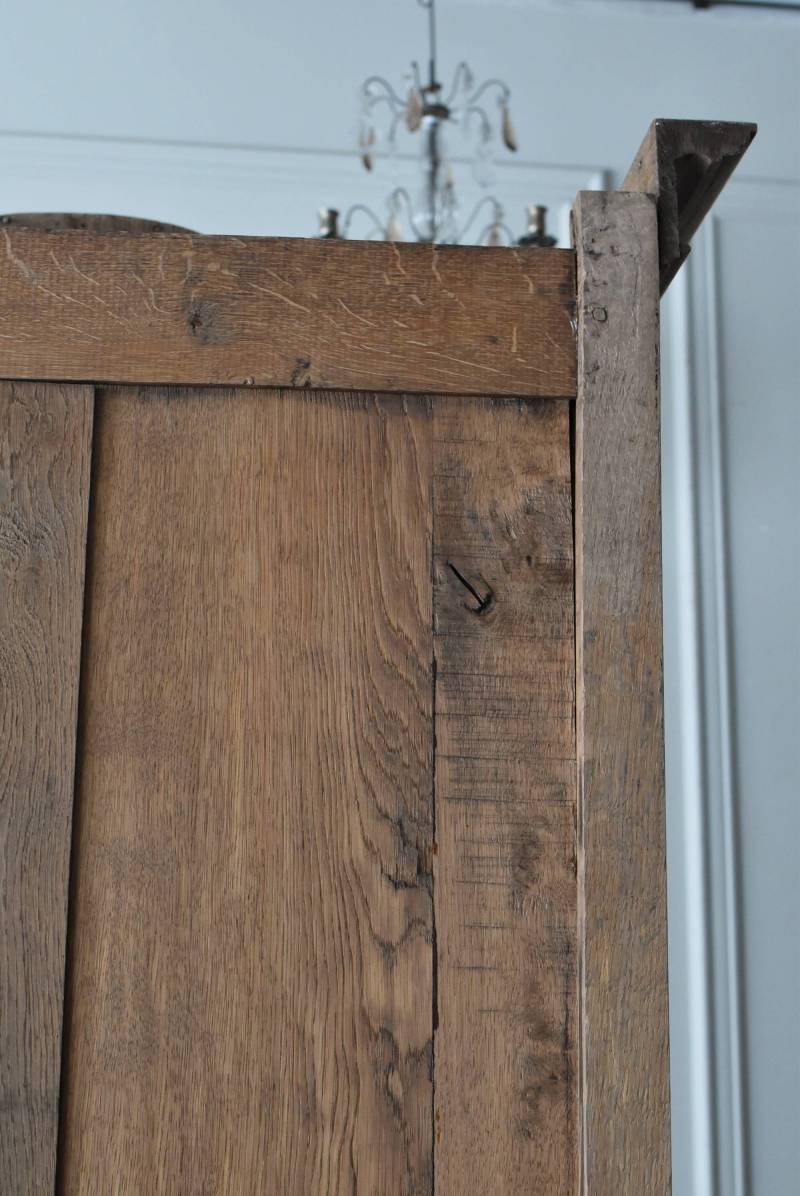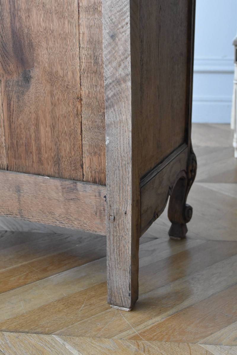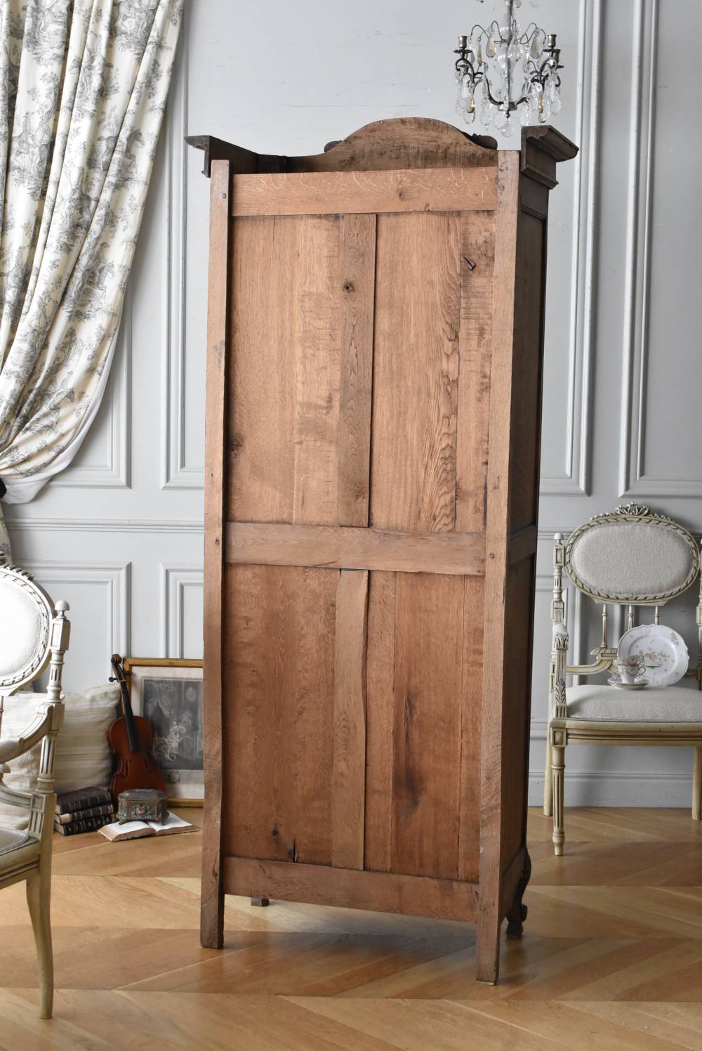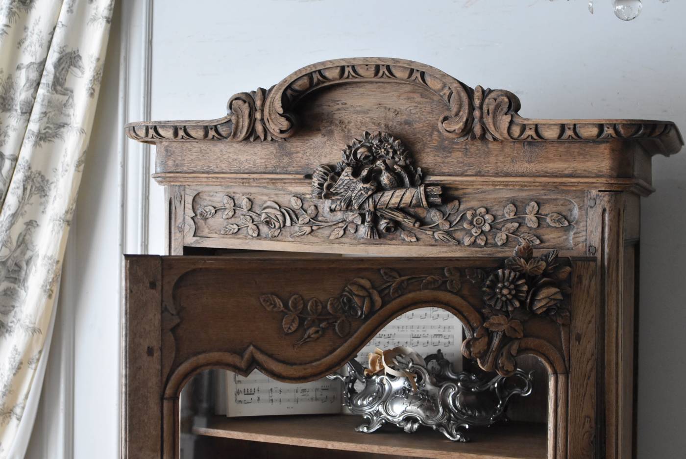 フランス・19世紀後半のアンティークガラスキャビネット。 剥離されたオーク材は素朴ながらも重厚感のある雰囲気が漂い、ガラス周りを流れるような曲線が囲んだ優美な佇まいです。向かいあった小鳥やハープ、植物などのはっきりとした陰影のあるレリーフが豪華に施されており、一つ一つの細工にうっとりさせられるような豊かさが伝わってきます。 上部の装飾は取り外しが出来、はめ込むような構造となっており、ずれ落ちる事はありません。鍵は施錠可能です。棚板の高さ調節は若干ではありますが調整する事が出来、お気に入りの雑貨を並べたり、食器棚としても活躍してくれそうです。 W 約88.5cm D 約45cm H 約208.5cm 棚面積 W約70.5cm×D約30cm 搬入経路について こちらの商品の配送について