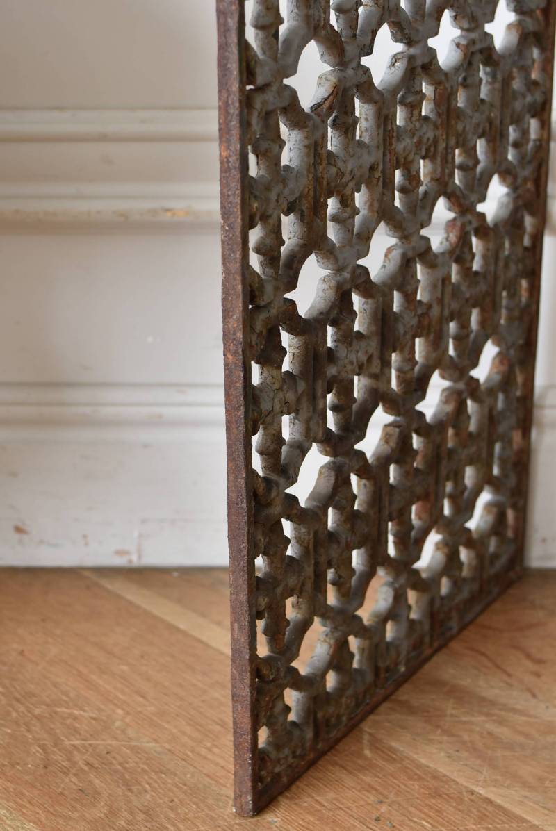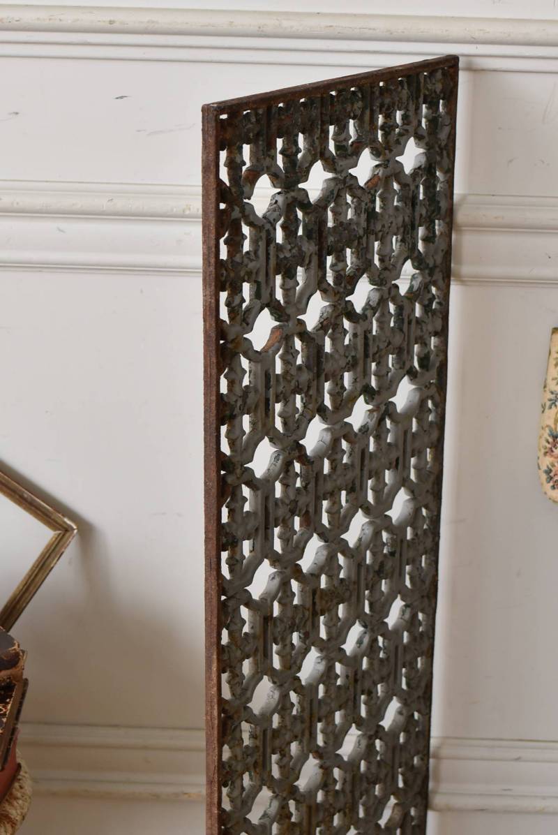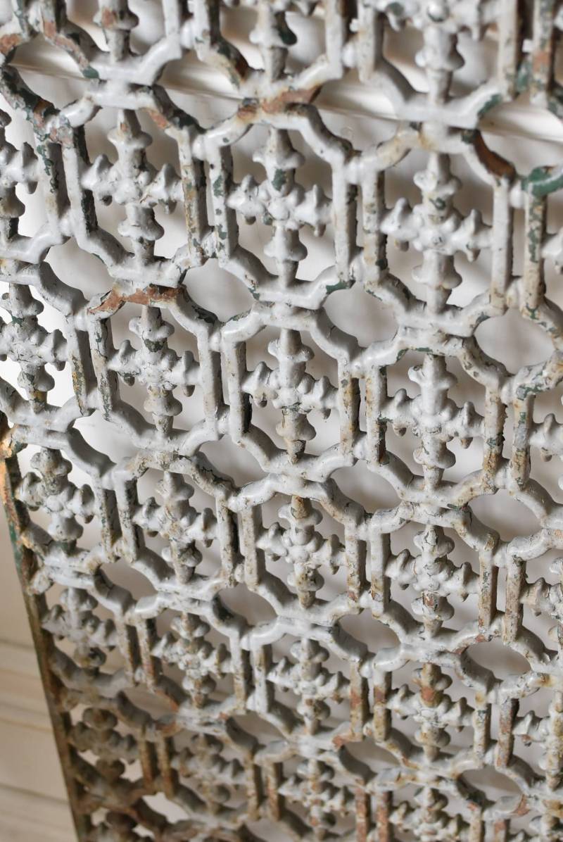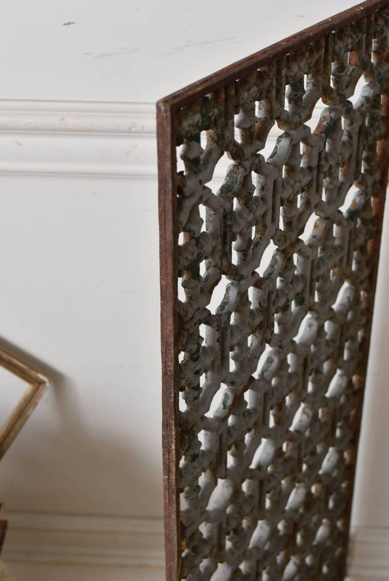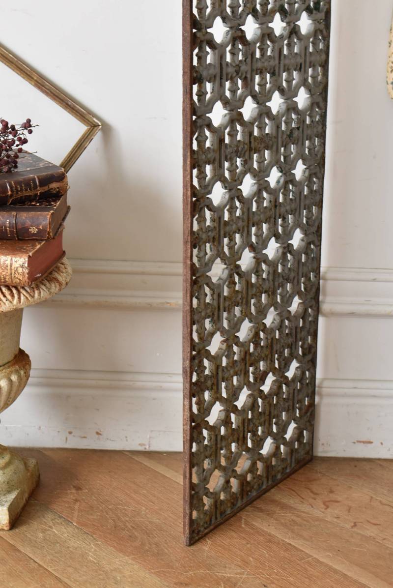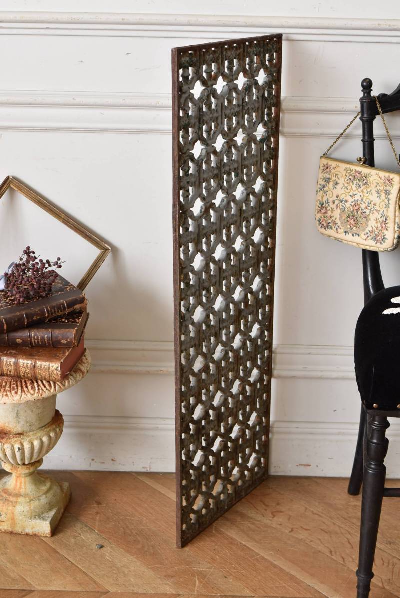 フランスのアイアンパネル。 幾何学的な模様が緻密に連なっており、十字架を連想させるような繊細なデザインによってどこか厳かな雰囲気が漂います。明るいグレーカラーにペイントが剥がれ、錆びた風合いやグリーンの色味が覗かせ、経年による表情豊かな姿が楽しめます。 比較的取り入れやすい大きすぎないサイズ感なので、何気ない壁面に立て掛けているだけでも絵画のような存在感を放ってくれそうです。それぞれでの販売となりますが、同じデザインのアイアンパネル.Bがあります。 W 約31cm D 約1cm H 約91cm 重量 約10kg
