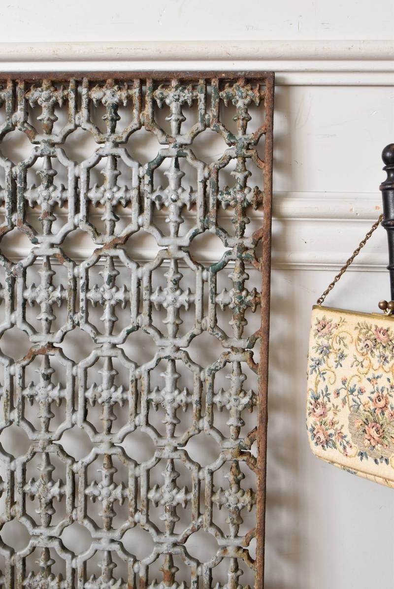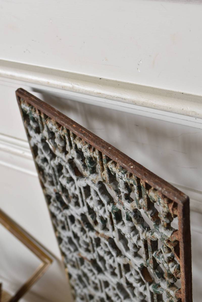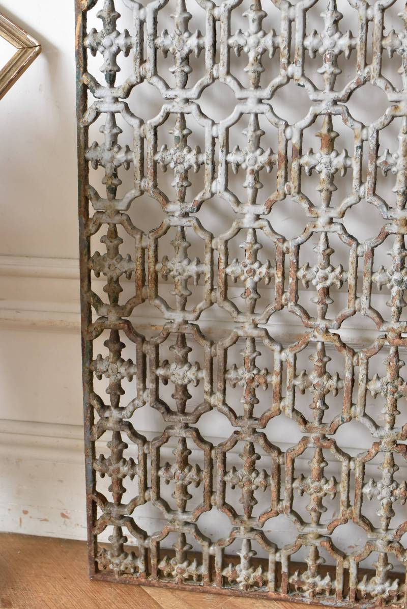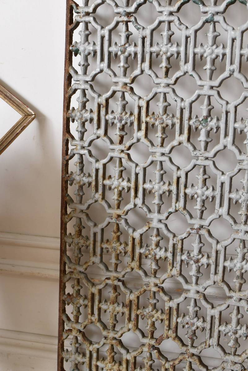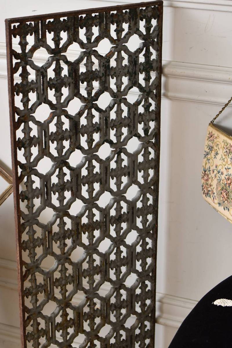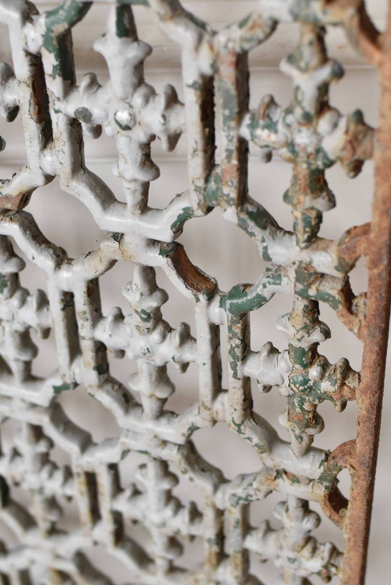 フランスのアイアンパネル。 幾何学的な模様が緻密に連なっており、十字架を連想させるような繊細なデザインによってどこか厳かな雰囲気が漂います。明るいグレーカラーにペイントが剥がれ、錆びた風合いやグリーンの色味が覗かせ、経年による表情豊かな姿が楽しめます。 比較的取り入れやすい大きすぎないサイズ感なので、何気ない壁面に立て掛けているだけでも絵画のような存在感を放ってくれそうです。それぞれでの販売となりますが、同じデザインのアイアンパネル.Bがあります。 W 約31cm D 約1cm H 約91cm 重量 約10kg