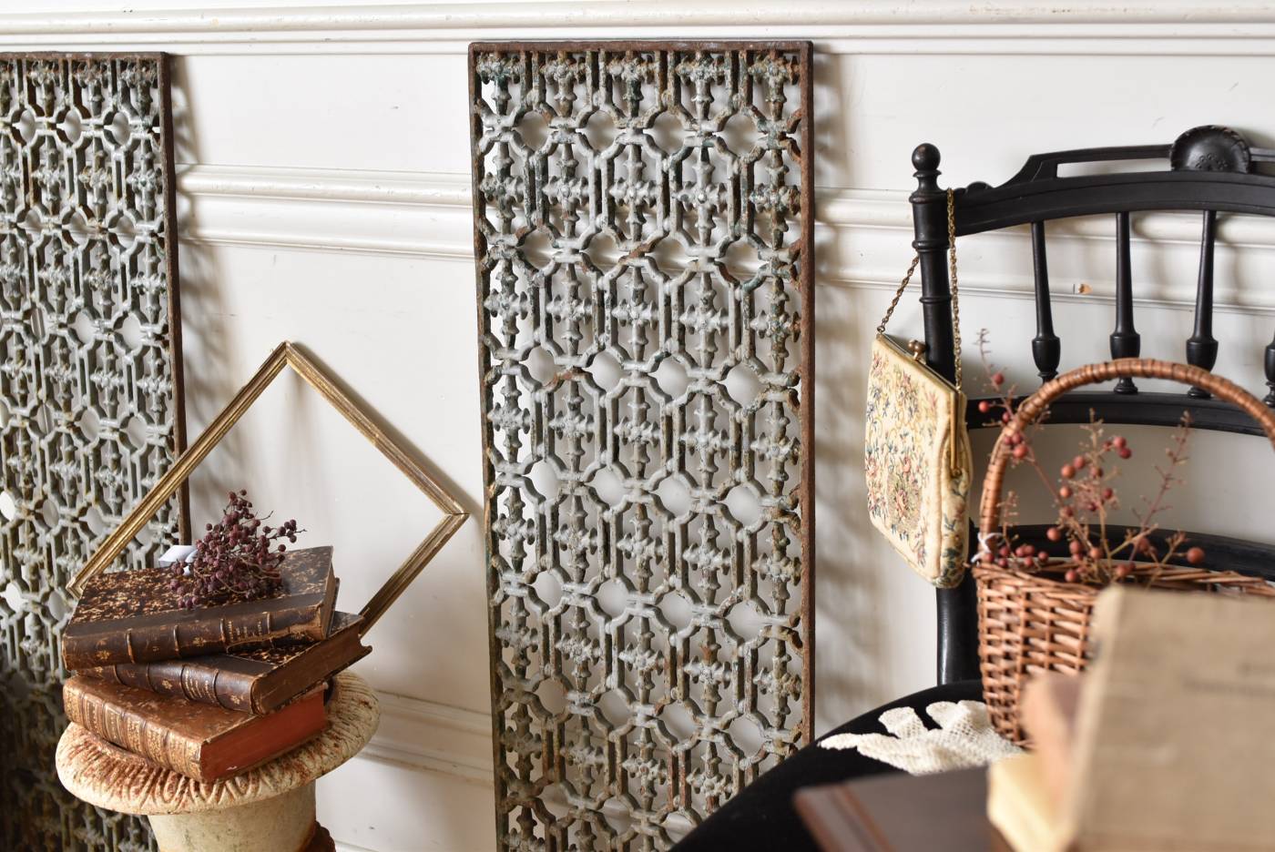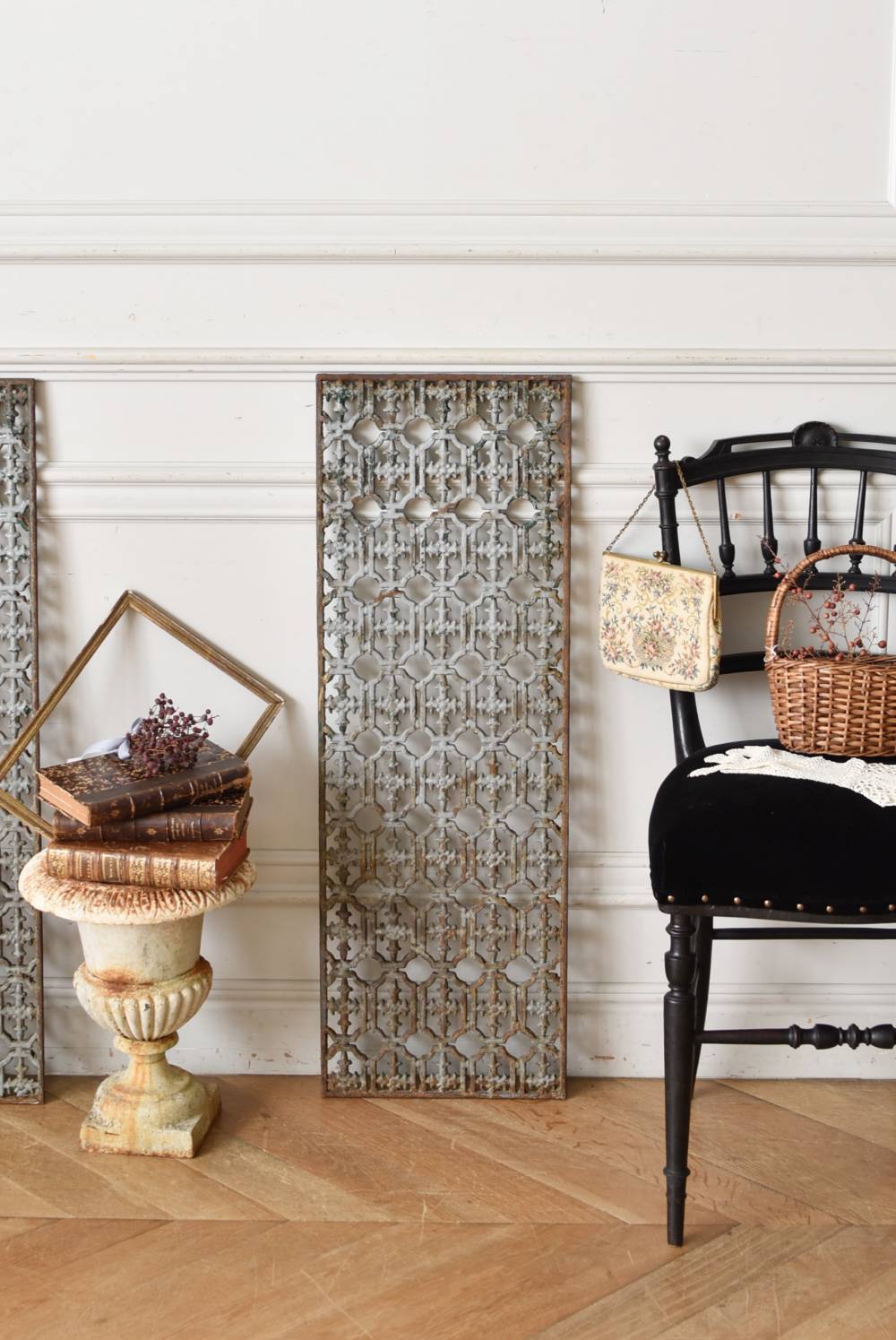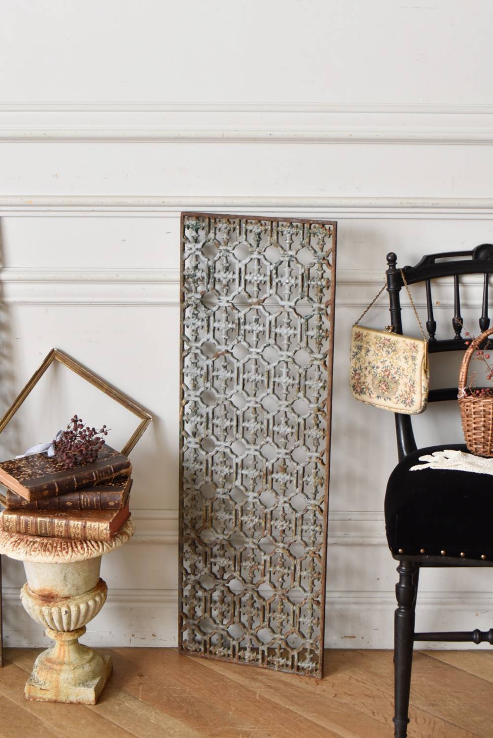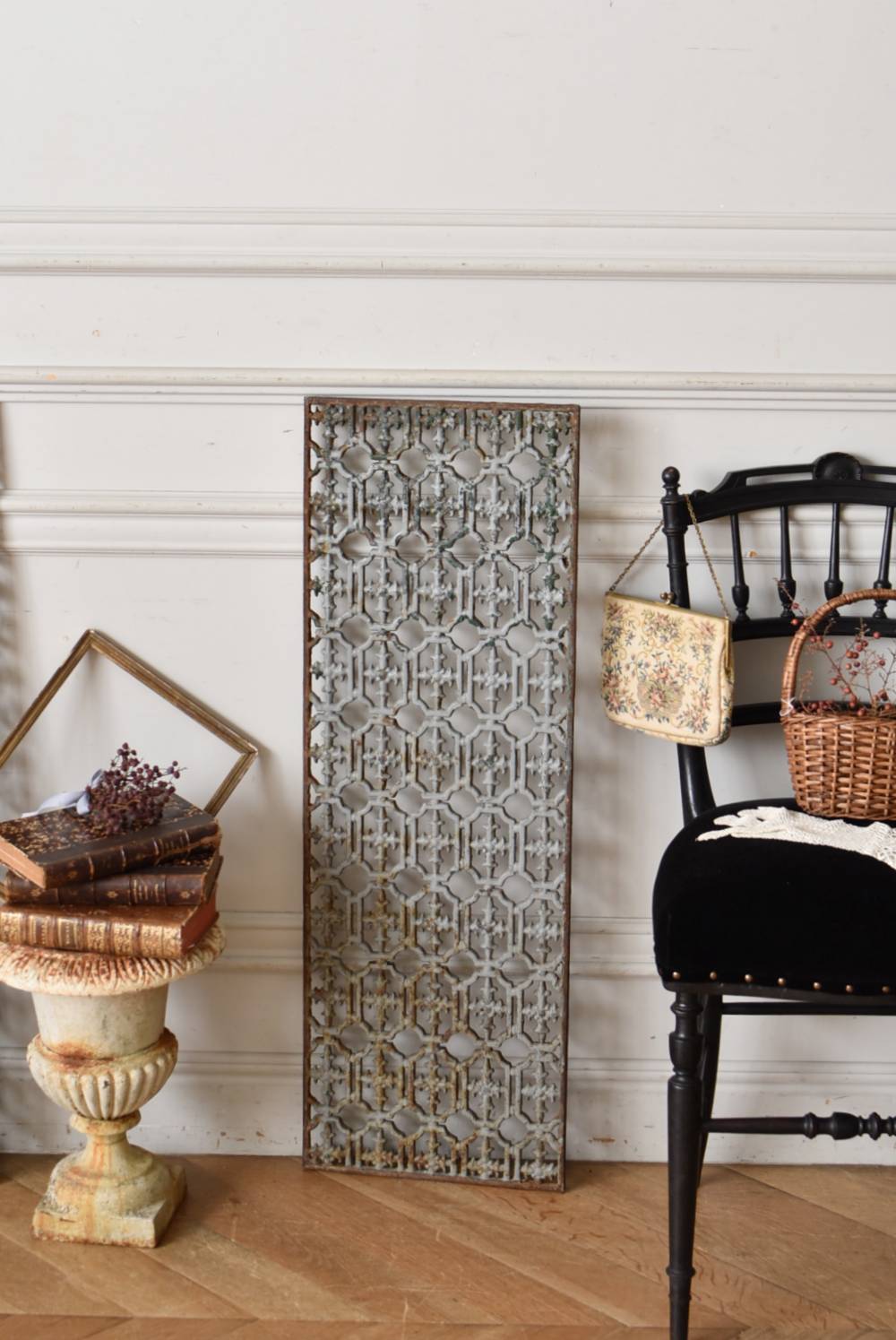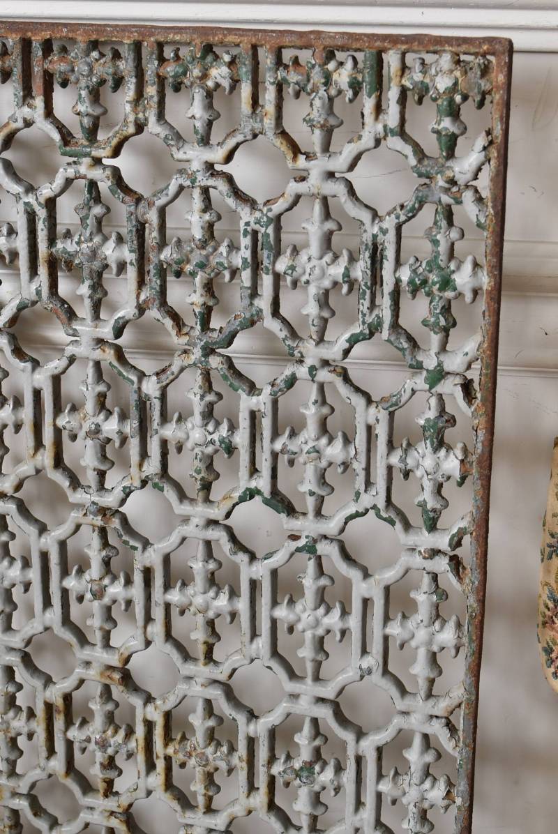 フランスのアイアンパネル。 幾何学的な模様が緻密に連なっており、十字架を連想させるような繊細なデザインによってどこか厳かな雰囲気が漂います。明るいグレーカラーにペイントが剥がれ、錆びた風合いやグリーンの色味が覗かせ、経年による表情豊かな姿が楽しめます。 比較的取り入れやすい大きすぎないサイズ感なので、何気ない壁面に立て掛けているだけでも絵画のような存在感を放ってくれそうです。それぞれでの販売となりますが、同じデザインのアイアンパネル.Bがあります。 W 約31cm D 約1cm H 約91cm 重量 約10kg