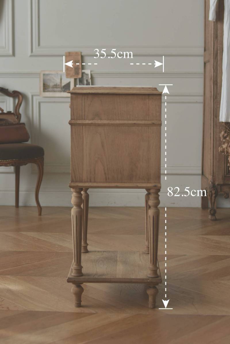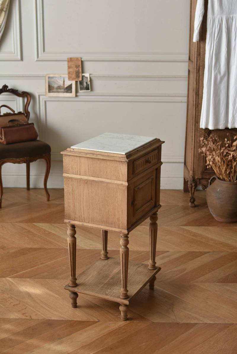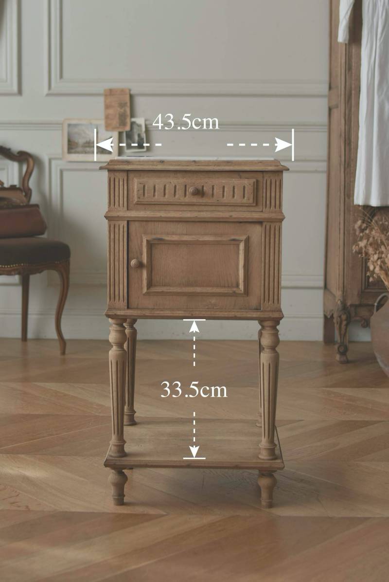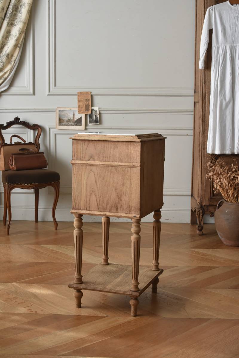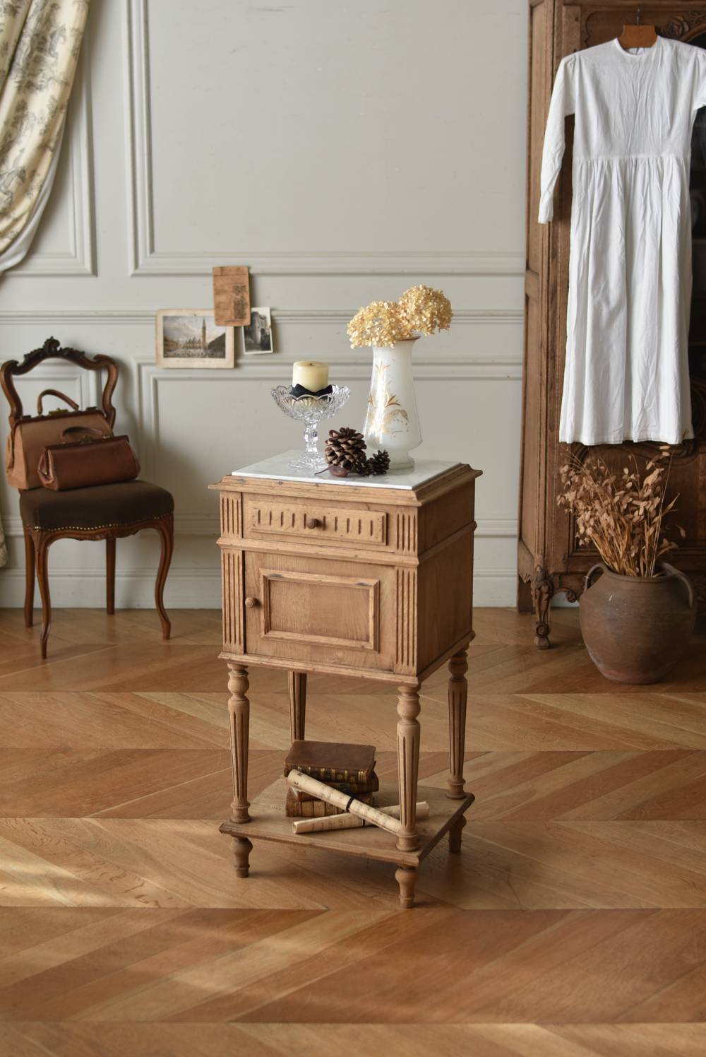 フランスのマーブルトップスモールキャビネット。 剥離されたオーク材の豊かな表情と独自の重厚さが魅力の1つで、明るめの色合いが優しげで温かみのある佇まい。トップにはホワイトを基調としたマーブルストーン(大理石)があしらわれ、素材ならではの高級感と格式高さを楽しませてくれるデザインとなっています。上部には引き出しと扉付きの収納部、下部には棚板が設けられた機能性にも優れた逸品に。 しっかりとした凹凸のあるモールディングやフルーティング(縦溝彫り)、ぷくっと丸みのある脚元が特徴的で、フレンチシックな空間演出に活躍してくれる美しいアイテムです。 W 約43.5cm D 約35.5cm H 約82.5cm 天板(石材部) W約36.5cm×D約27.5cm 引き出し内寸 W約28cm×D約27cm×H約7.5cm 収納部内寸 W約36.5cm×D約27.5cm×H約20.5cm 棚板間隔 約33.5cm こちらの商品の配送について