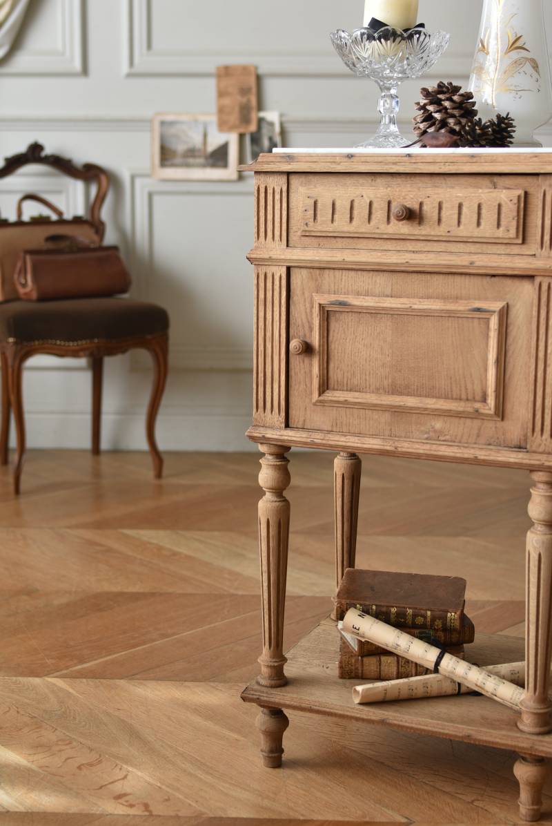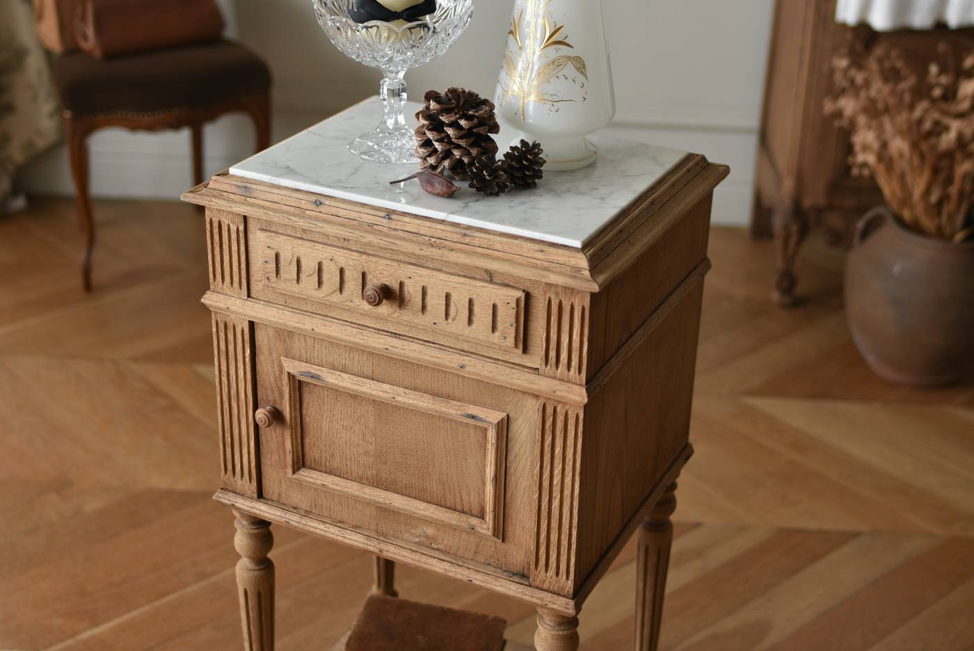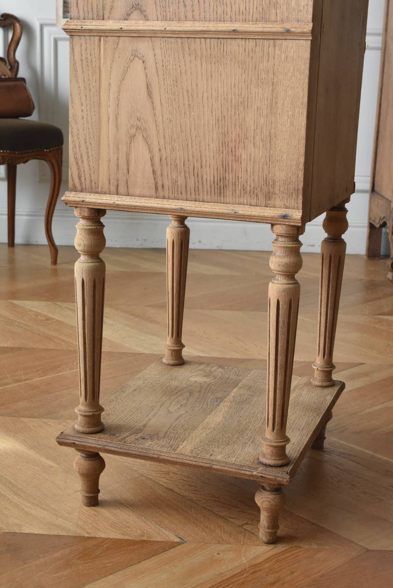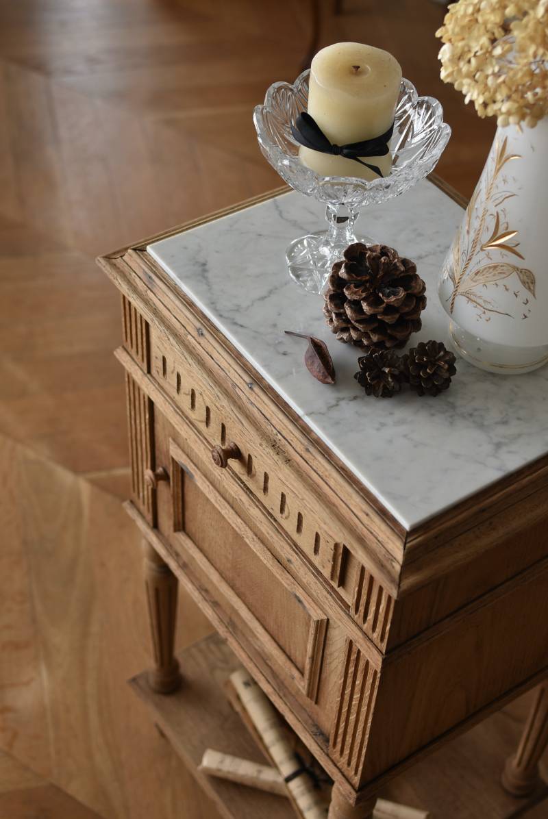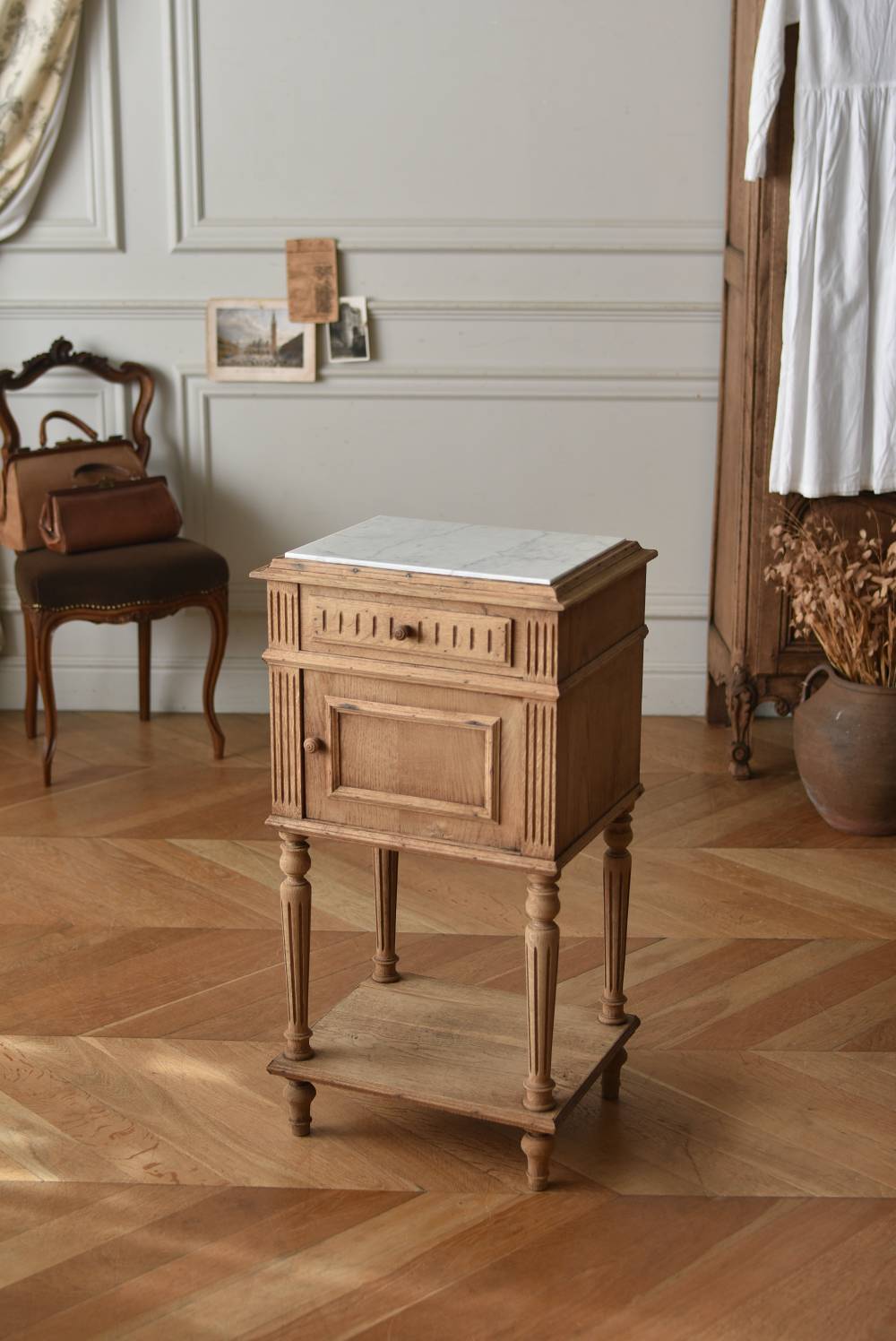 フランスのマーブルトップスモールキャビネット。 剥離されたオーク材の豊かな表情と独自の重厚さが魅力の1つで、明るめの色合いが優しげで温かみのある佇まい。トップにはホワイトを基調としたマーブルストーン(大理石)があしらわれ、素材ならではの高級感と格式高さを楽しませてくれるデザインとなっています。上部には引き出しと扉付きの収納部、下部には棚板が設けられた機能性にも優れた逸品に。 しっかりとした凹凸のあるモールディングやフルーティング(縦溝彫り)、ぷくっと丸みのある脚元が特徴的で、フレンチシックな空間演出に活躍してくれる美しいアイテムです。 W 約43.5cm D 約35.5cm H 約82.5cm 天板(石材部) W約36.5cm×D約27.5cm 引き出し内寸 W約28cm×D約27cm×H約7.5cm 収納部内寸 W約36.5cm×D約27.5cm×H約20.5cm 棚板間隔 約33.5cm こちらの商品の配送について
