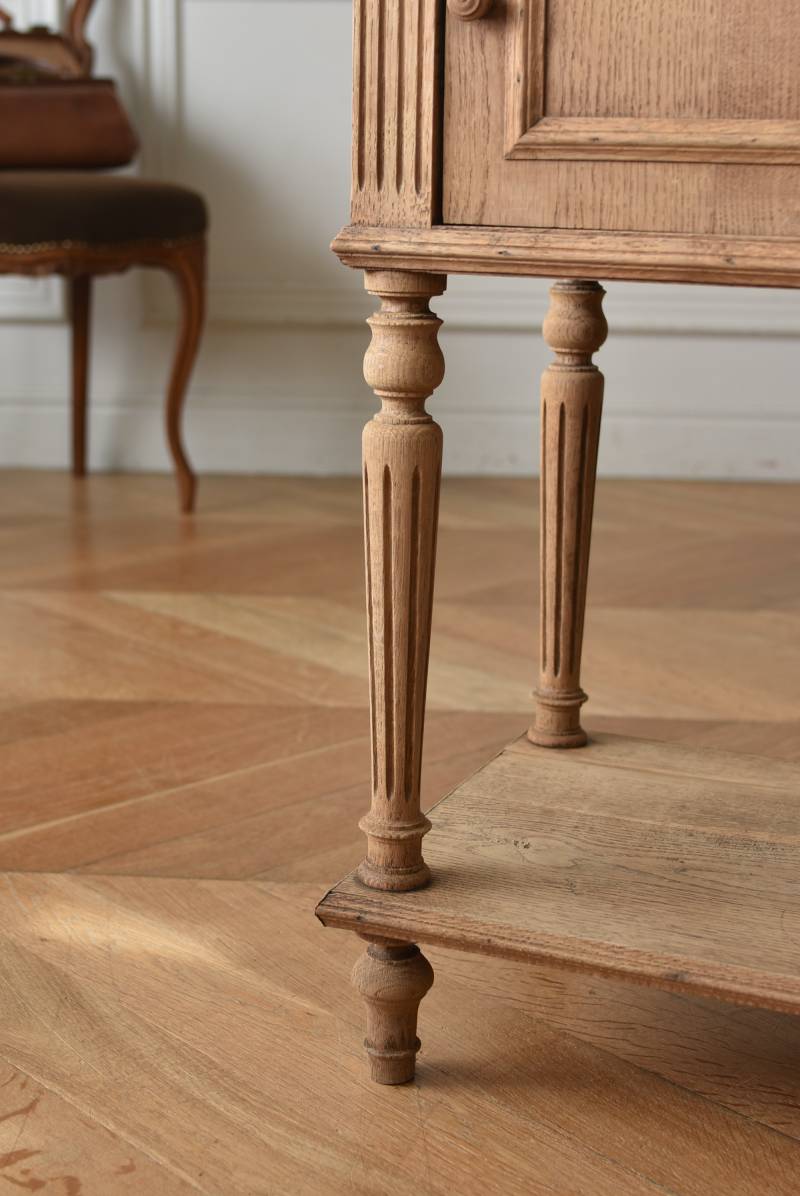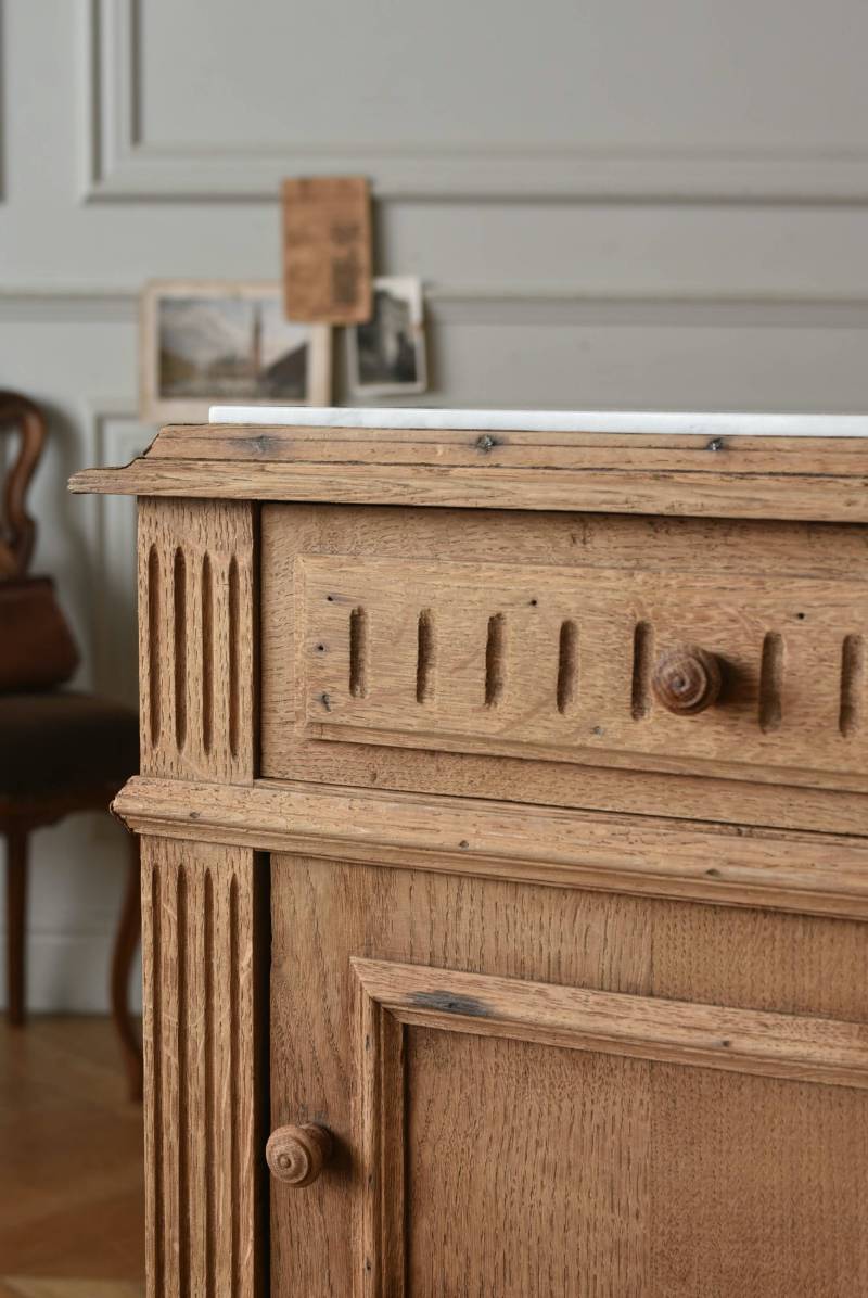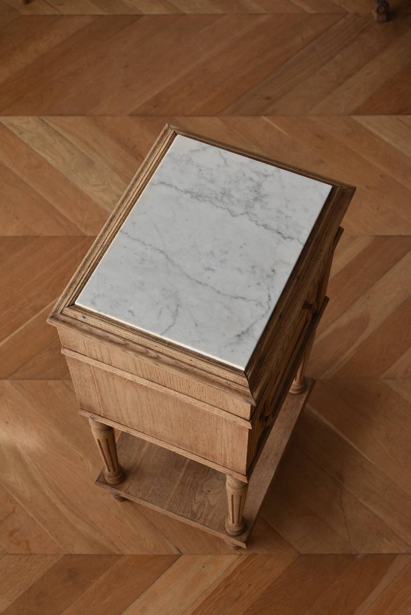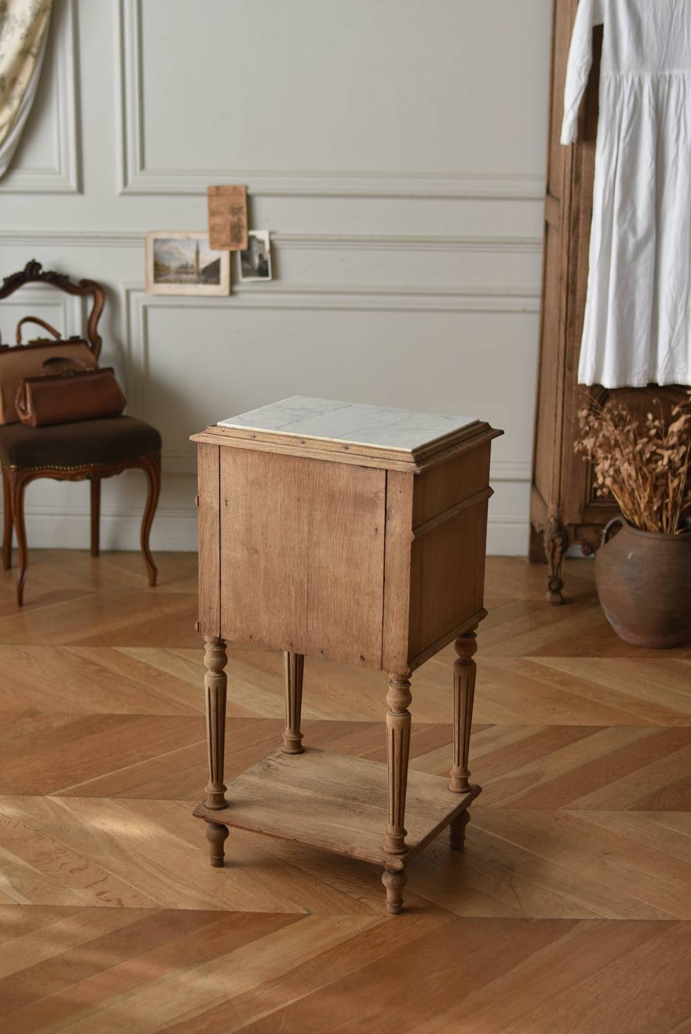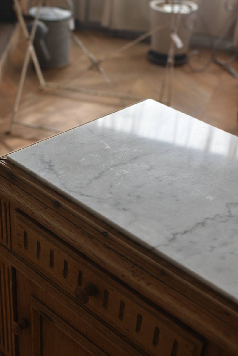 フランスのマーブルトップスモールキャビネット。 剥離されたオーク材の豊かな表情と独自の重厚さが魅力の1つで、明るめの色合いが優しげで温かみのある佇まい。トップにはホワイトを基調としたマーブルストーン(大理石)があしらわれ、素材ならではの高級感と格式高さを楽しませてくれるデザインとなっています。上部には引き出しと扉付きの収納部、下部には棚板が設けられた機能性にも優れた逸品に。 しっかりとした凹凸のあるモールディングやフルーティング(縦溝彫り)、ぷくっと丸みのある脚元が特徴的で、フレンチシックな空間演出に活躍してくれる美しいアイテムです。 W 約43.5cm D 約35.5cm H 約82.5cm 天板(石材部) W約36.5cm×D約27.5cm 引き出し内寸 W約28cm×D約27cm×H約7.5cm 収納部内寸 W約36.5cm×D約27.5cm×H約20.5cm 棚板間隔 約33.5cm こちらの商品の配送について