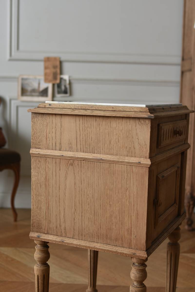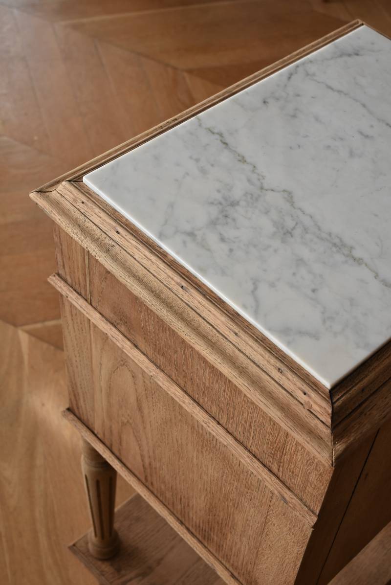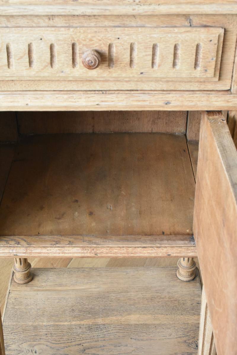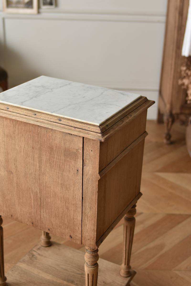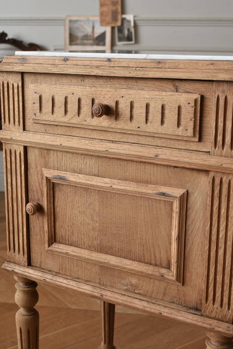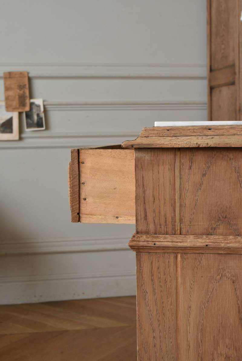 フランスのマーブルトップスモールキャビネット。 剥離されたオーク材の豊かな表情と独自の重厚さが魅力の1つで、明るめの色合いが優しげで温かみのある佇まい。トップにはホワイトを基調としたマーブルストーン(大理石)があしらわれ、素材ならではの高級感と格式高さを楽しませてくれるデザインとなっています。上部には引き出しと扉付きの収納部、下部には棚板が設けられた機能性にも優れた逸品に。 しっかりとした凹凸のあるモールディングやフルーティング(縦溝彫り)、ぷくっと丸みのある脚元が特徴的で、フレンチシックな空間演出に活躍してくれる美しいアイテムです。 W 約43.5cm D 約35.5cm H 約82.5cm 天板(石材部) W約36.5cm×D約27.5cm 引き出し内寸 W約28cm×D約27cm×H約7.5cm 収納部内寸 W約36.5cm×D約27.5cm×H約20.5cm 棚板間隔 約33.5cm こちらの商品の配送について