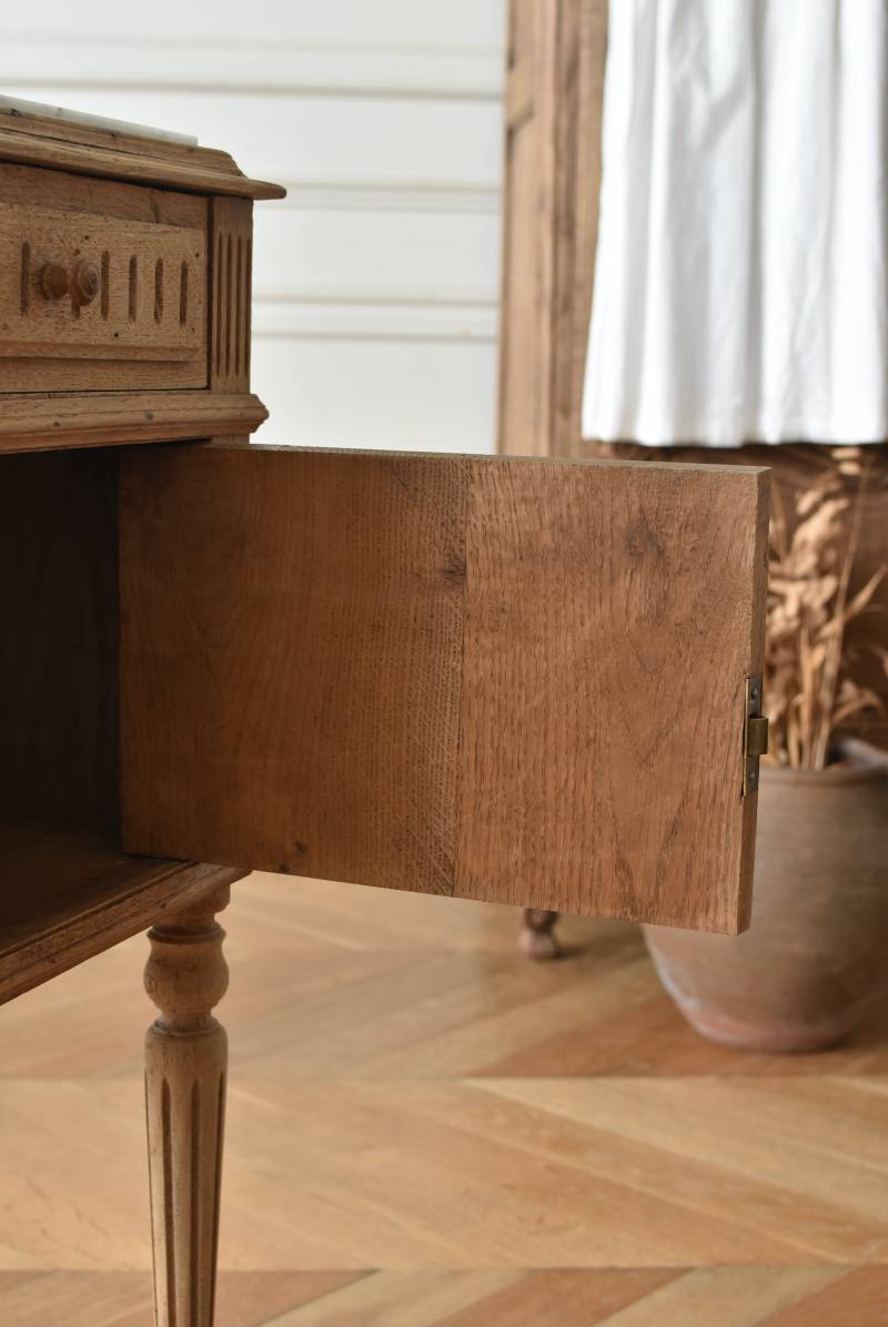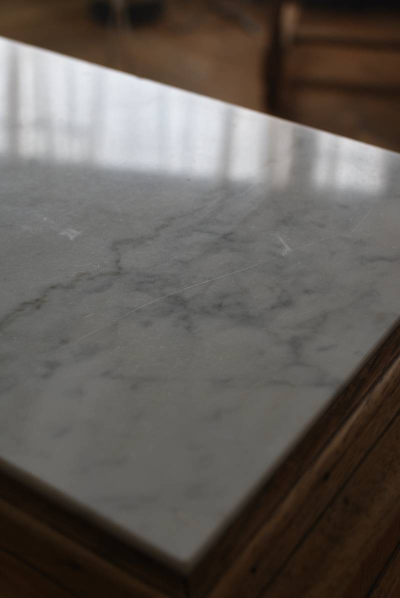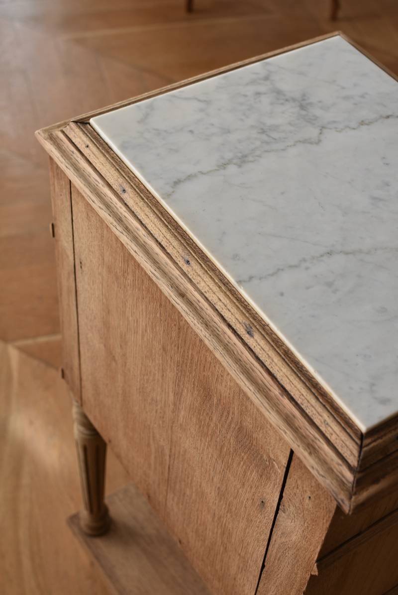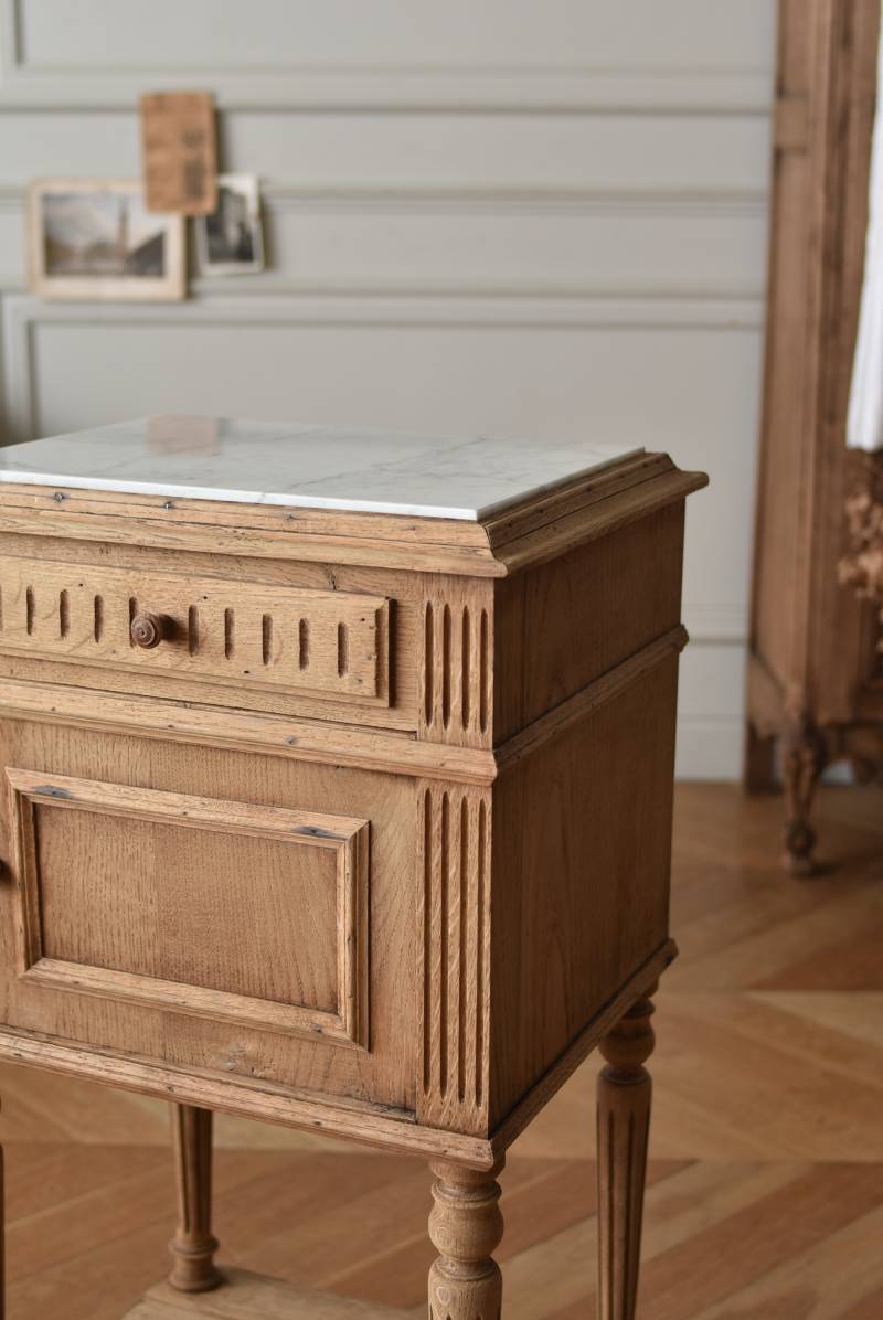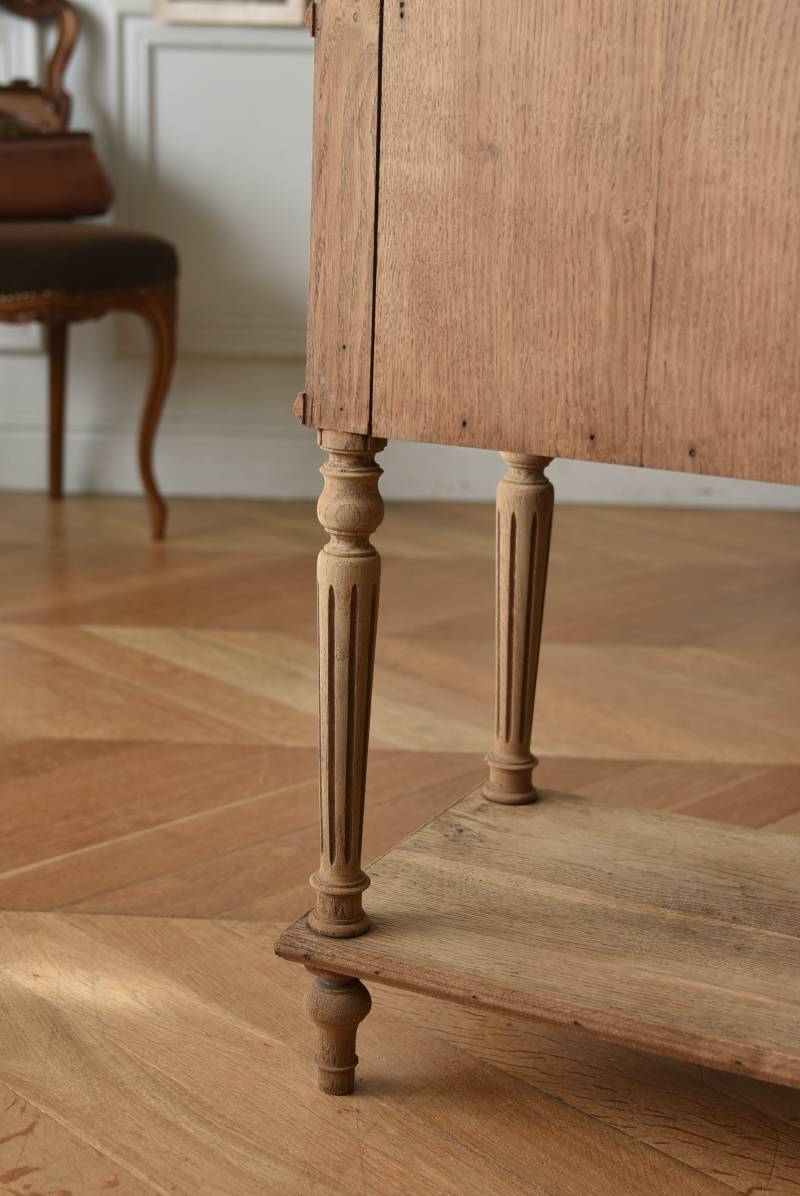 フランスのマーブルトップスモールキャビネット。 剥離されたオーク材の豊かな表情と独自の重厚さが魅力の1つで、明るめの色合いが優しげで温かみのある佇まい。トップにはホワイトを基調としたマーブルストーン(大理石)があしらわれ、素材ならではの高級感と格式高さを楽しませてくれるデザインとなっています。上部には引き出しと扉付きの収納部、下部には棚板が設けられた機能性にも優れた逸品に。 しっかりとした凹凸のあるモールディングやフルーティング(縦溝彫り)、ぷくっと丸みのある脚元が特徴的で、フレンチシックな空間演出に活躍してくれる美しいアイテムです。 W 約43.5cm D 約35.5cm H 約82.5cm 天板(石材部) W約36.5cm×D約27.5cm 引き出し内寸 W約28cm×D約27cm×H約7.5cm 収納部内寸 W約36.5cm×D約27.5cm×H約20.5cm 棚板間隔 約33.5cm こちらの商品の配送について