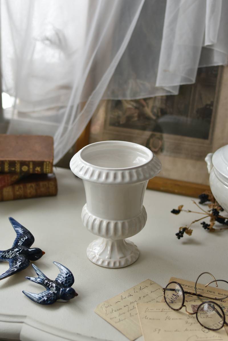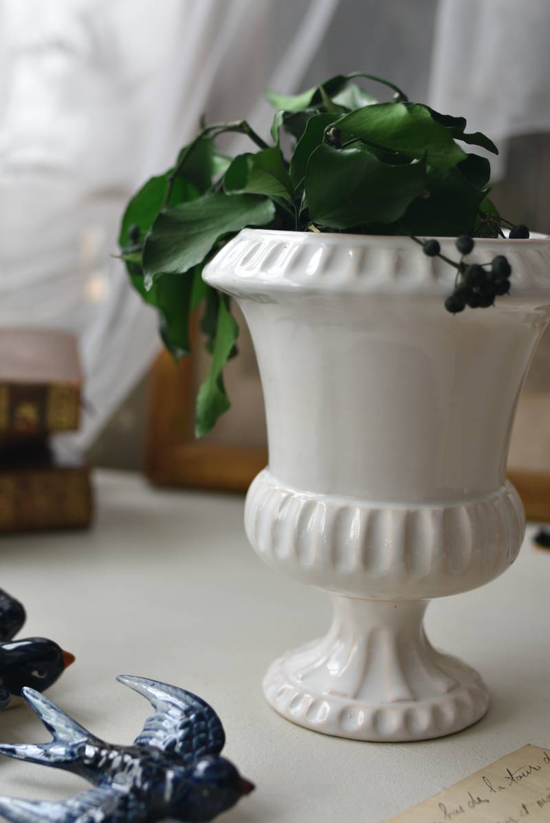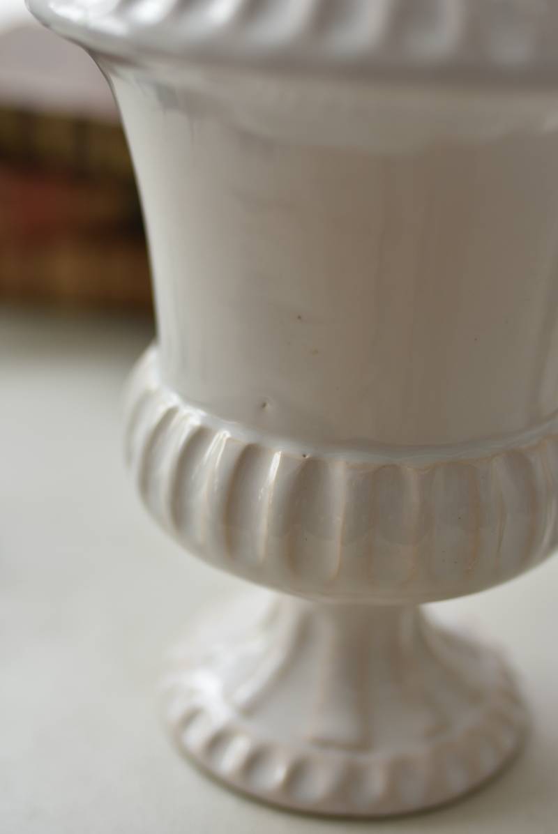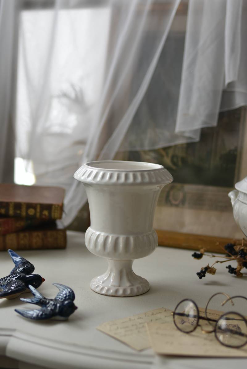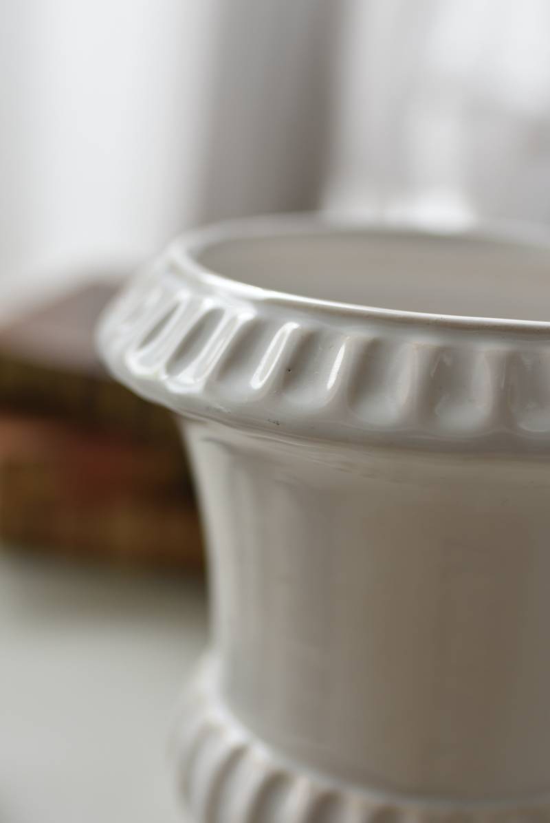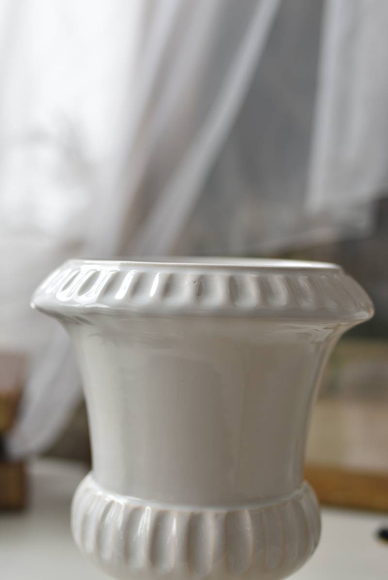 フランスのメディシス。 艶やかな白の釉薬がとろりとかけられ、ほんのり地色が覗く唯一無二の表情が魅力的。ふわりと広がった口元にきゅっとくびれのある脚元の特徴的なシルエットが優美な印象で、フランスらしいエレガントな空間演出に活躍してくれます。表面に施されたシンプルな凹凸模様が独自の雰囲気を漂わせてくれる逸品に。 小さめの鉢を入れて華やかに彩る鉢カバーとしてはもちろん、雑貨などを入れて飾るディスプレイアイテムとしてもおすすめのアイテムです。 直径 約15cm H 約18.5cm 深さ 約14.5cm 口径 約10.5cm