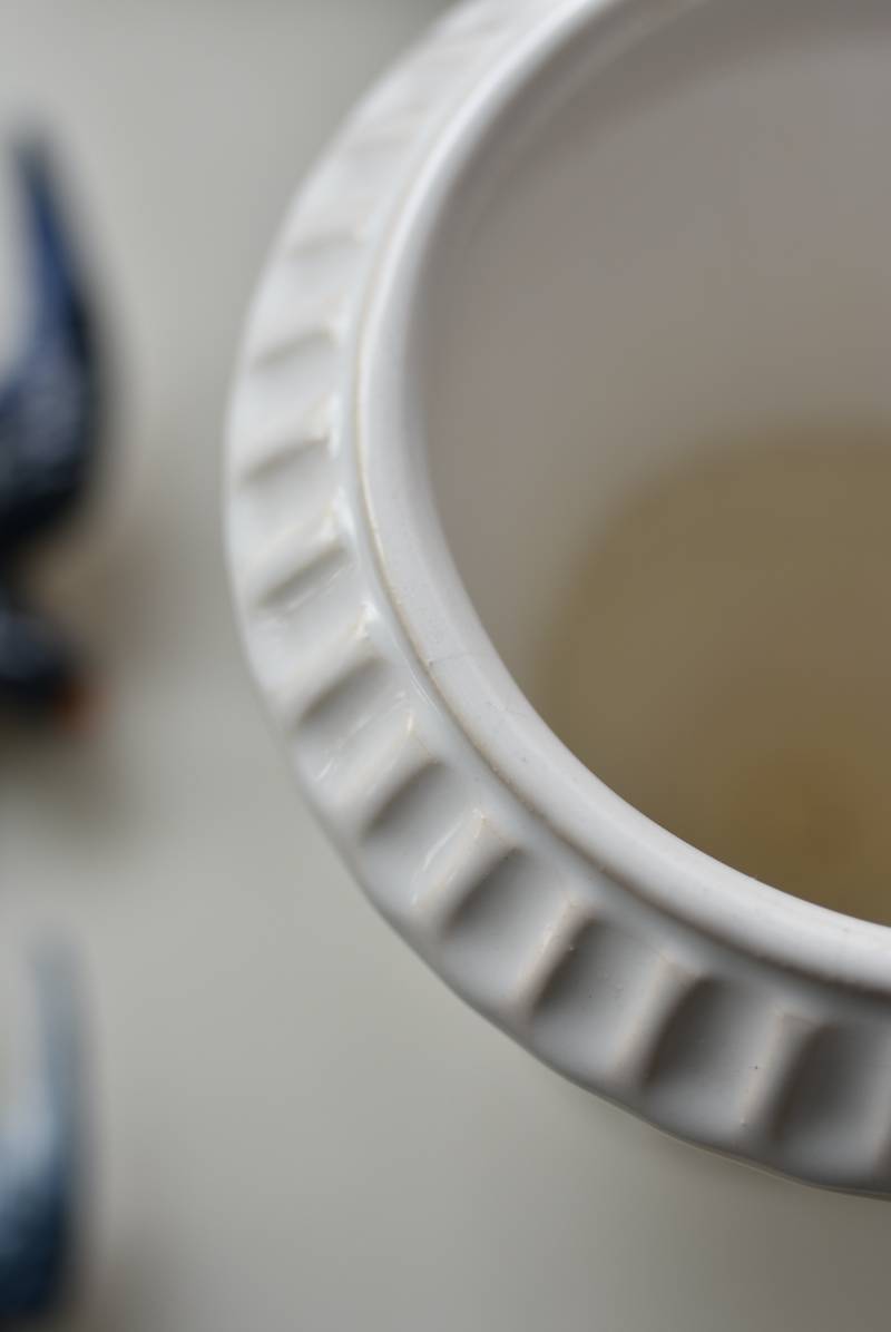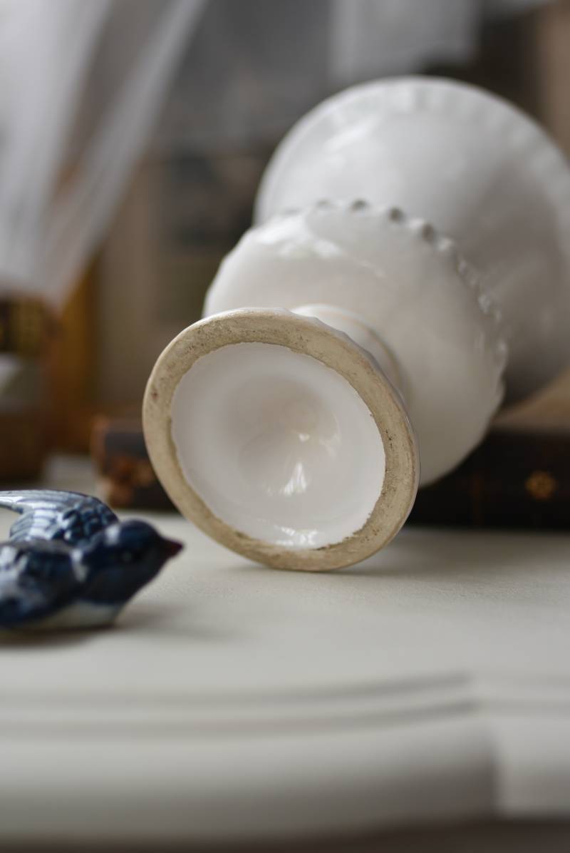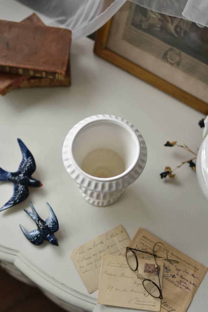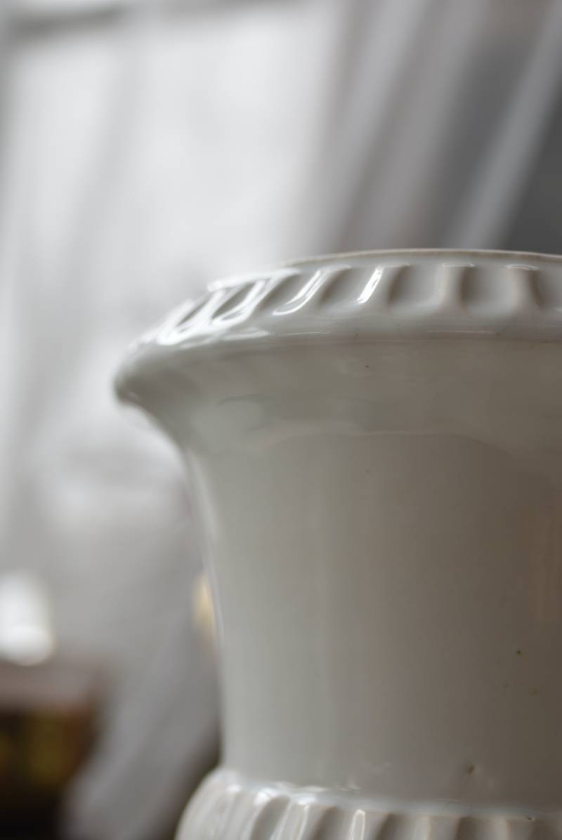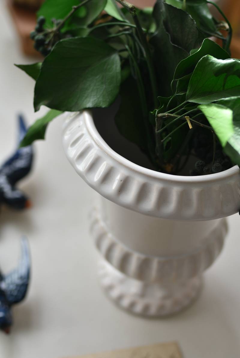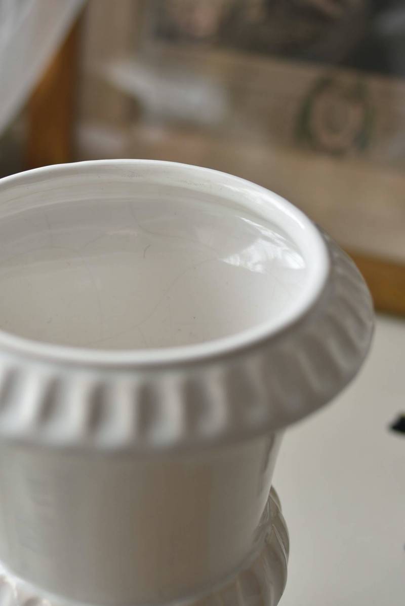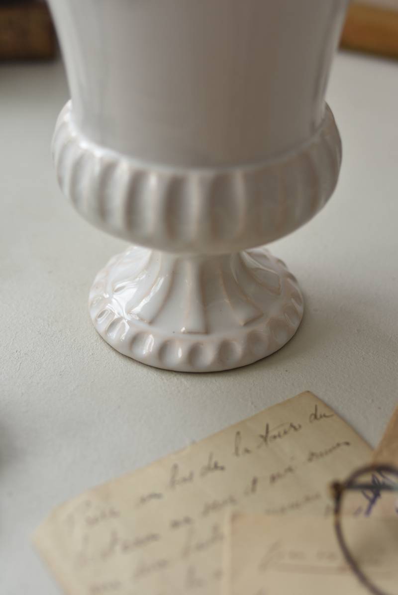 フランスのメディシス。 艶やかな白の釉薬がとろりとかけられ、ほんのり地色が覗く唯一無二の表情が魅力的。ふわりと広がった口元にきゅっとくびれのある脚元の特徴的なシルエットが優美な印象で、フランスらしいエレガントな空間演出に活躍してくれます。表面に施されたシンプルな凹凸模様が独自の雰囲気を漂わせてくれる逸品に。 小さめの鉢を入れて華やかに彩る鉢カバーとしてはもちろん、雑貨などを入れて飾るディスプレイアイテムとしてもおすすめのアイテムです。 直径 約15cm H 約18.5cm 深さ 約14.5cm 口径 約10.5cm