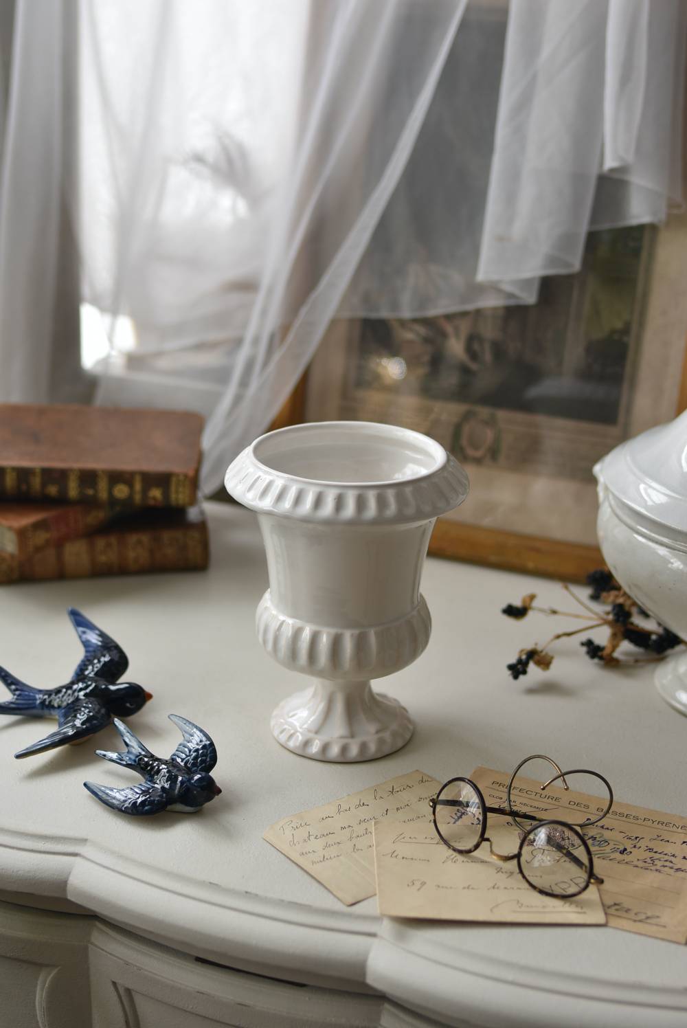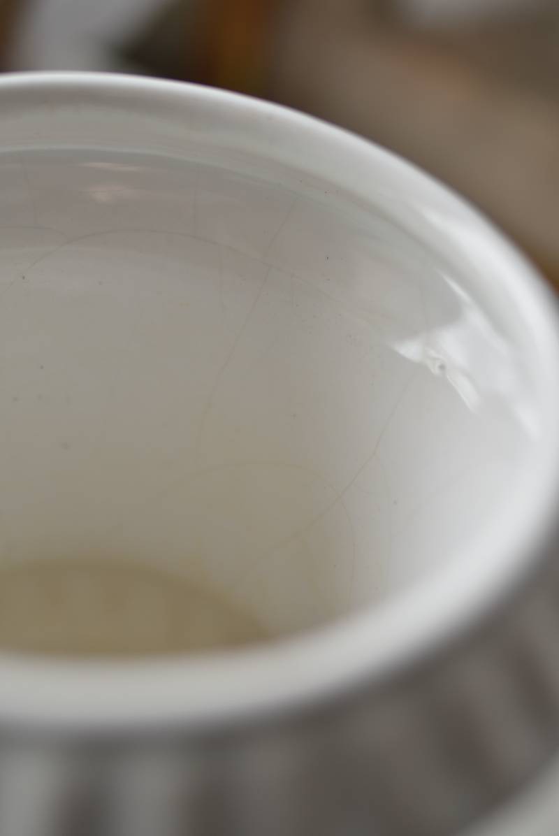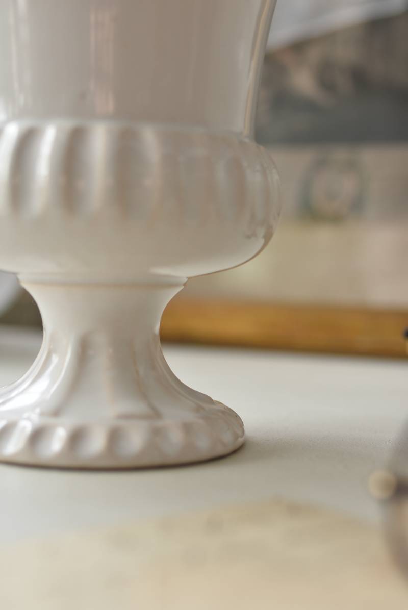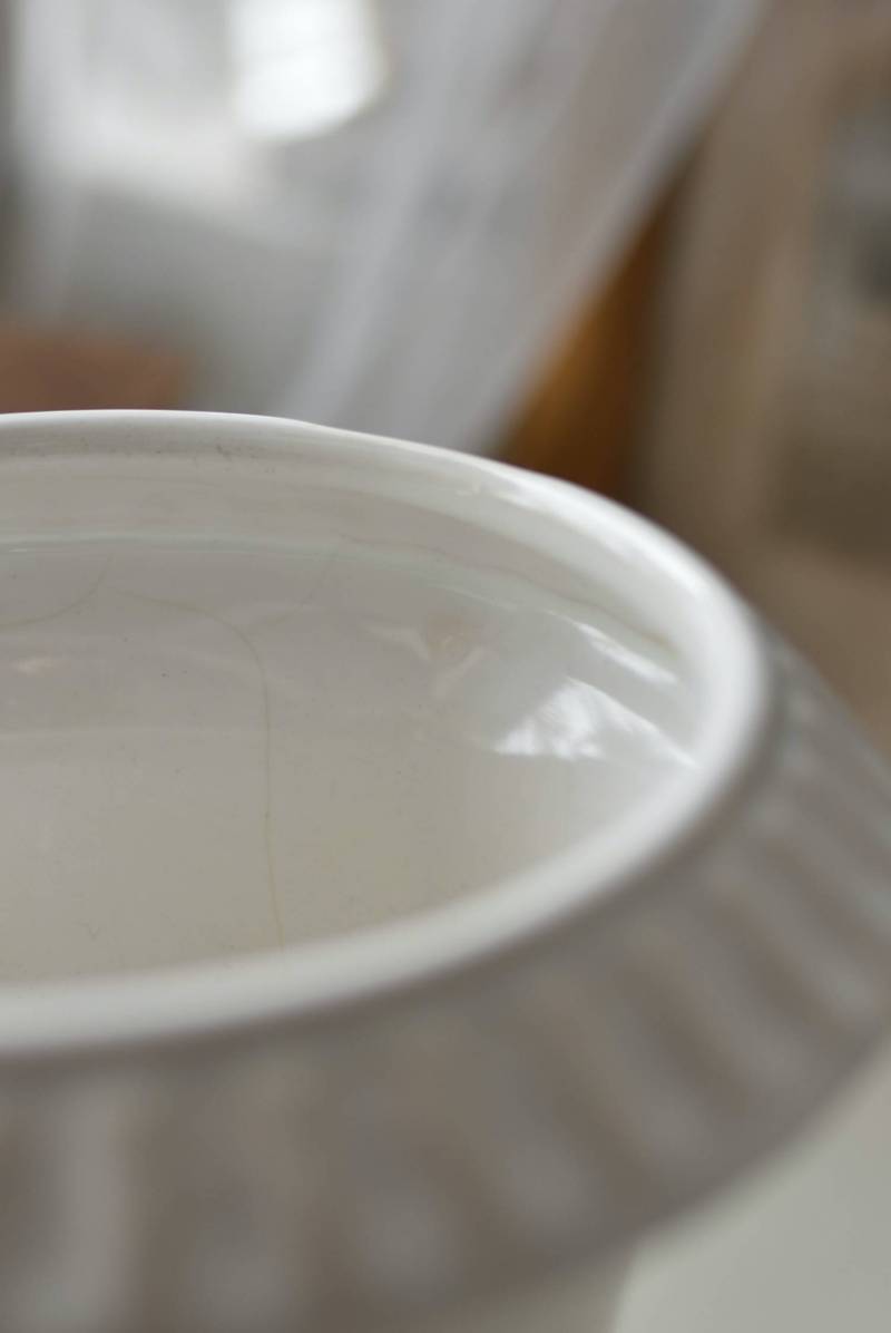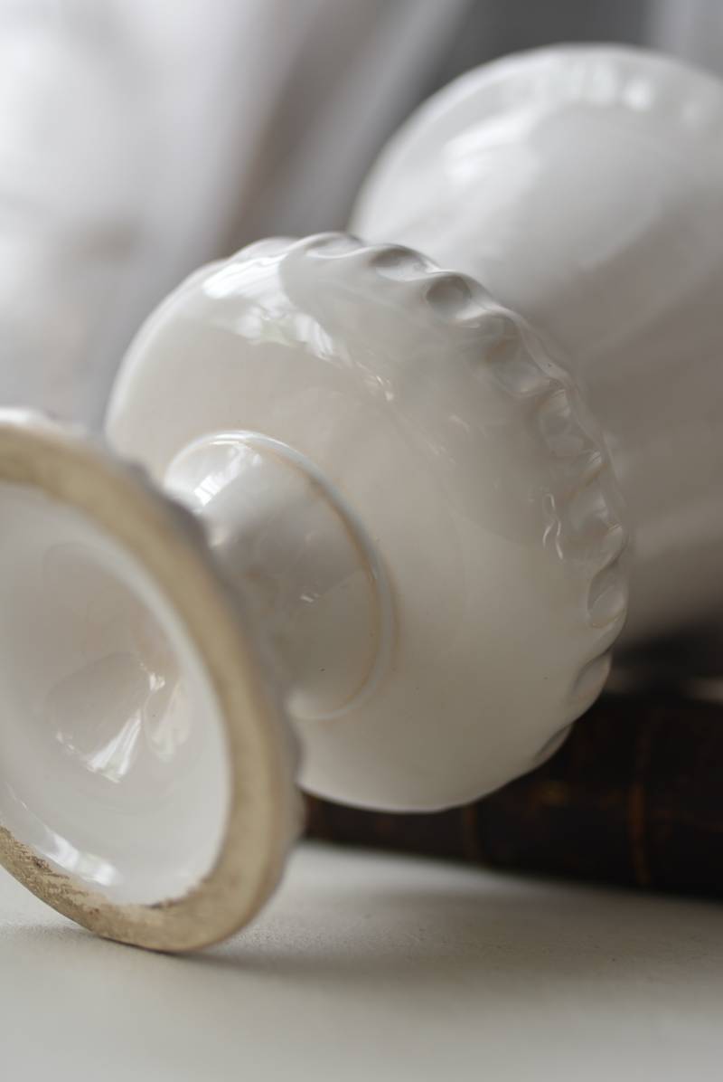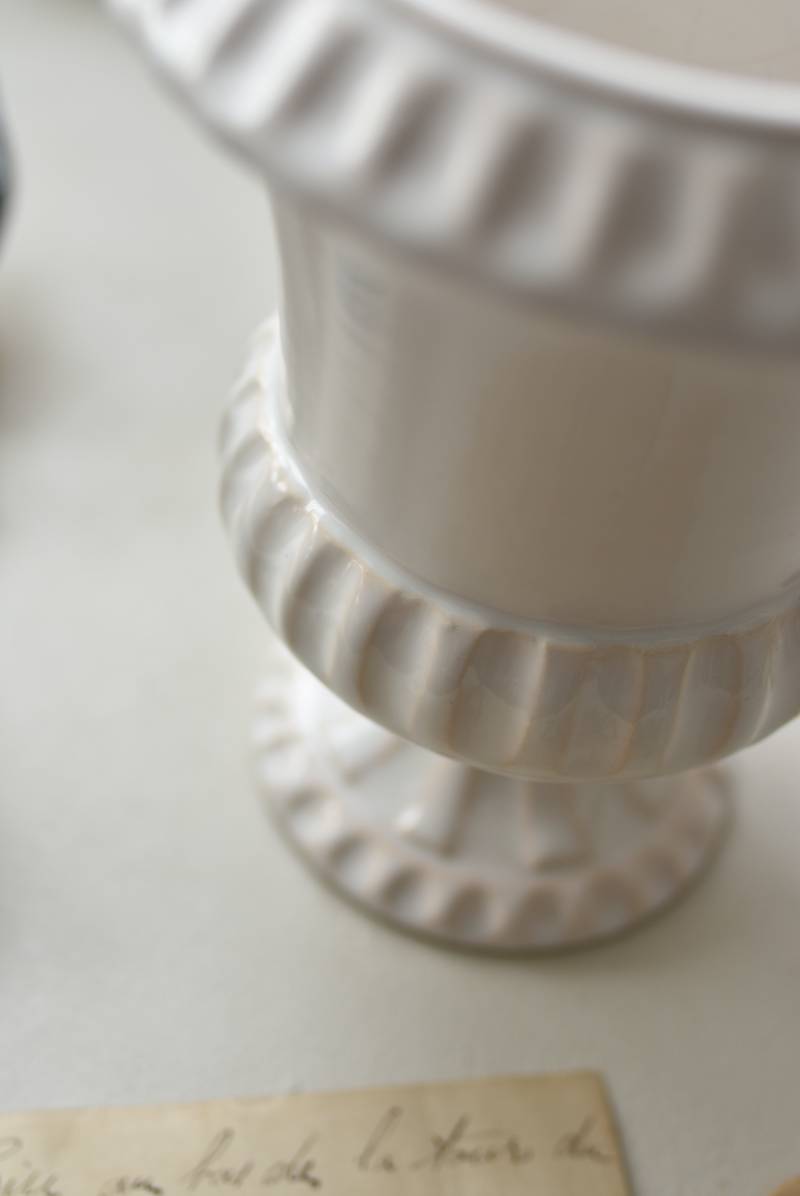 フランスのメディシス。 艶やかな白の釉薬がとろりとかけられ、ほんのり地色が覗く唯一無二の表情が魅力的。ふわりと広がった口元にきゅっとくびれのある脚元の特徴的なシルエットが優美な印象で、フランスらしいエレガントな空間演出に活躍してくれます。表面に施されたシンプルな凹凸模様が独自の雰囲気を漂わせてくれる逸品に。 小さめの鉢を入れて華やかに彩る鉢カバーとしてはもちろん、雑貨などを入れて飾るディスプレイアイテムとしてもおすすめのアイテムです。 直径 約15cm H 約18.5cm 深さ 約14.5cm 口径 約10.5cm