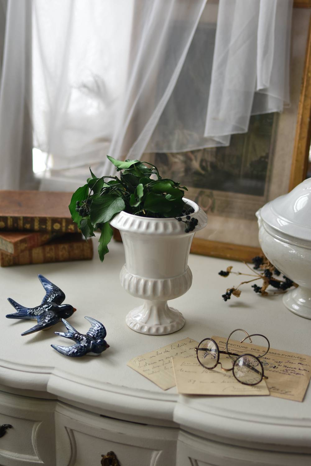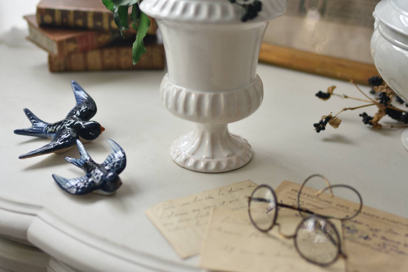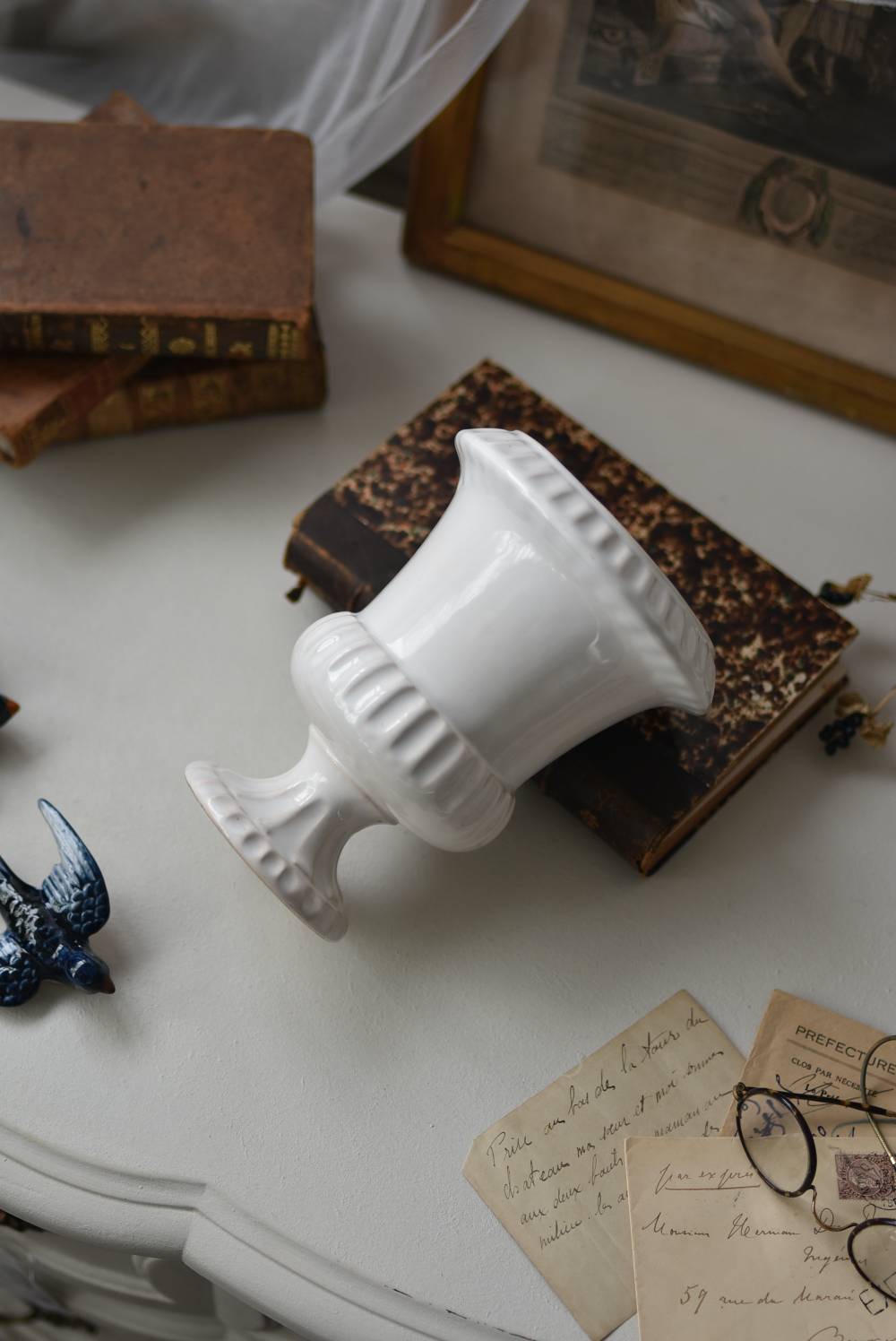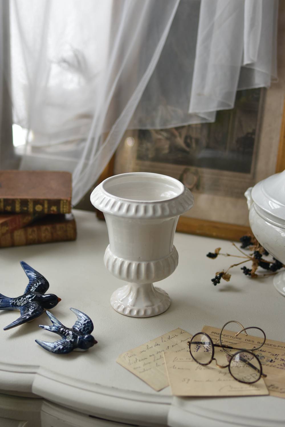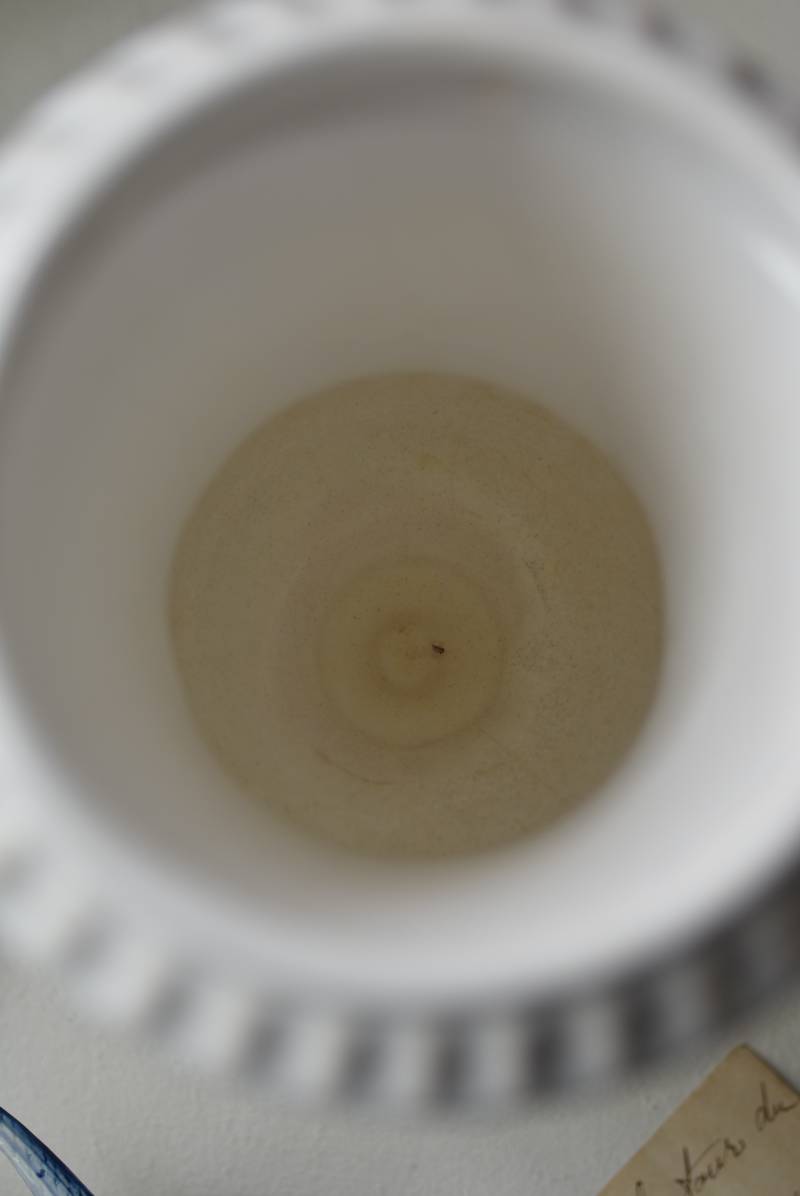 フランスのメディシス。 艶やかな白の釉薬がとろりとかけられ、ほんのり地色が覗く唯一無二の表情が魅力的。ふわりと広がった口元にきゅっとくびれのある脚元の特徴的なシルエットが優美な印象で、フランスらしいエレガントな空間演出に活躍してくれます。表面に施されたシンプルな凹凸模様が独自の雰囲気を漂わせてくれる逸品に。 小さめの鉢を入れて華やかに彩る鉢カバーとしてはもちろん、雑貨などを入れて飾るディスプレイアイテムとしてもおすすめのアイテムです。 直径 約15cm H 約18.5cm 深さ 約14.5cm 口径 約10.5cm
