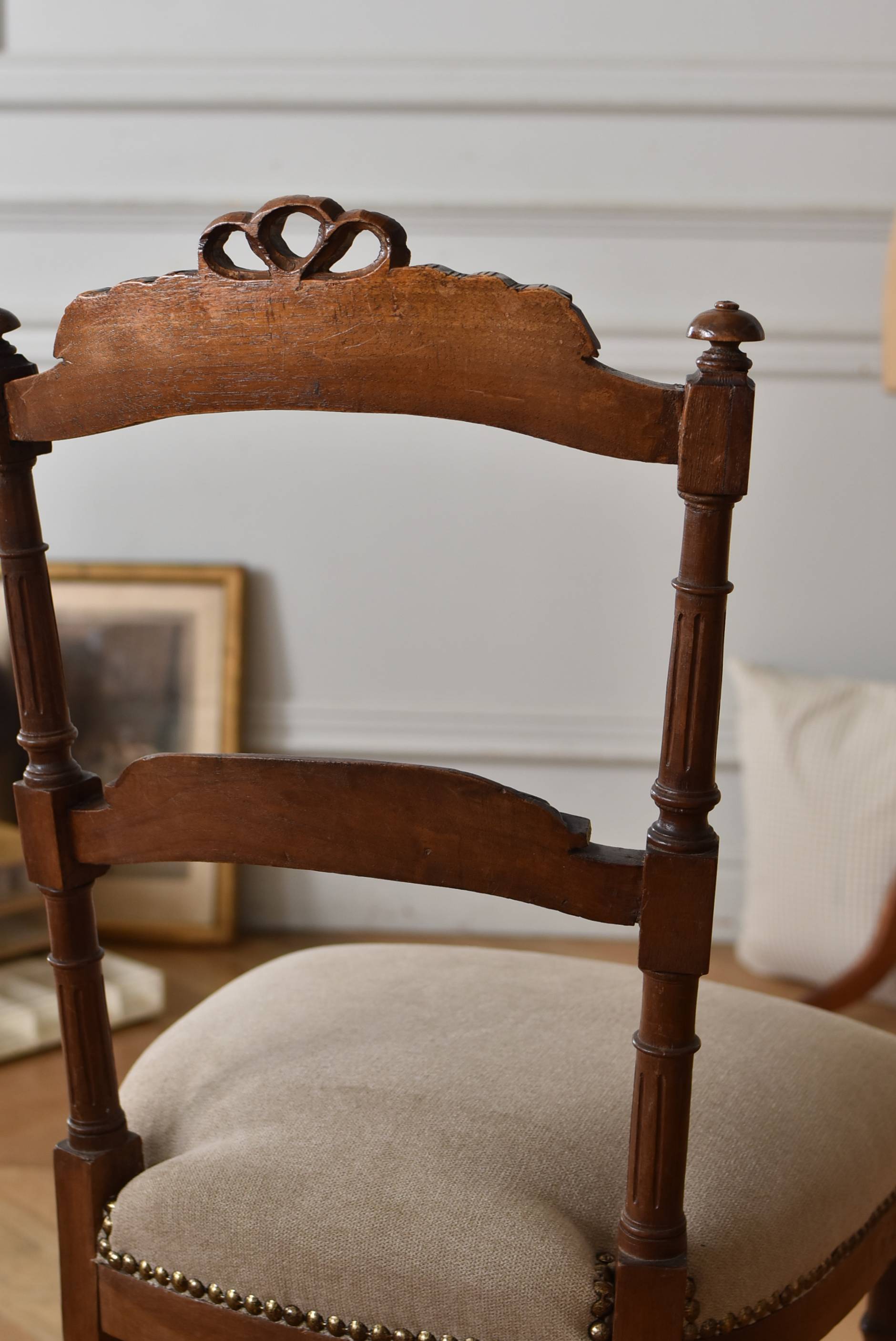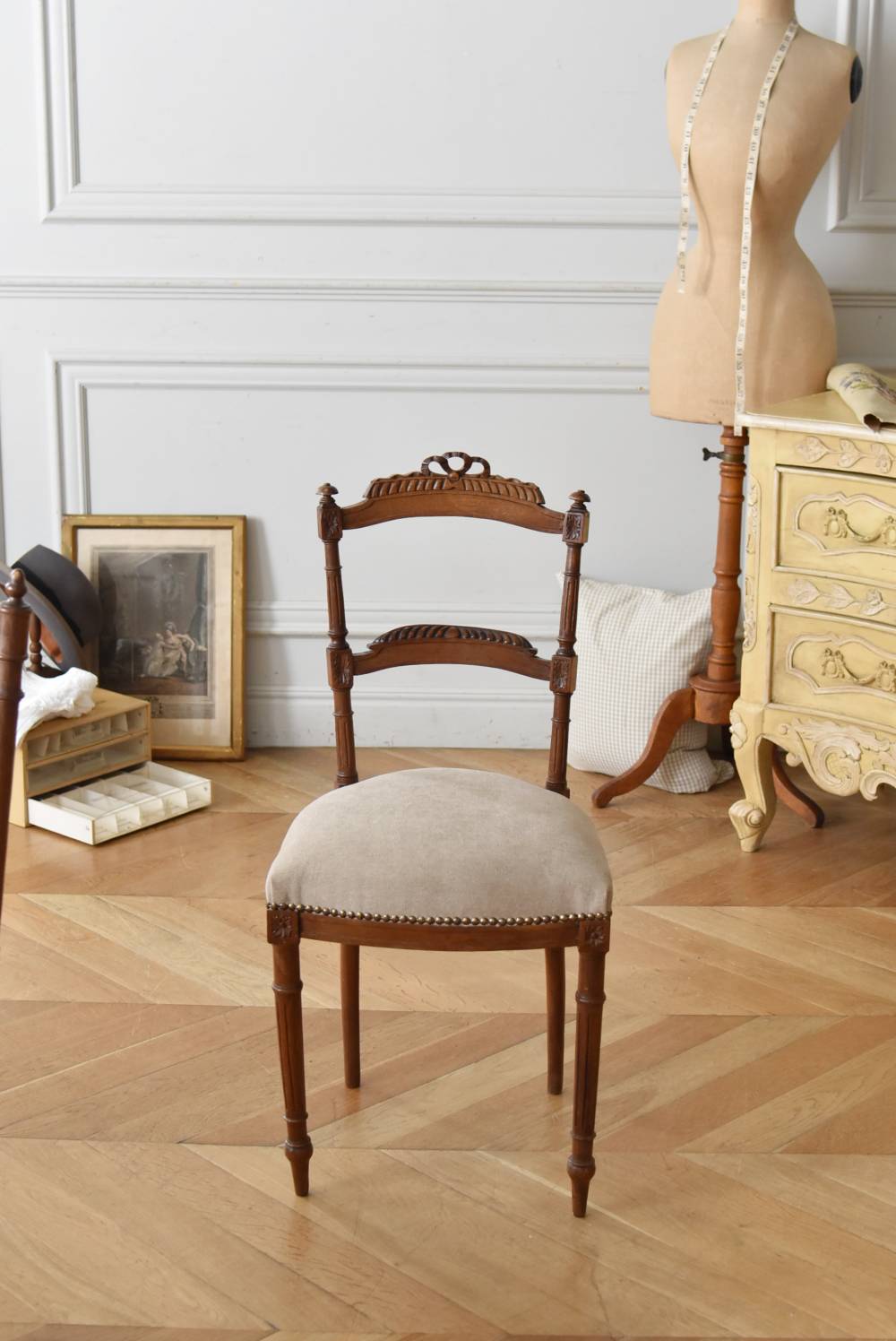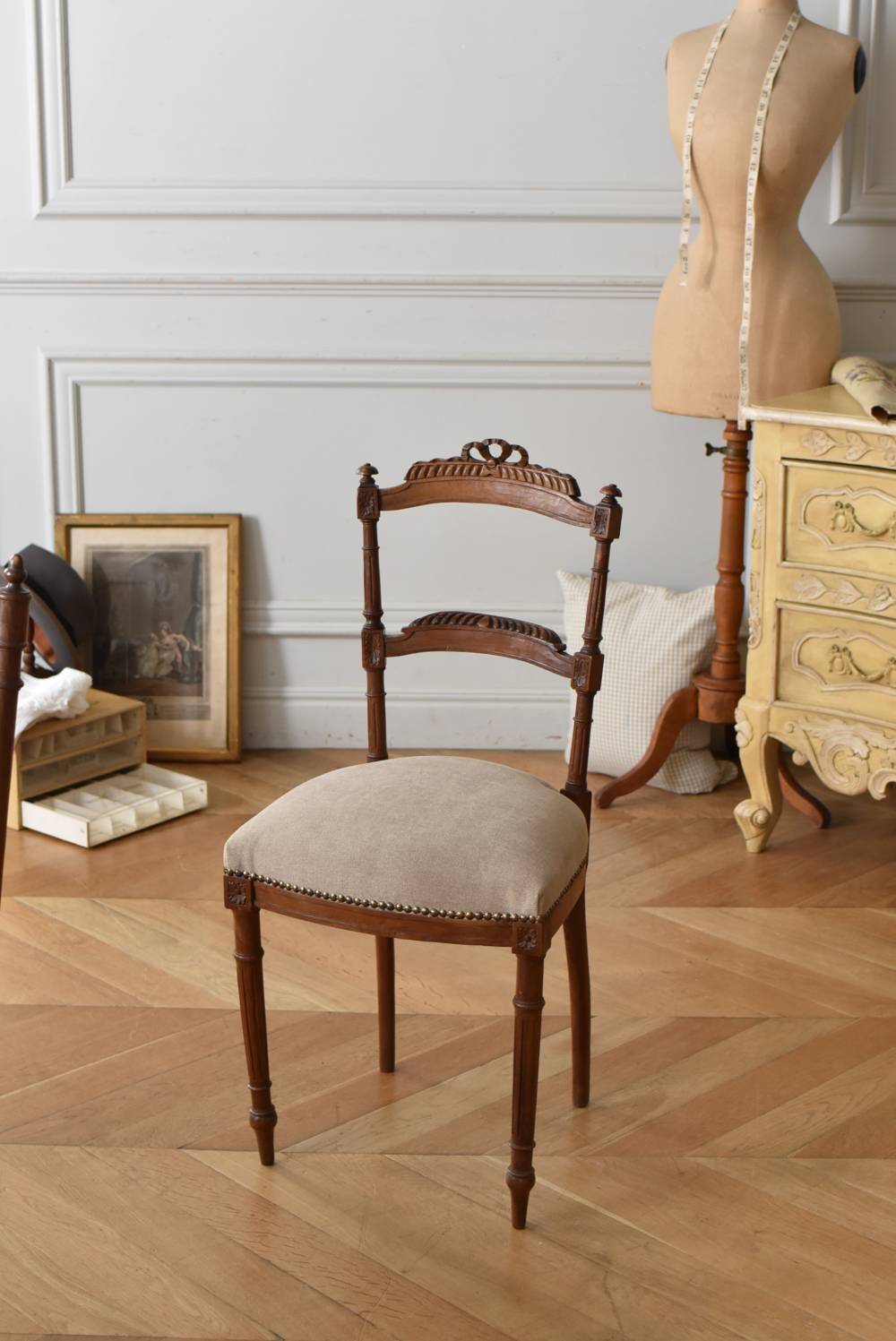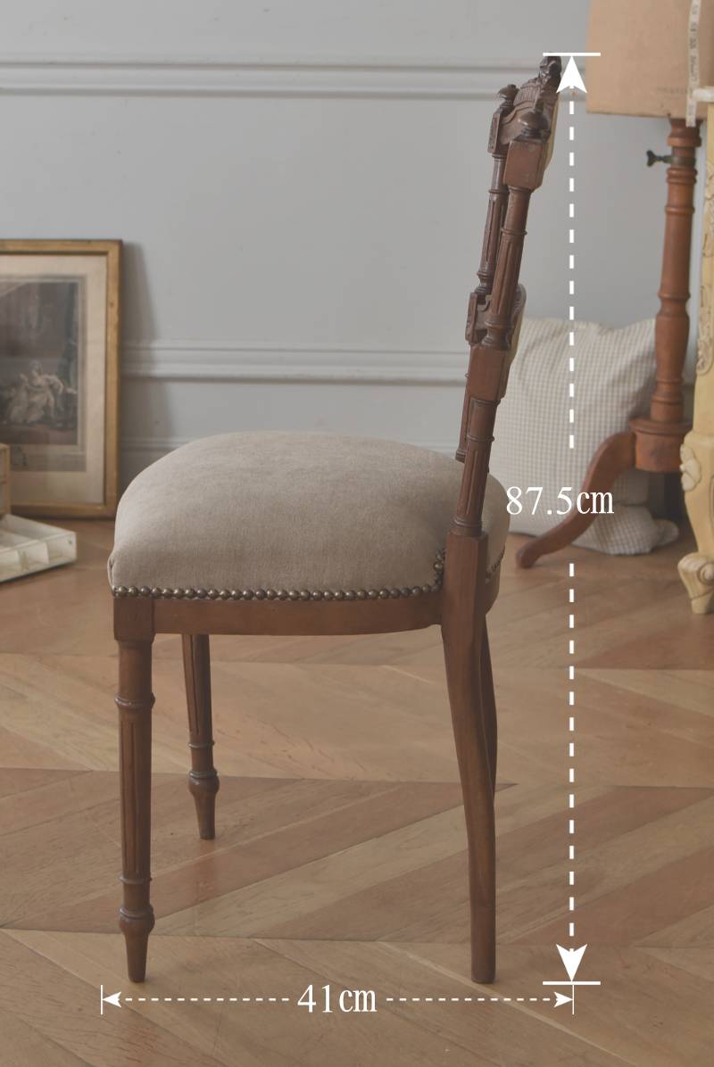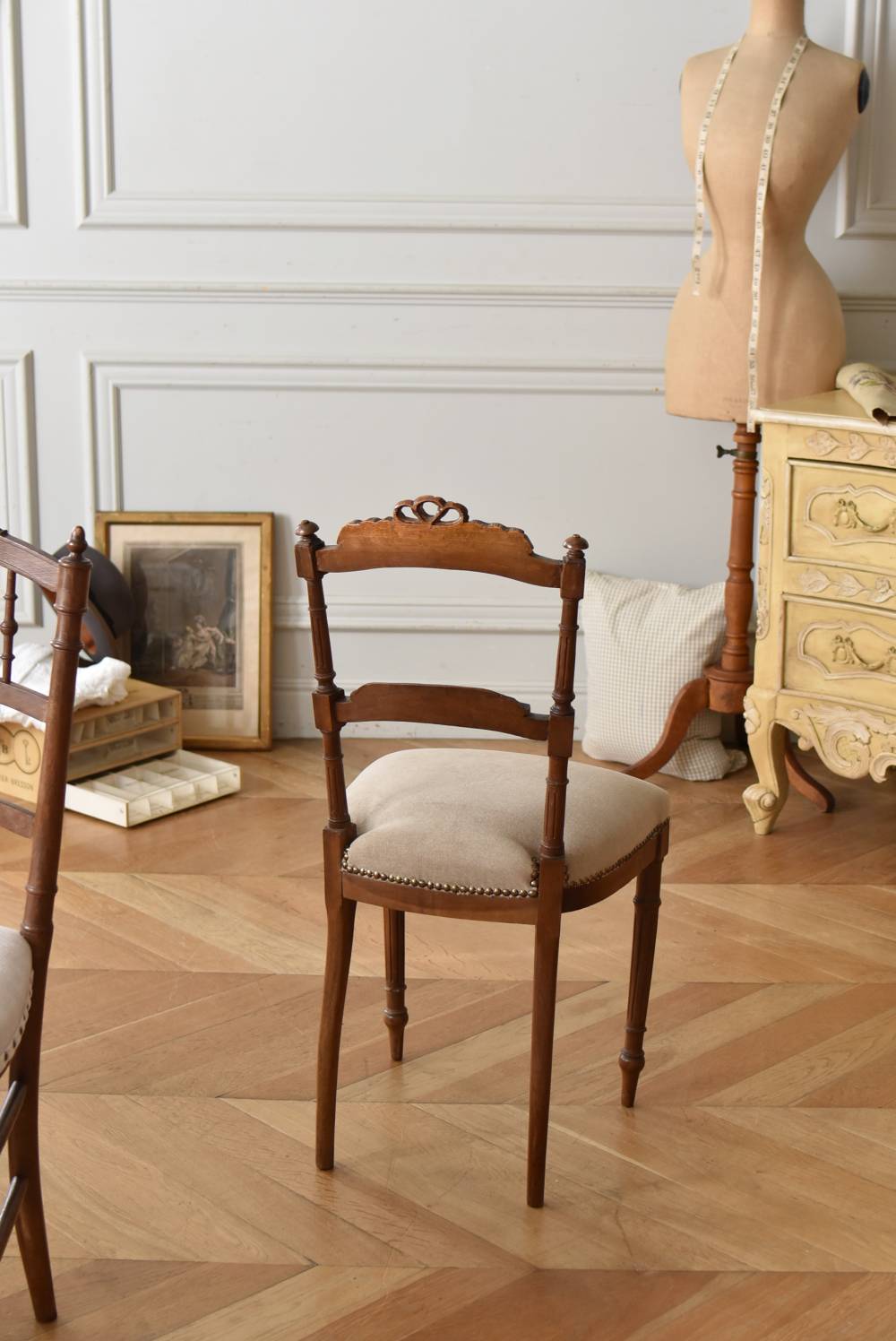 フランスのアンティークチェア。 まるでホイップクリームをのせたようなぷっくりとしたデザインにリボン装飾がちょこんとあしらわれ、横2本ラインで構成された背もたれが可憐な雰囲気を漂わせてくれます。四角くまとまったお花のレリーフもバランス良く施され、すらりと伸びた脚の直線ラインによっても凛とした気品のある佇まいです。 フレームは一度パーツ毎にバラしてから、しっかりと組み直しを行なっております。座面内側はウレタンに交換し、ファブリックも新しく張り替えており、程よく柔らかさのある座り心地です。 W 約41cm D 約41cm H 約87.5cm 座面までH 約47cm