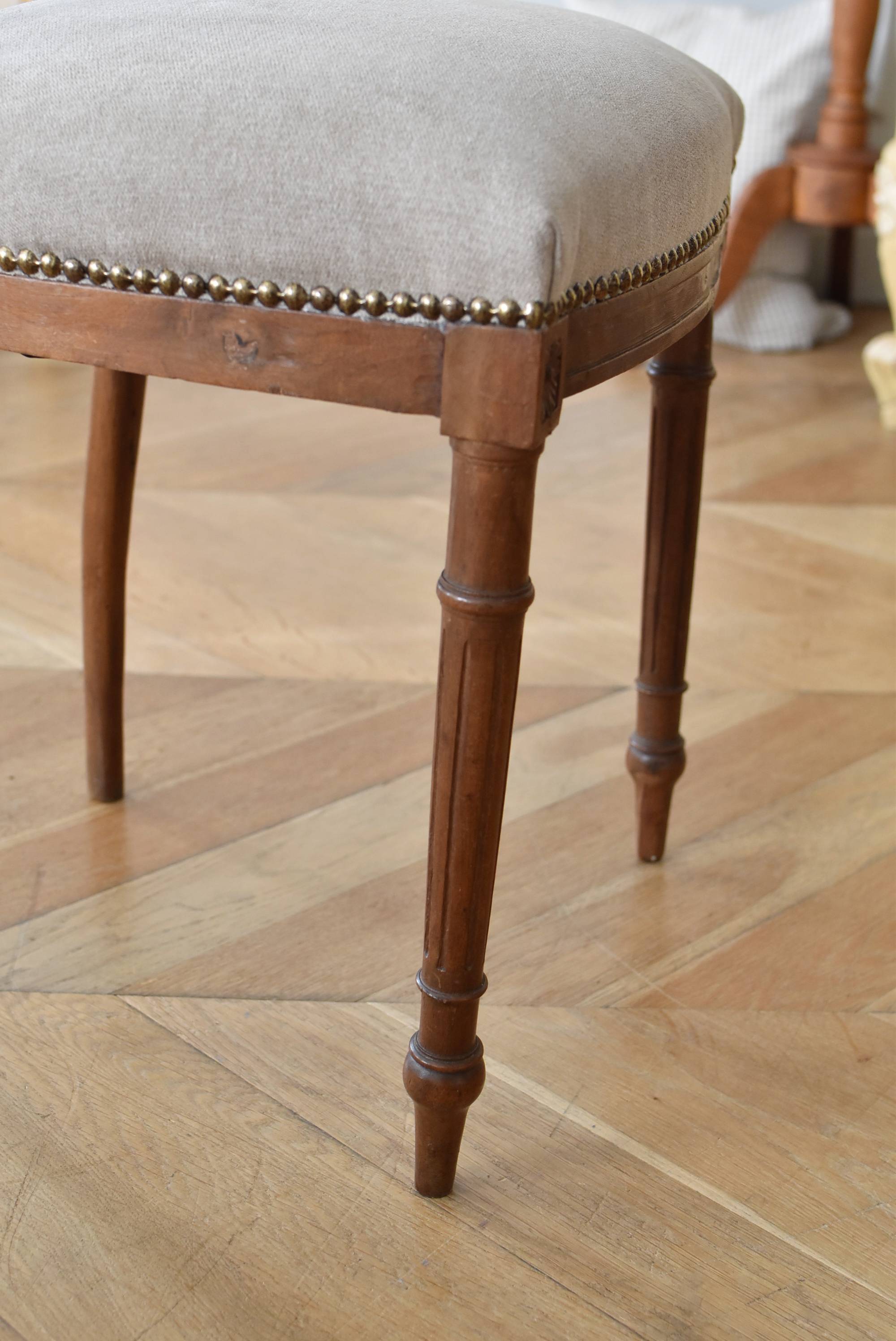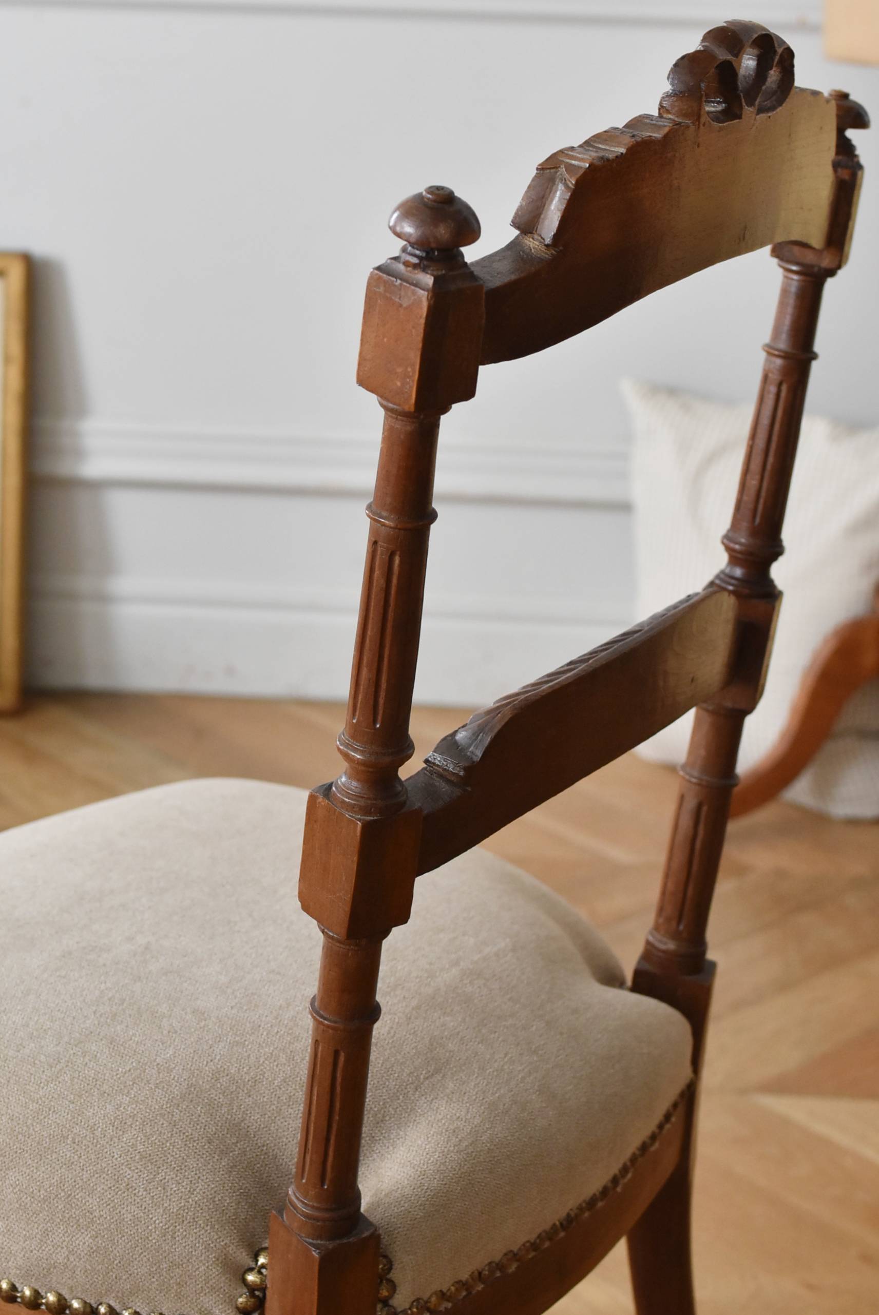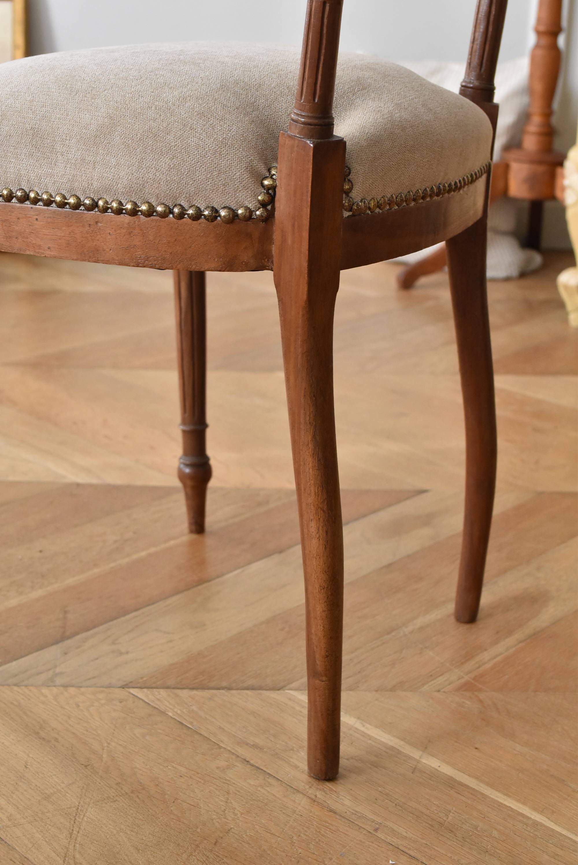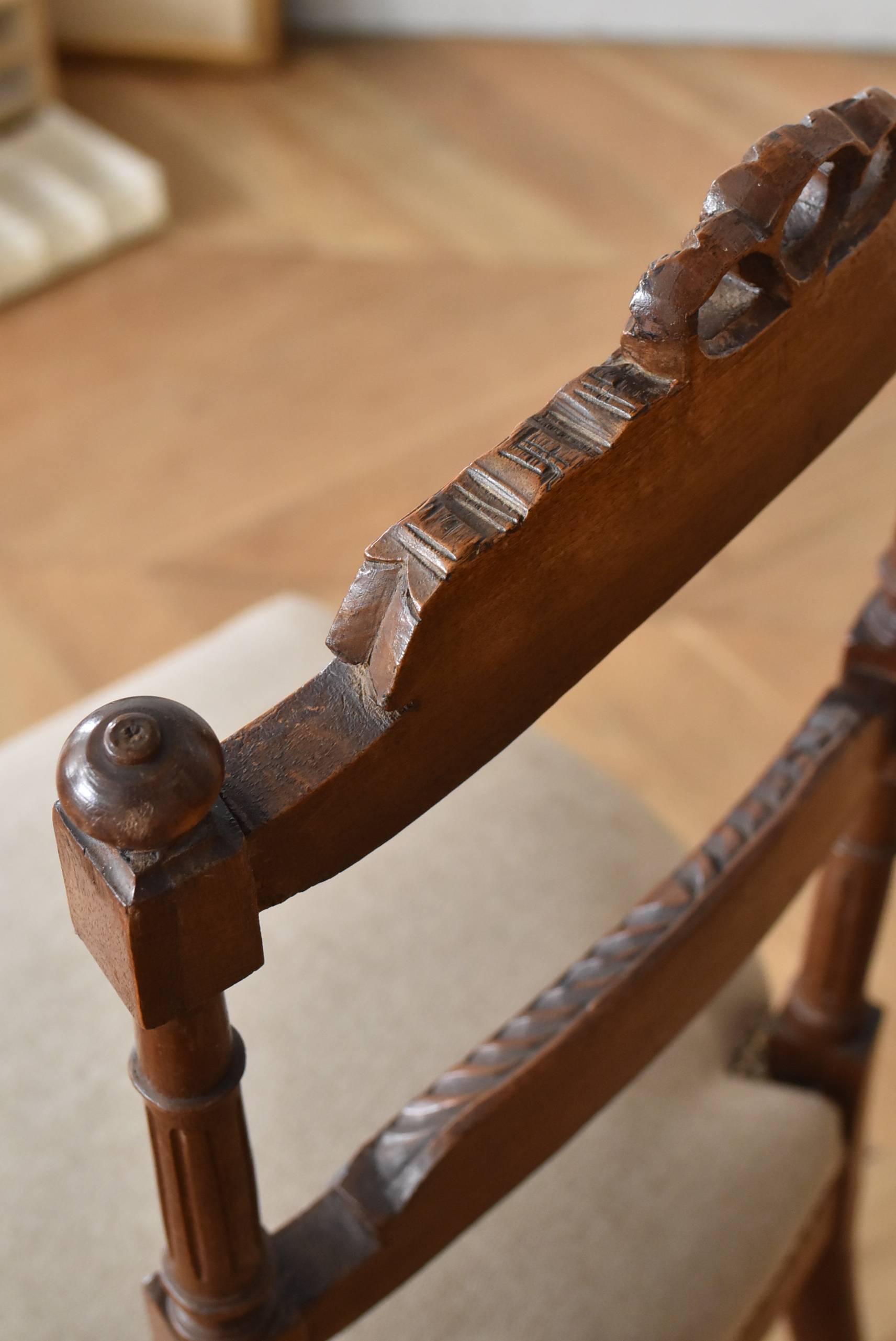 フランスのアンティークチェア。 まるでホイップクリームをのせたようなぷっくりとしたデザインにリボン装飾がちょこんとあしらわれ、横2本ラインで構成された背もたれが可憐な雰囲気を漂わせてくれます。四角くまとまったお花のレリーフもバランス良く施され、すらりと伸びた脚の直線ラインによっても凛とした気品のある佇まいです。 フレームは一度パーツ毎にバラしてから、しっかりと組み直しを行なっております。座面内側はウレタンに交換し、ファブリックも新しく張り替えており、程よく柔らかさのある座り心地です。 W 約41cm D 約41cm H 約87.5cm 座面までH 約47cm