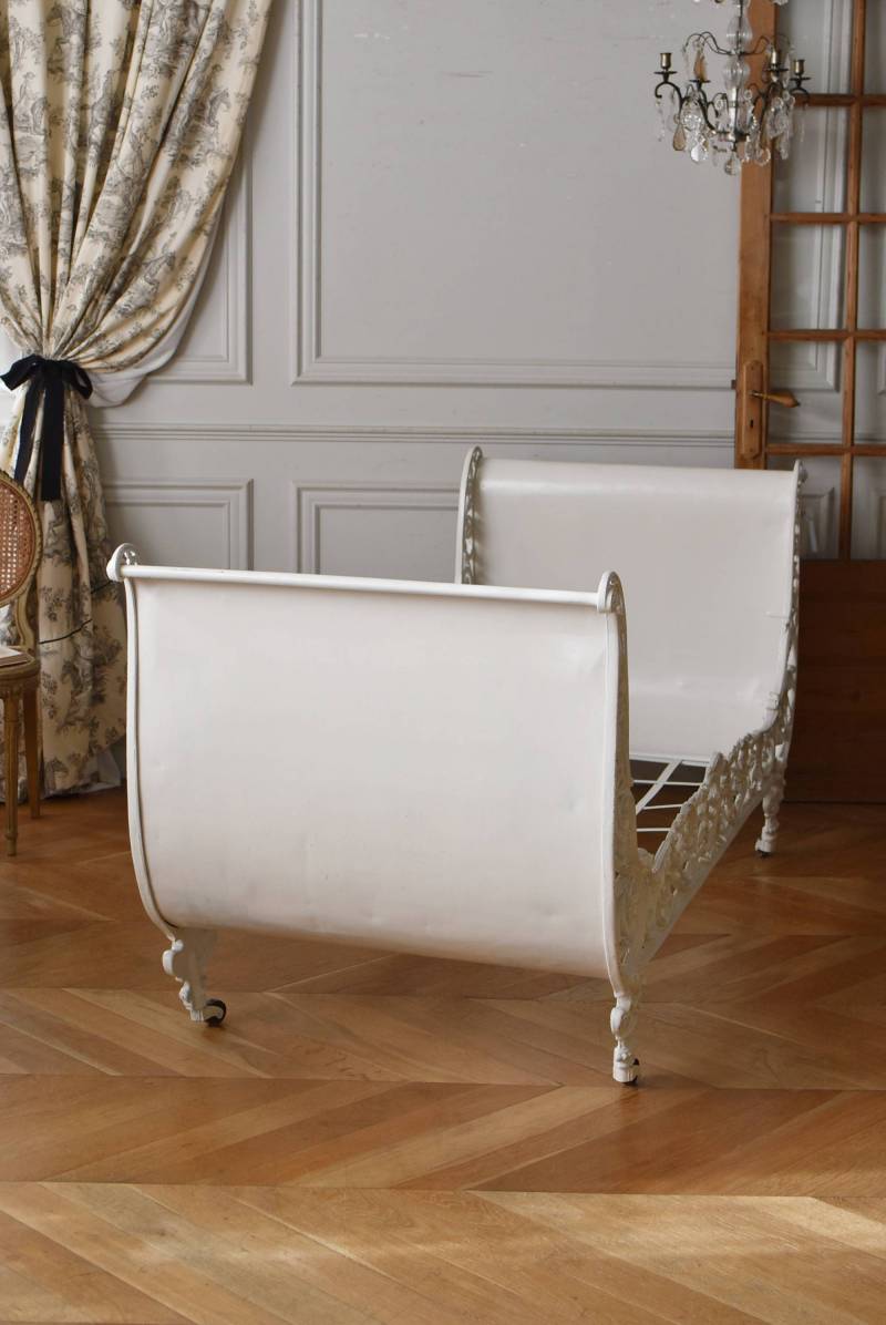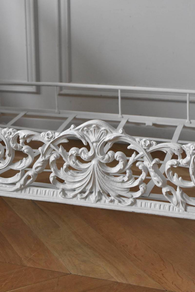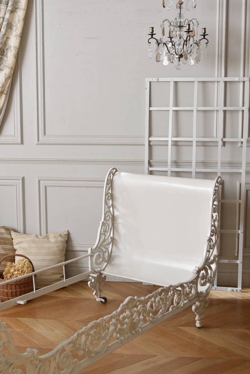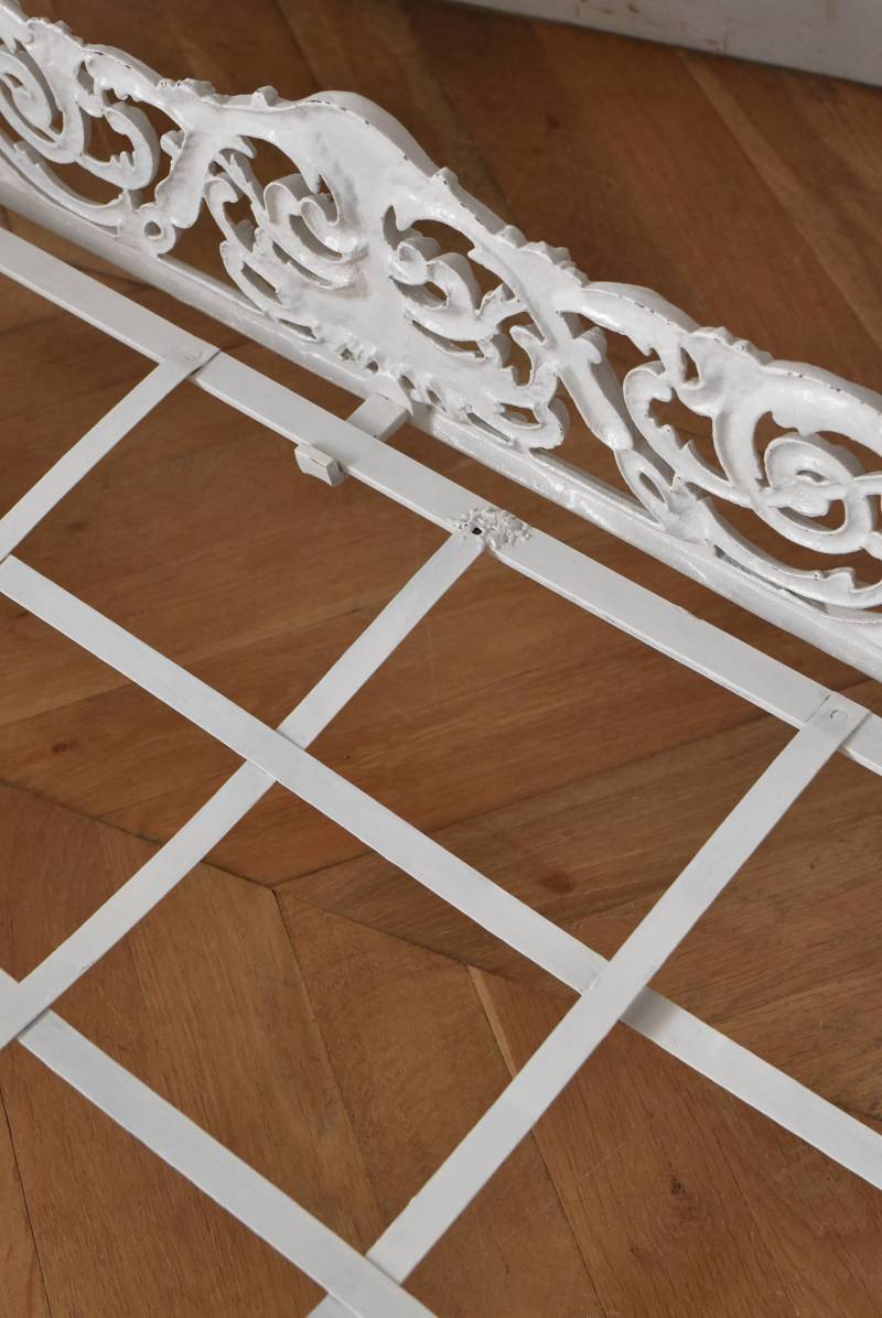 フランスのアンティークデイベッド。 厚みのあるアイアンによって透かし模様のようにデザインされた姿が圧巻で、くるんと巻いた躍動感あふれる植物モチーフが自然の豊かさを表現したような雰囲気を演出してくれます。しなやかな曲線が描かれた両サイドのシルエットも美しく、上品なホワイトカラーが空間を明るく仕上げてくれそうです。 クッションやマットレスなどは付属しません。分解した状態でのお届けとなります。組み立ては簡単な工程ですが、2人以上での作業が必要となります。組み立てを依頼される場合は別途料金が発生いたします。ご希望の方はご注文前に一度お問合せください。 W 約201.5cm D 約82.5cm H 約91.5cm 内寸 W約154cm×D約77cm 搬入経路について こちらの商品の配送について