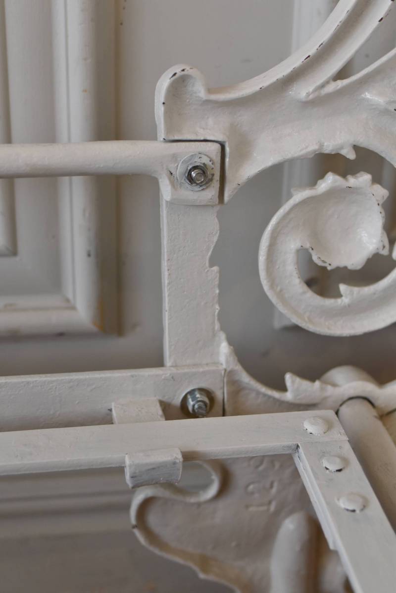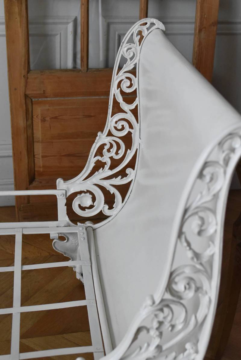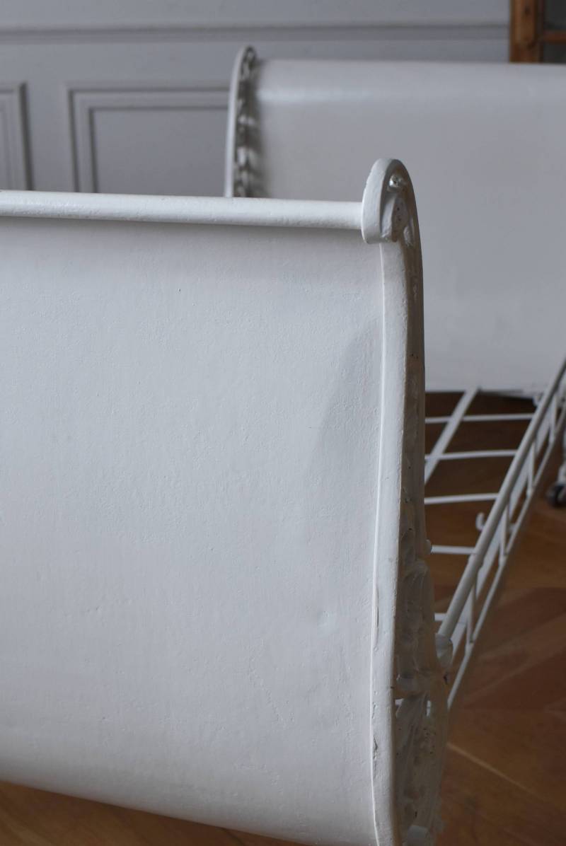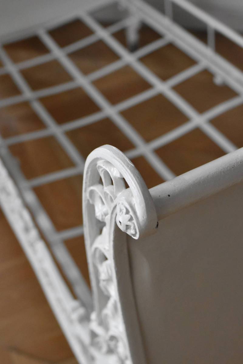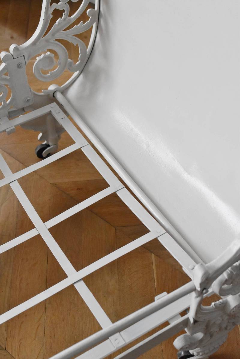 フランスのアンティークデイベッド。 厚みのあるアイアンによって透かし模様のようにデザインされた姿が圧巻で、くるんと巻いた躍動感あふれる植物モチーフが自然の豊かさを表現したような雰囲気を演出してくれます。しなやかな曲線が描かれた両サイドのシルエットも美しく、上品なホワイトカラーが空間を明るく仕上げてくれそうです。 クッションやマットレスなどは付属しません。分解した状態でのお届けとなります。組み立ては簡単な工程ですが、2人以上での作業が必要となります。組み立てを依頼される場合は別途料金が発生いたします。ご希望の方はご注文前に一度お問合せください。 W 約201.5cm D 約82.5cm H 約91.5cm 内寸 W約154cm×D約77cm 搬入経路について こちらの商品の配送について