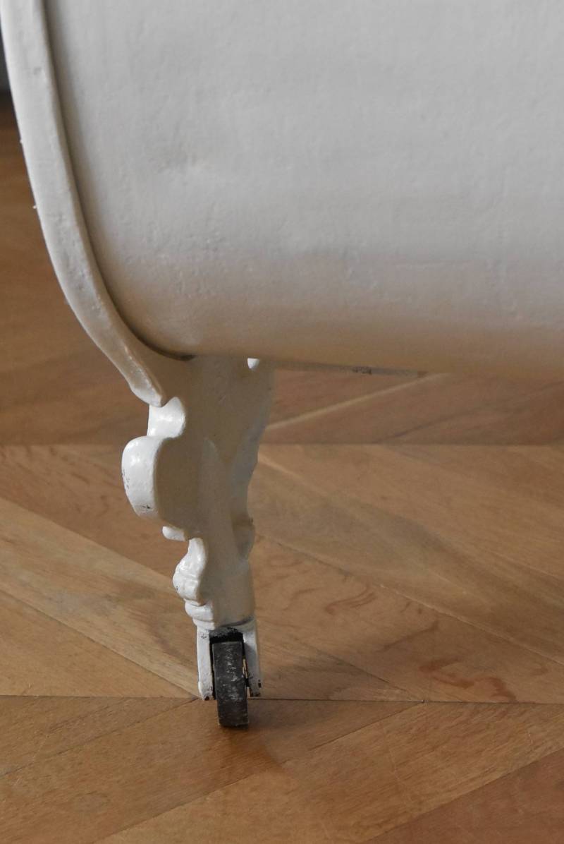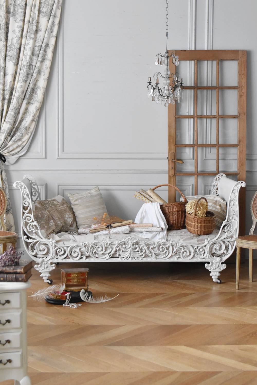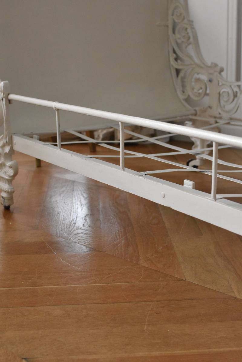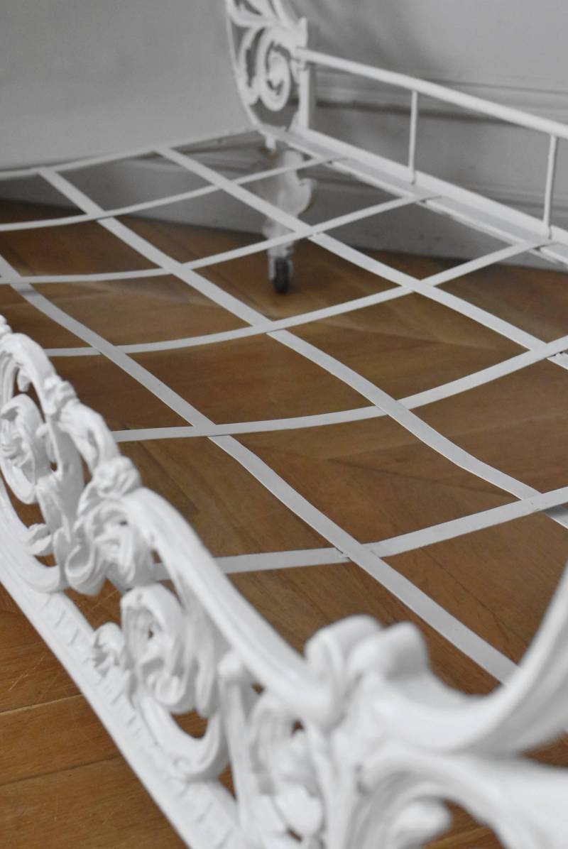 フランスのアンティークデイベッド。 厚みのあるアイアンによって透かし模様のようにデザインされた姿が圧巻で、くるんと巻いた躍動感あふれる植物モチーフが自然の豊かさを表現したような雰囲気を演出してくれます。しなやかな曲線が描かれた両サイドのシルエットも美しく、上品なホワイトカラーが空間を明るく仕上げてくれそうです。 クッションやマットレスなどは付属しません。分解した状態でのお届けとなります。組み立ては簡単な工程ですが、2人以上での作業が必要となります。組み立てを依頼される場合は別途料金が発生いたします。ご希望の方はご注文前に一度お問合せください。 W 約201.5cm D 約82.5cm H 約91.5cm 内寸 W約154cm×D約77cm 搬入経路について こちらの商品の配送について