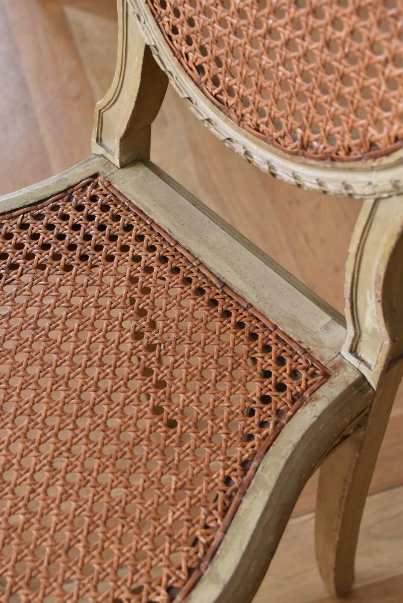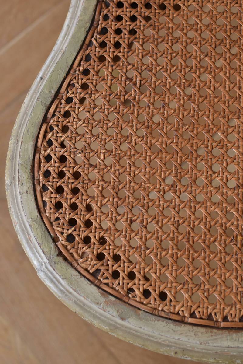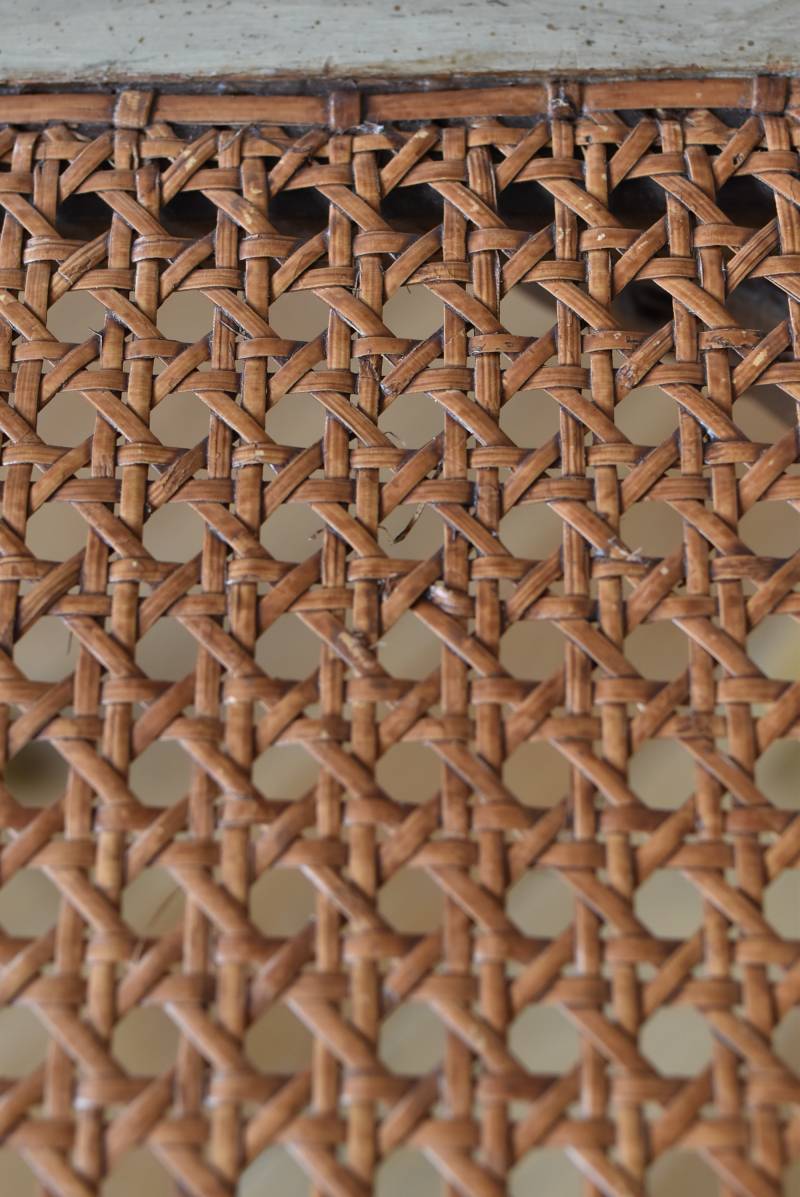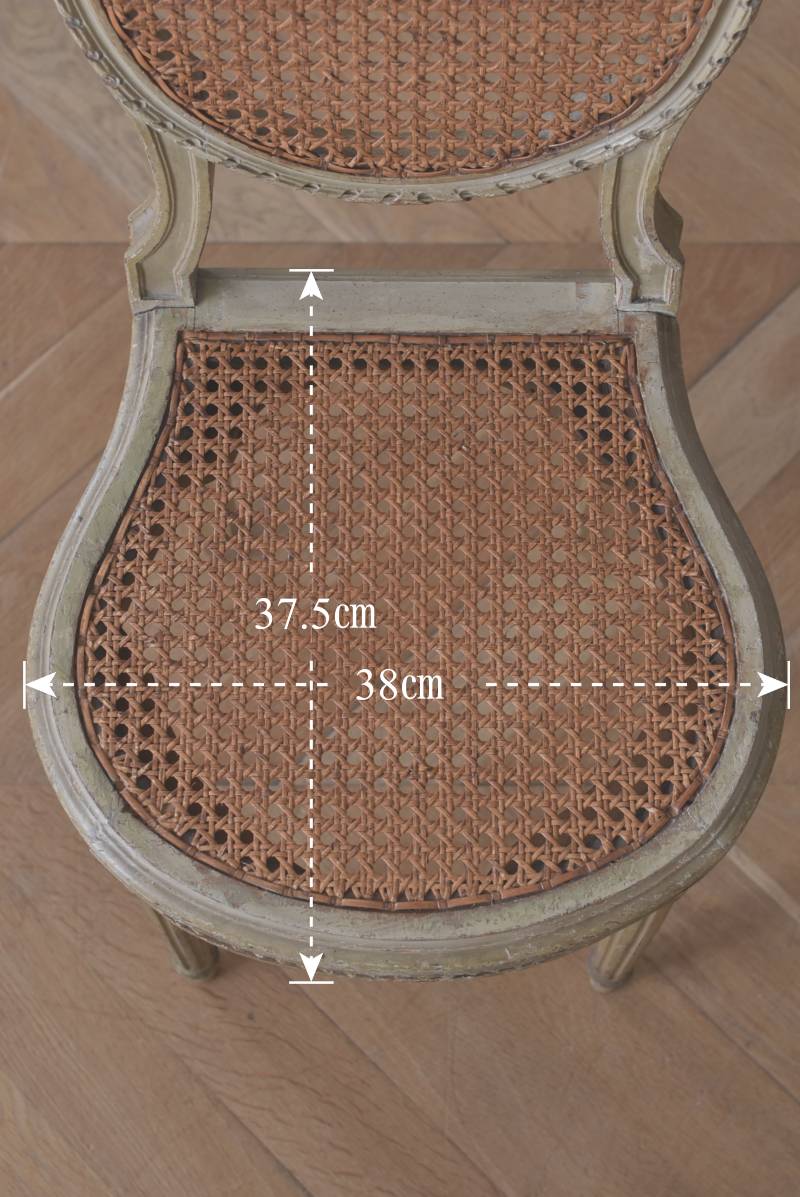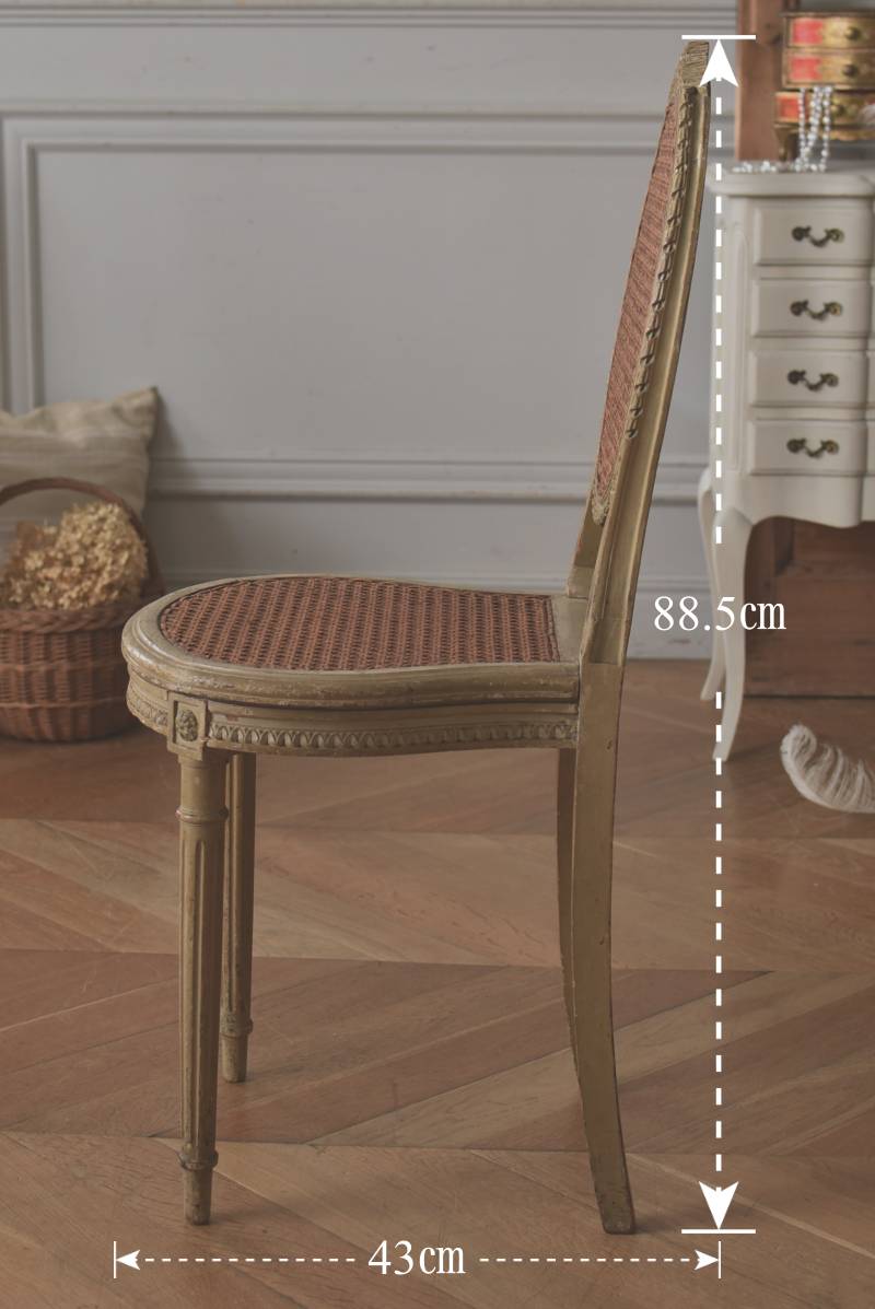 フレームはパーツ毎に一度バラしてから、しっかりと組み直しを行なっております。籐張りの背もたれと座面は買い付け当時のままのものとなりますが、しっかりとしたハリがあり、目立つような穴あきもありません。それぞれでの販売となりますが、同じデザインのアンティークチェア.Bがあります。 W 約38cm