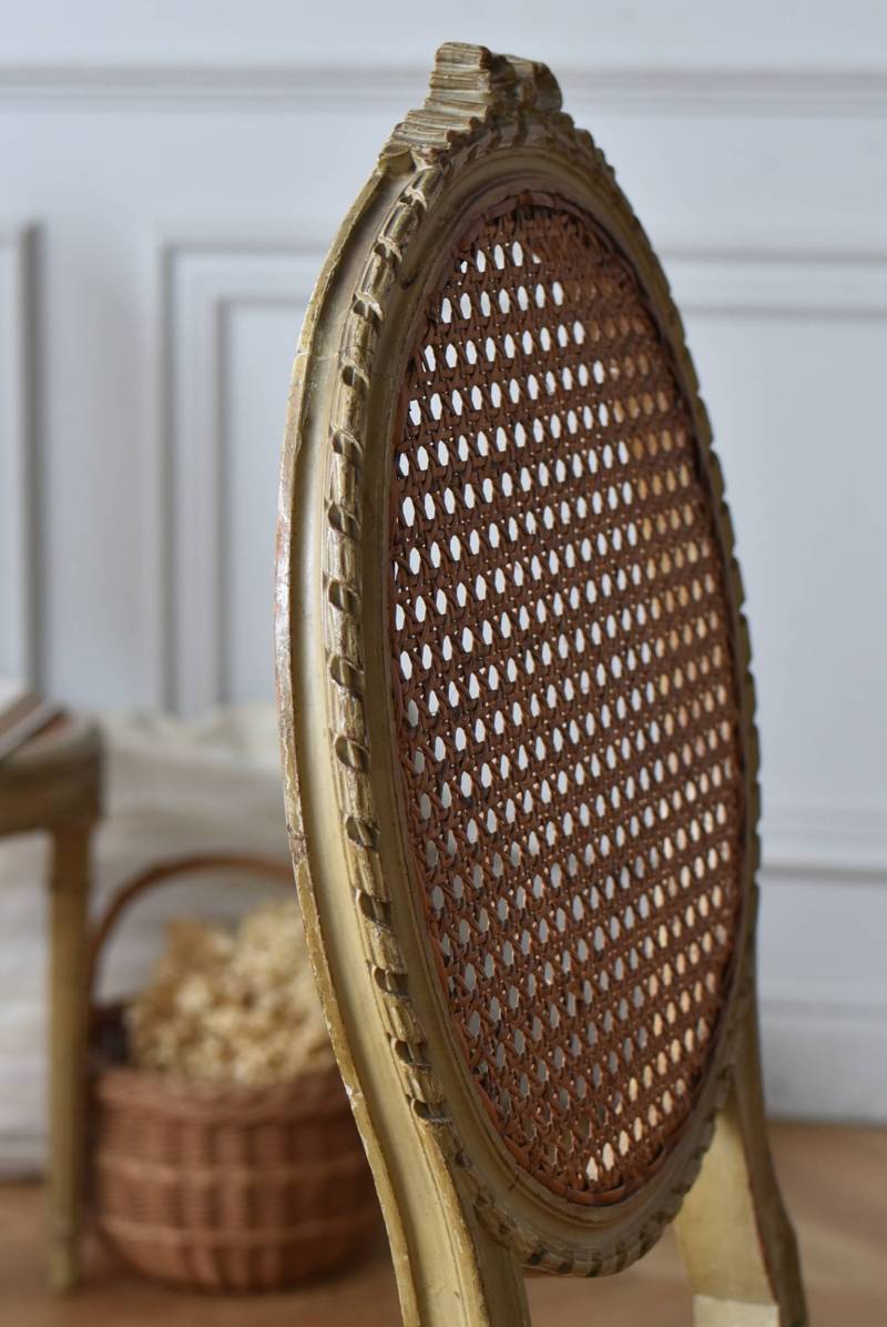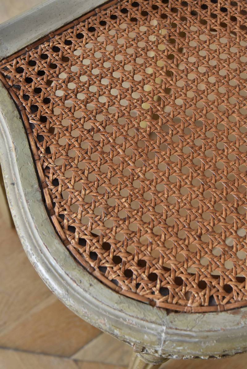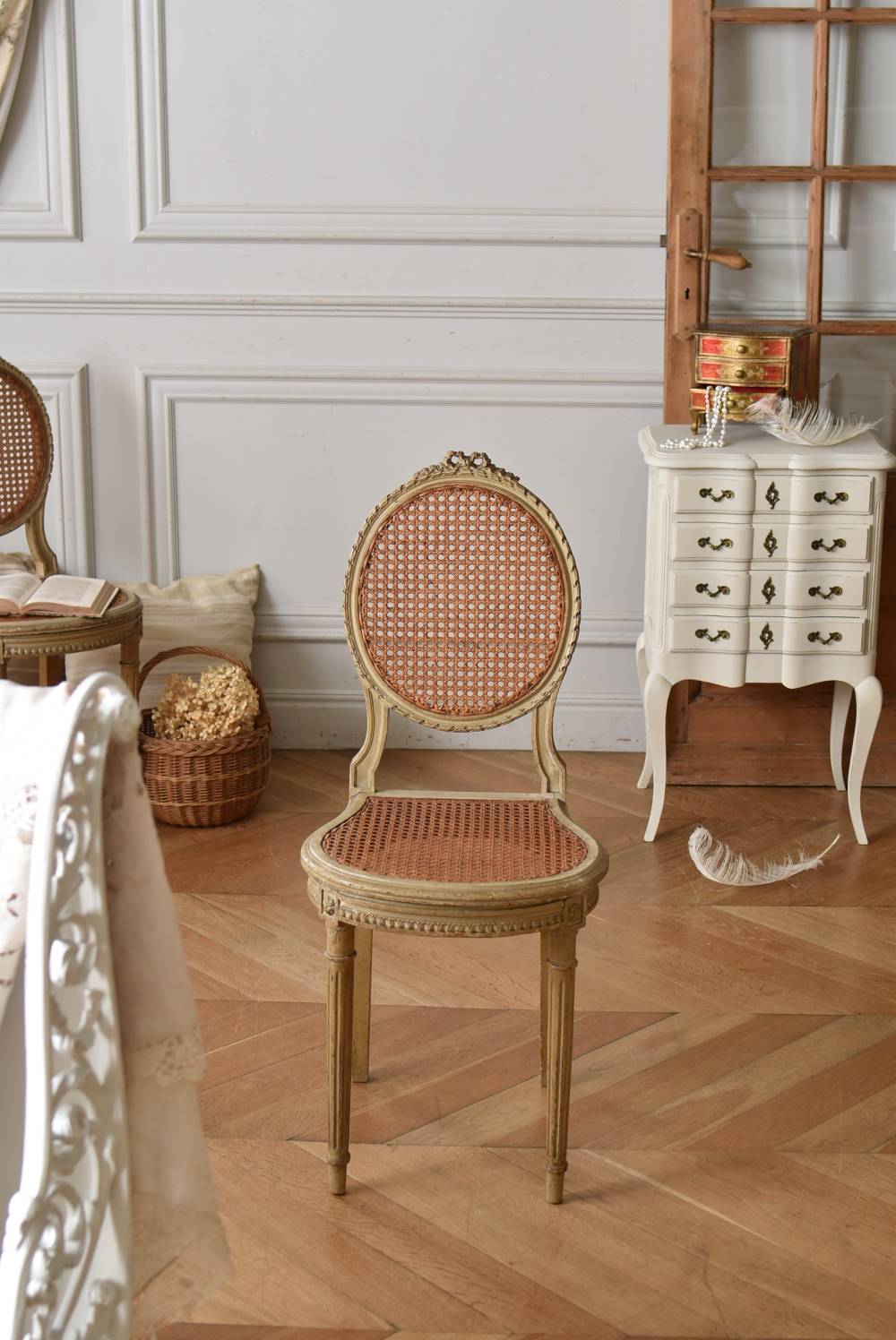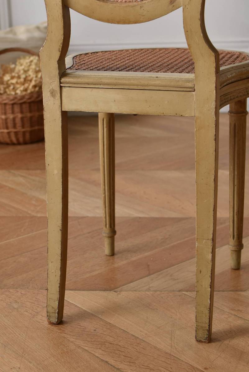 フレームはパーツ毎に一度バラしてから、しっかりと組み直しを行なっております。籐張りの背もたれと座面は買い付け当時のままのものとなりますが、しっかりとしたハリがあり、目立つような穴あきもありません。それぞれでの販売となりますが、同じデザインのアンティークチェア.Bがあります。 W 約38cm