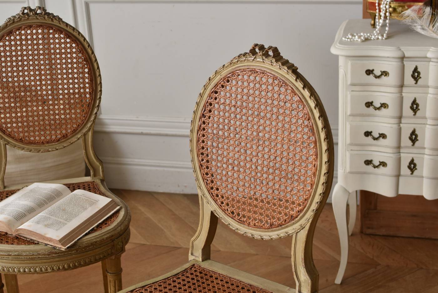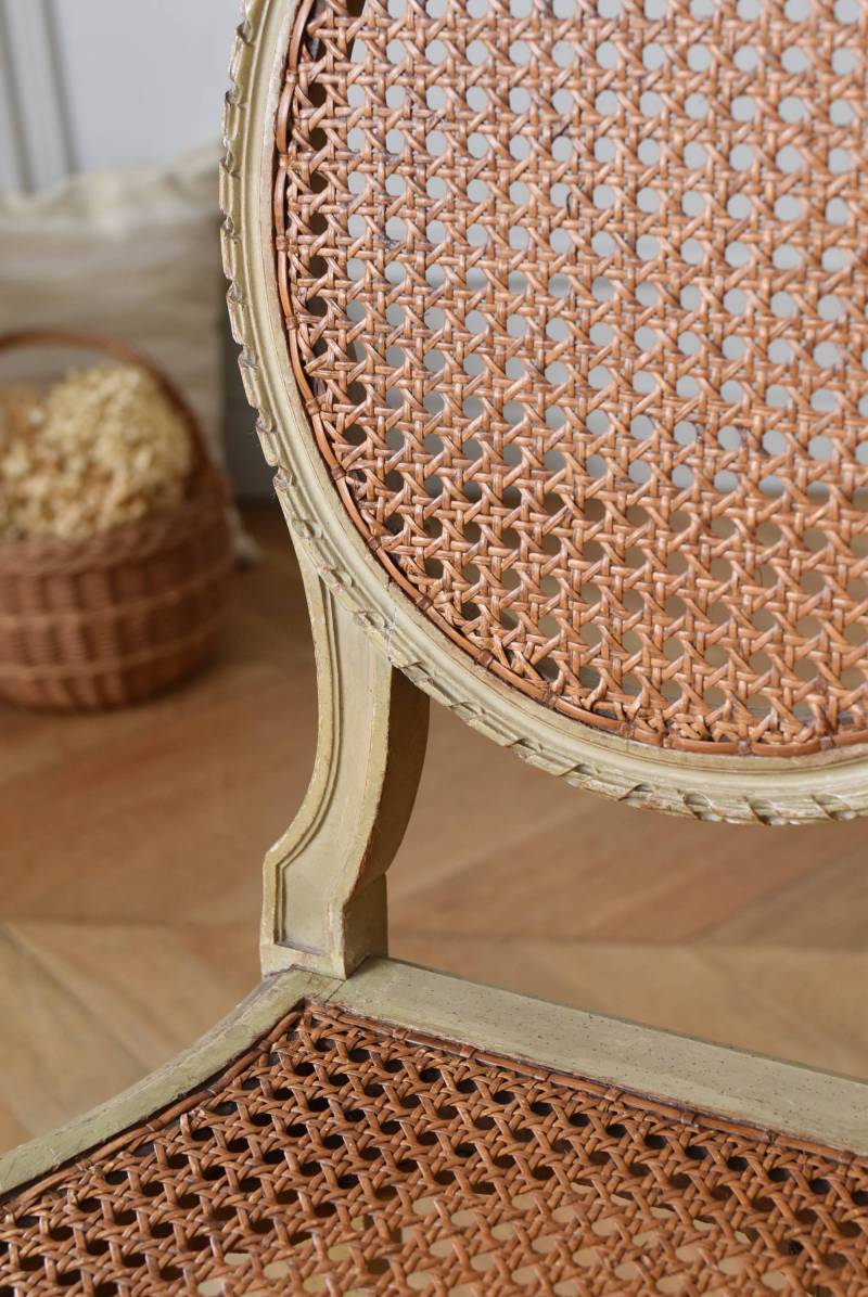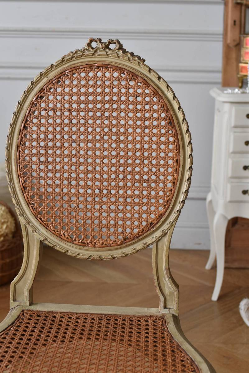 背もたれトップに波打つようなリボン装飾があしらわれ、リボンを巻き付けたような細やかな連続模様がすっきりとしたオーバル型の背もたれを縁取った気品溢れる姿です。籐張りがぬくもりのある雰囲気と程よい抜け感をもたらし、深みのある落ち着いた色合いがクラシカルな佇まいとなっています。