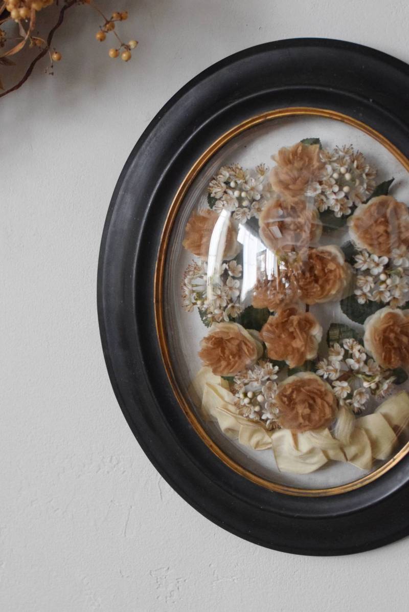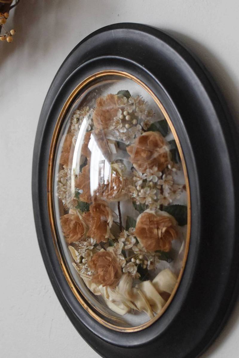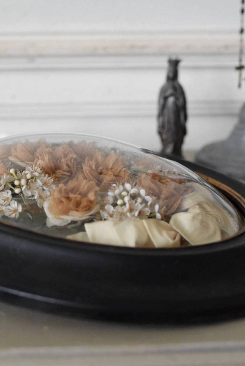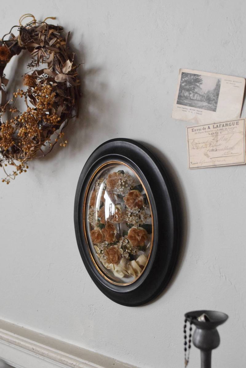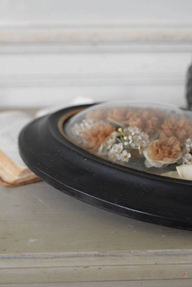 ガラスはほんのりと丸みを持ったドーム型となっており、中には落ち着いたカラーの造花などをギュッと収めた、美しく、目を引く姿。ナポレオン3世スタイルのマットなブラックのフレームがキリッとかっこよく、中に飾ったアイテムを引き立てくれますね。