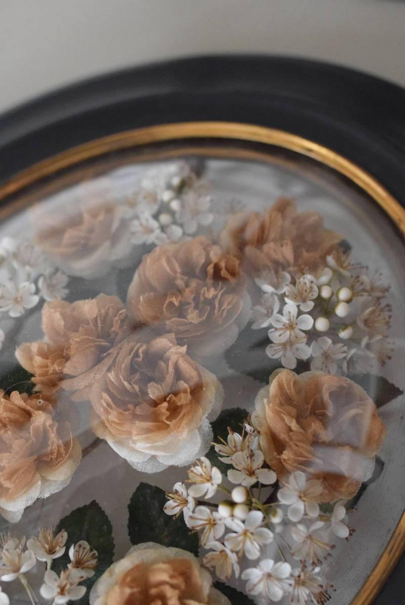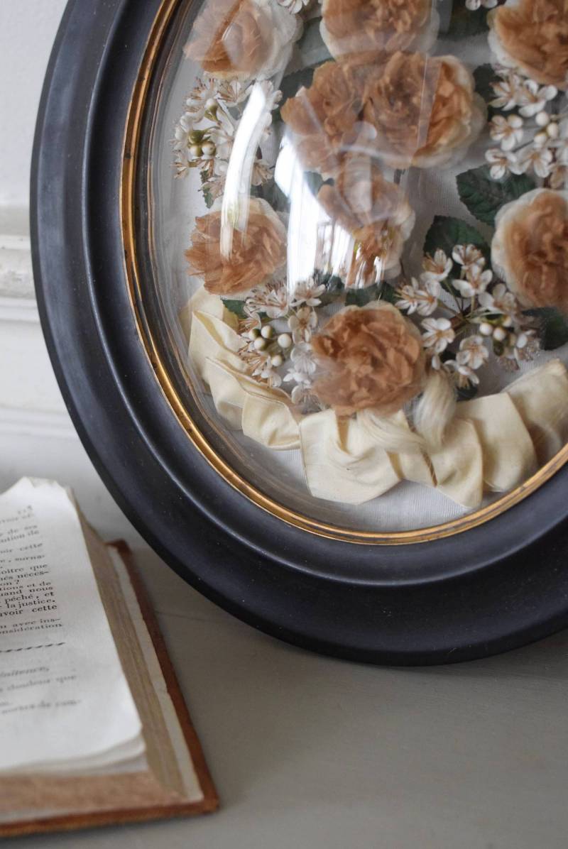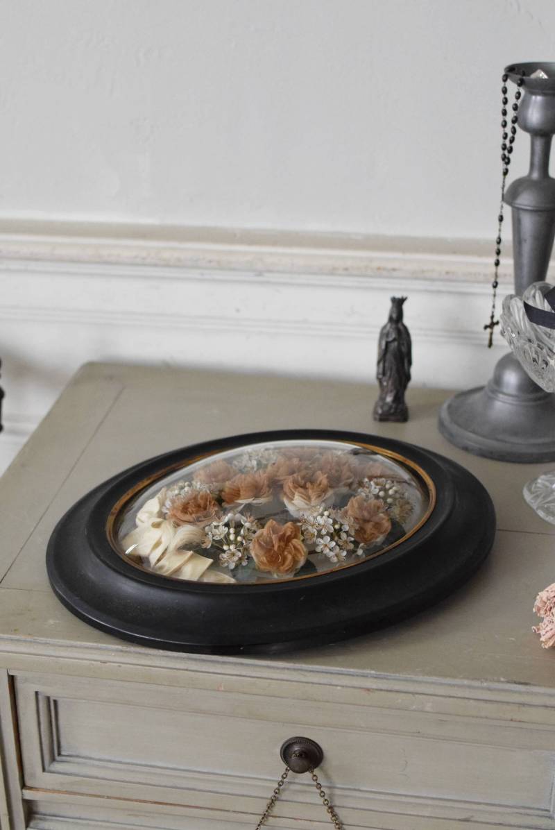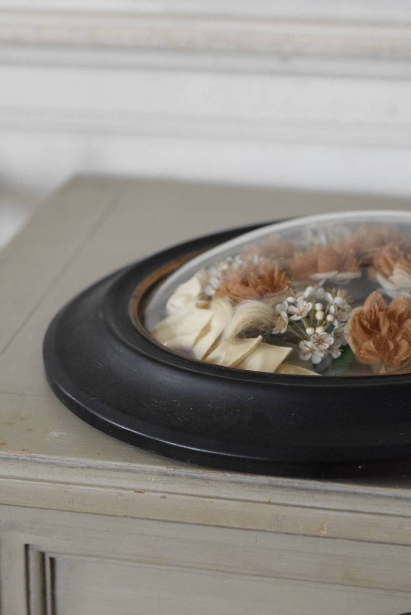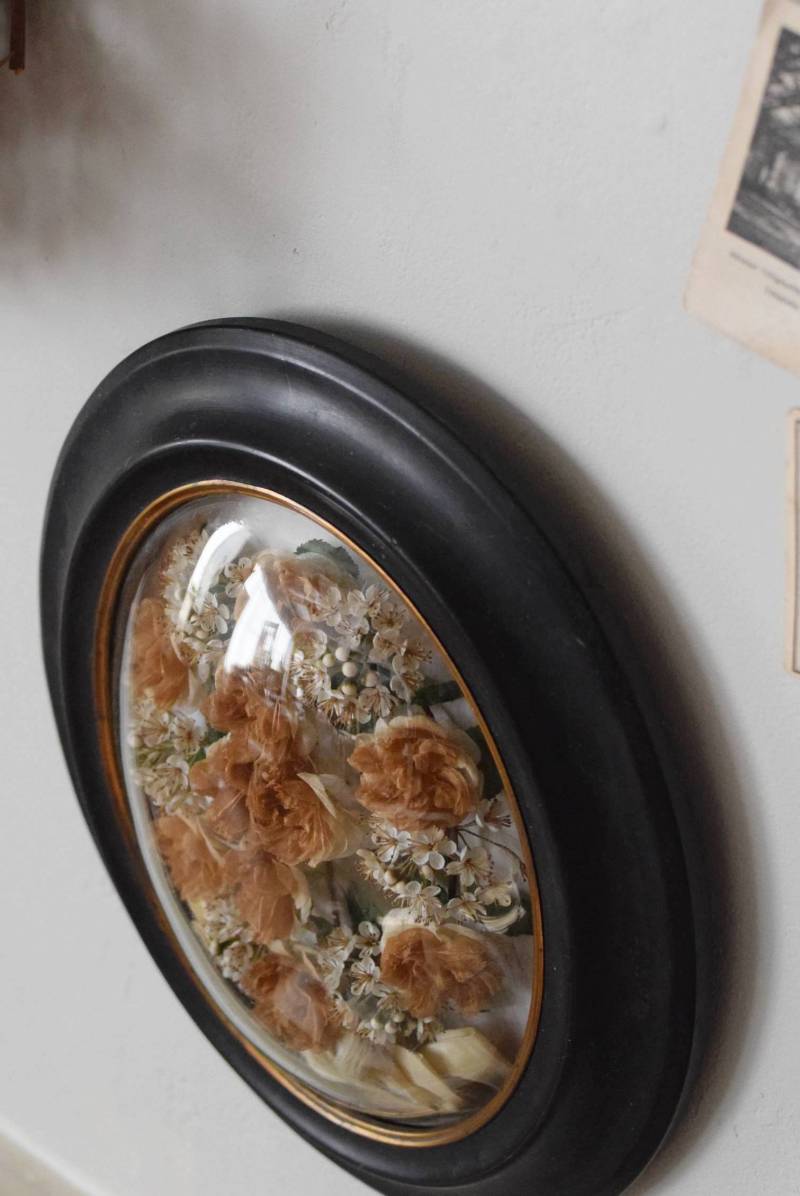 ガラスはほんのりと丸みを持ったドーム型となっており、中には落ち着いたカラーの造花などをギュッと収めた、美しく、目を引く姿。ナポレオン3世スタイルのマットなブラックのフレームがキリッとかっこよく、中に飾ったアイテムを引き立てくれますね。