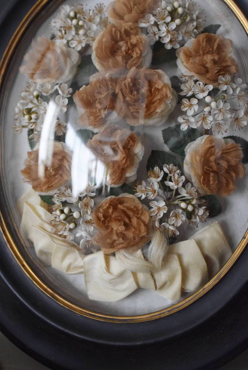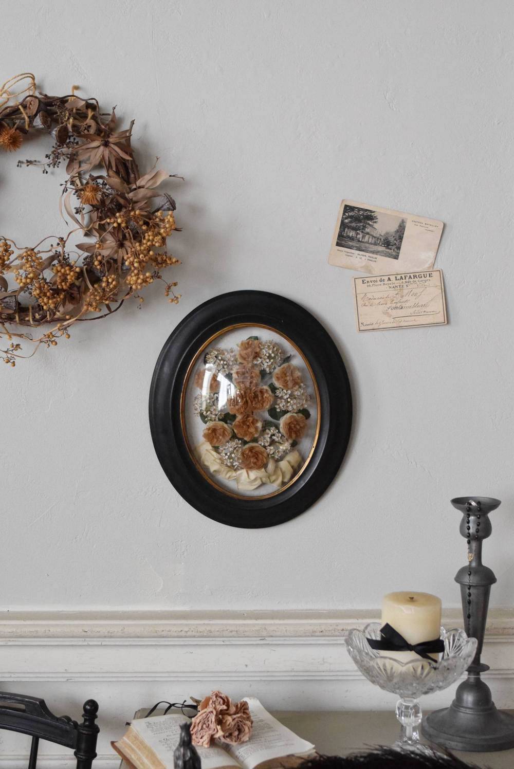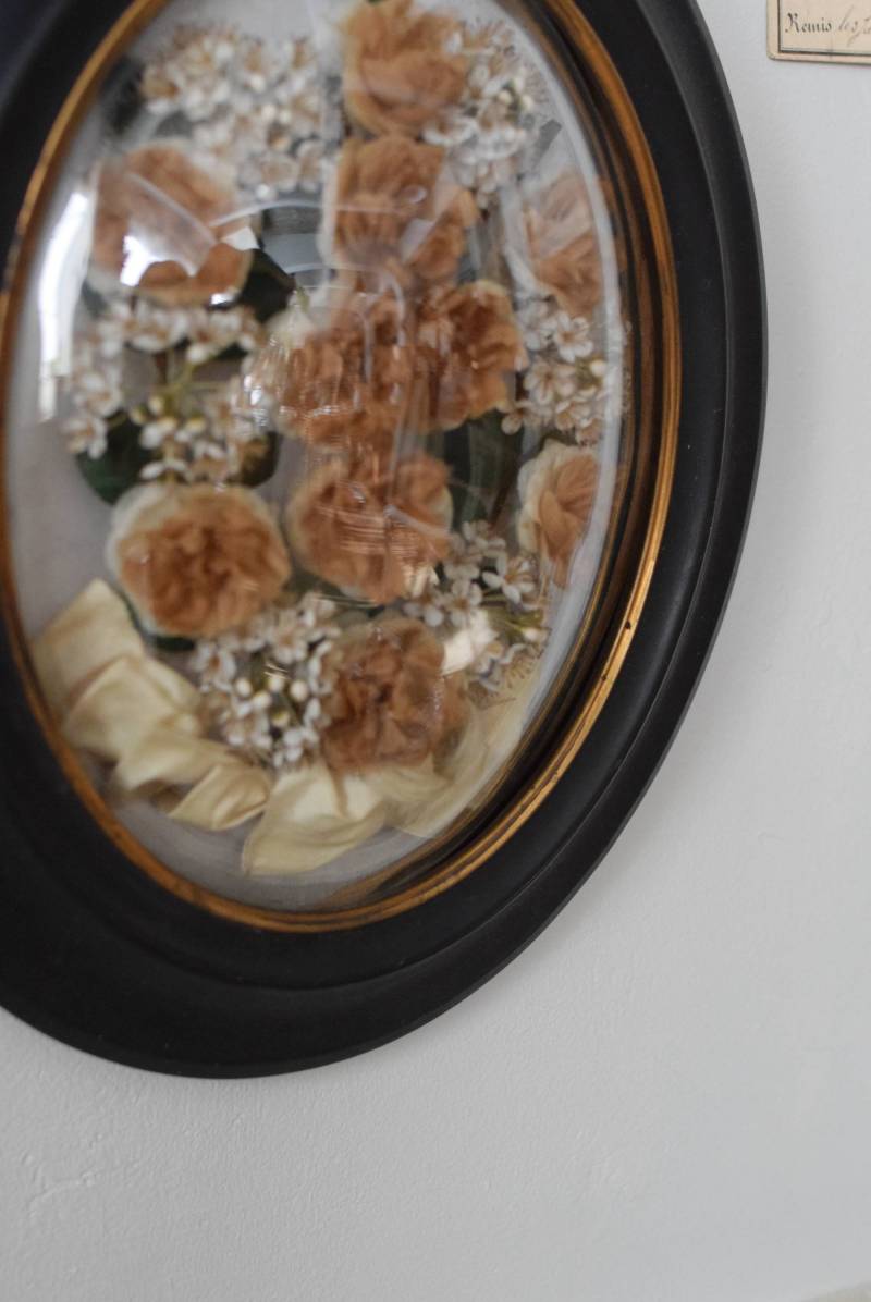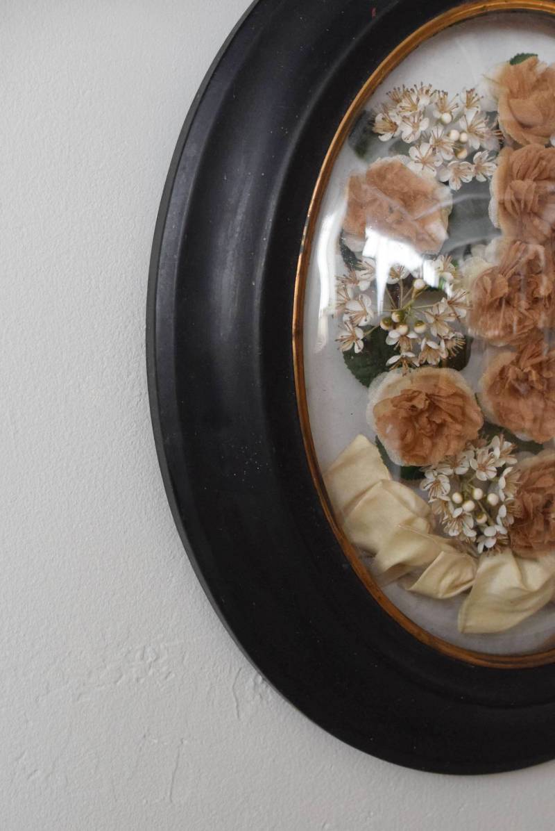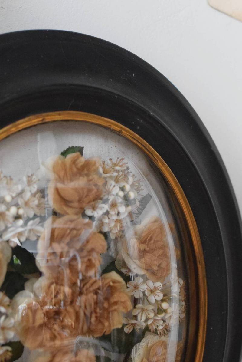 ガラスはほんのりと丸みを持ったドーム型となっており、中には落ち着いたカラーの造花などをギュッと収めた、美しく、目を引く姿。ナポレオン3世スタイルのマットなブラックのフレームがキリッとかっこよく、中に飾ったアイテムを引き立てくれますね。