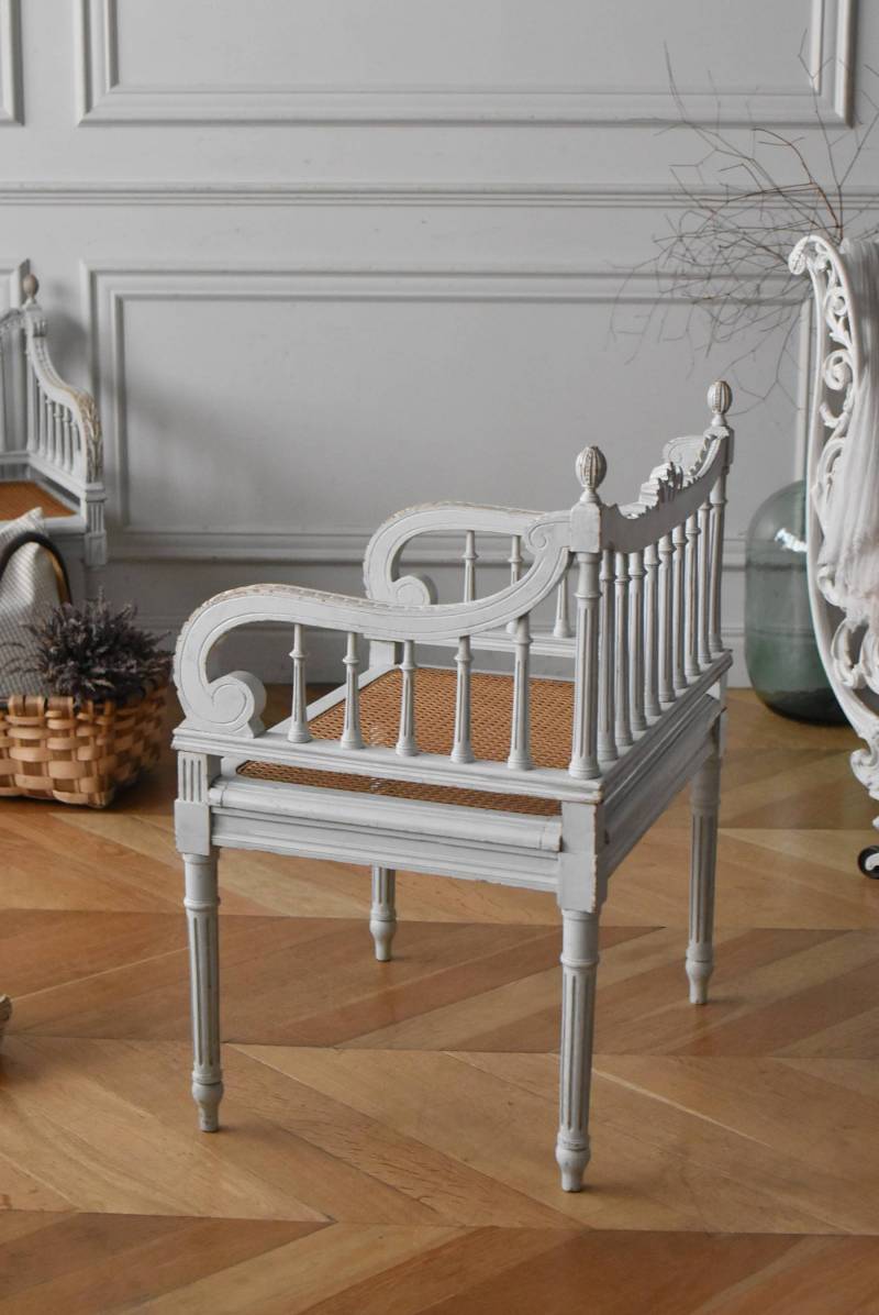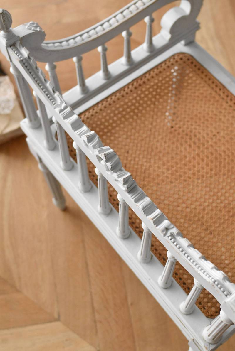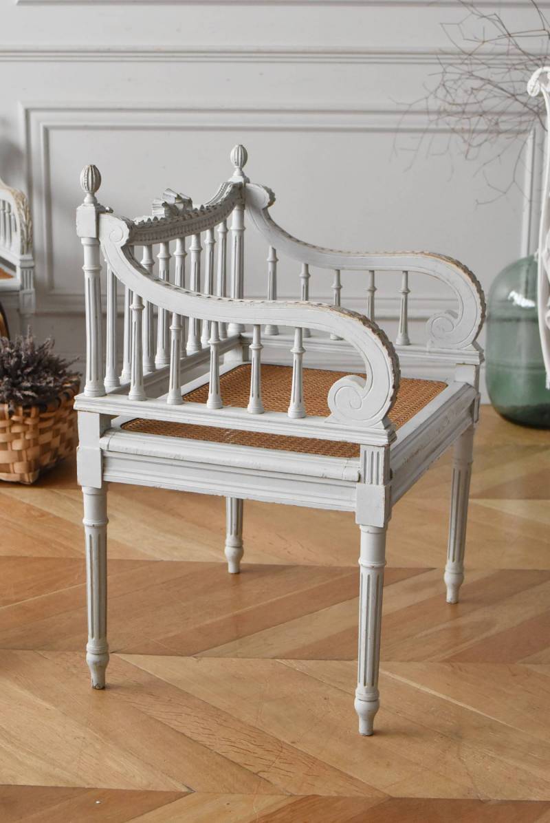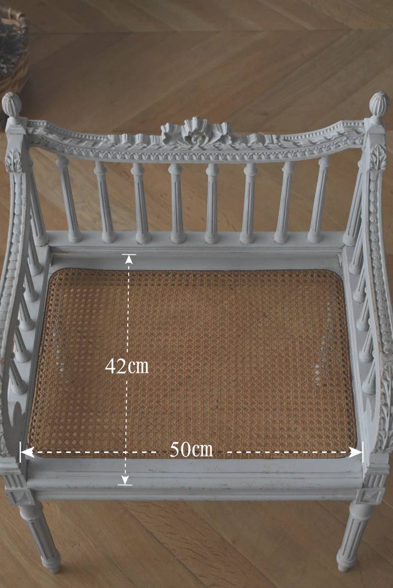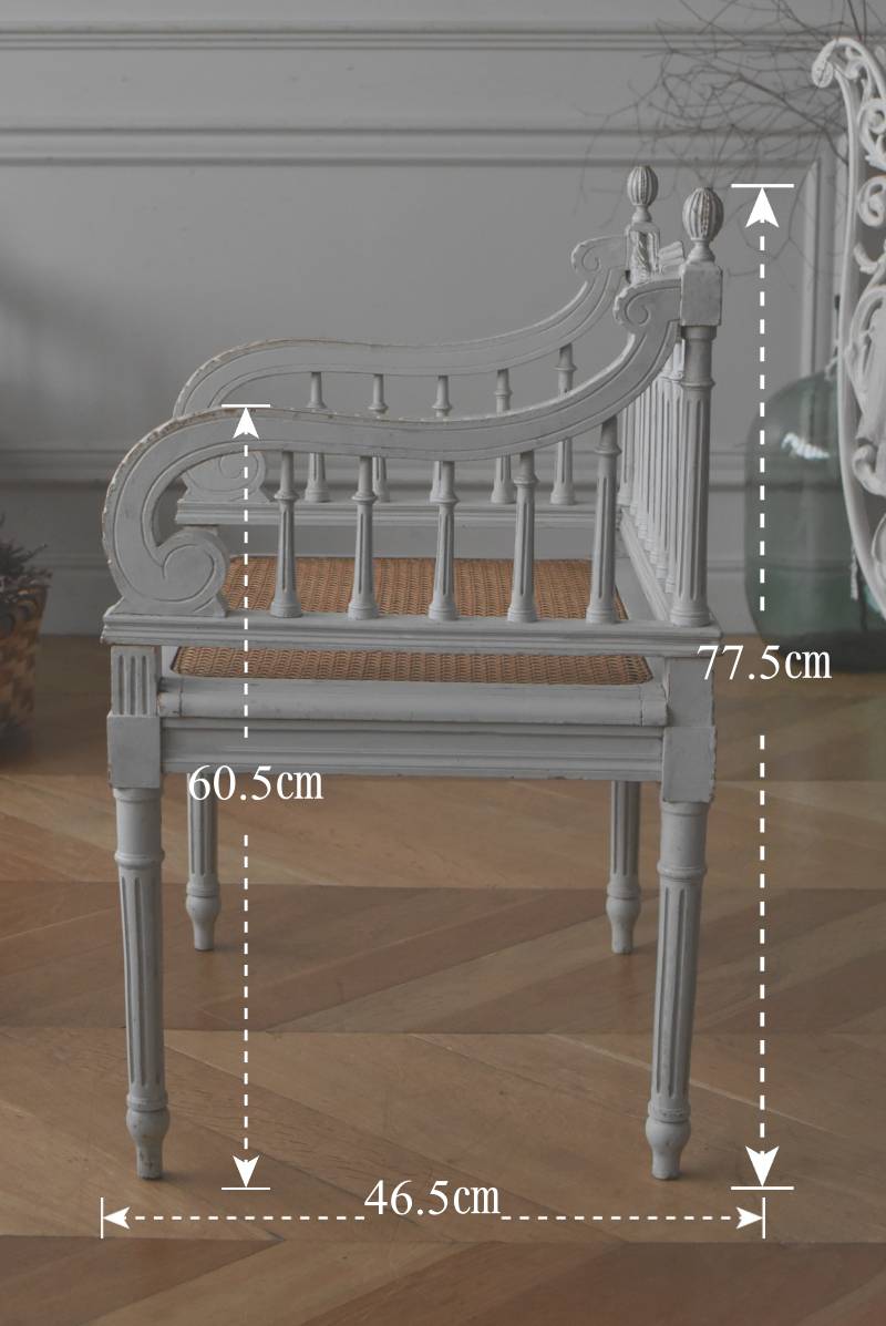 フランス.19世紀後半のアンティークアームチェア。 柱廊を連想させるような華奢な縦ラインで囲まれ、すっきりとした印象ながらもどこか風格のある佇まいです。背もたれトップには柔らかさが見事に表現されたリボン装飾も繊細で、緩やかな曲線を描くアームに施された細やかな連続模様を楽しめたりと洗練された美しさを感じられます。 ルイ16世スタイルならではの魅力がギュッと詰まっており、素材ならではのぬくもりのある座面の籐部分も買い付け当時のままのものとなりますが、しっかりとハリがあり目立つような穴あきなどはありません。同じデザインの アームチェア.Bがあり、それぞれでの販売となりますが、ペアとして揃えるのもおすすめです。 W 約57.5cm D 約46.5cm H 約77.5cm 座面までH 約40cm アームまでH 約60.5cm こちらの商品の配送について