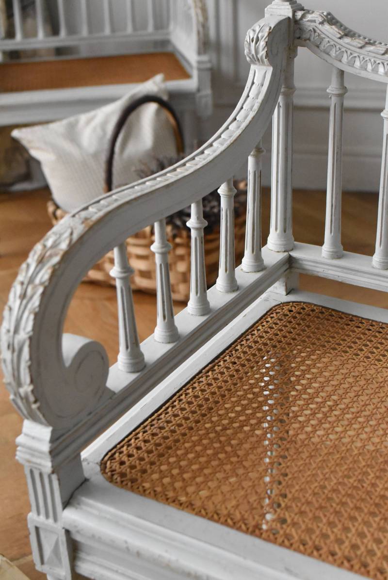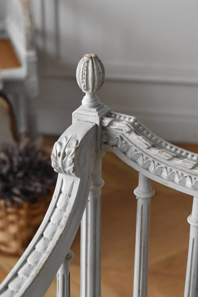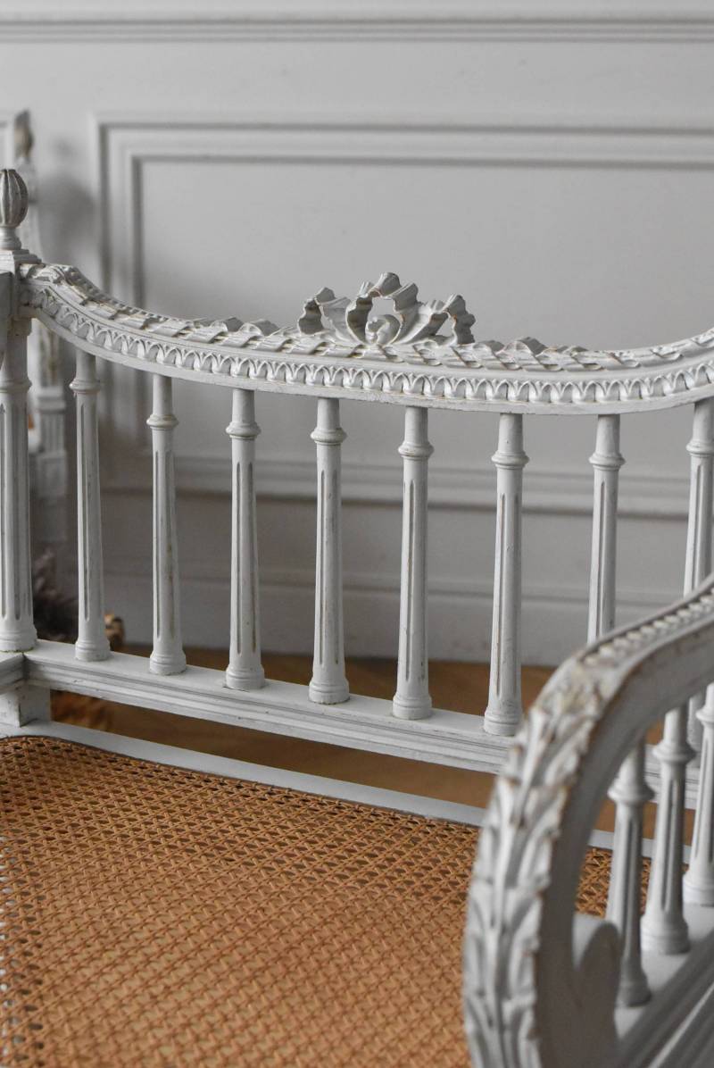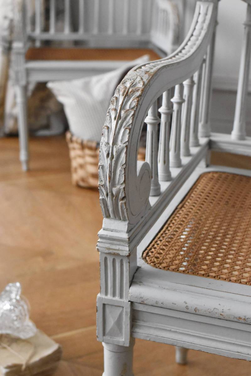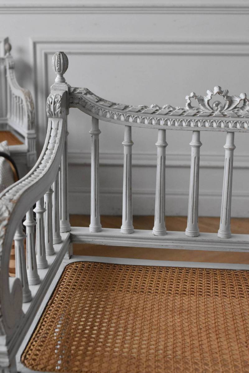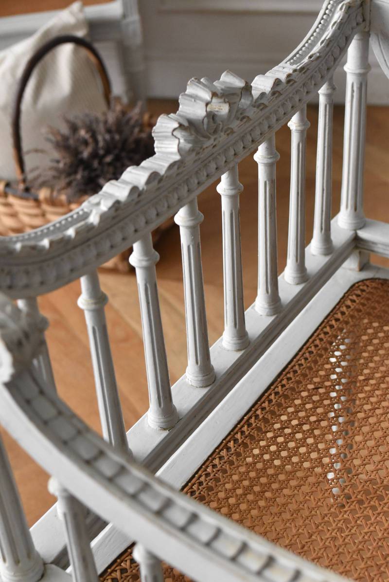 フランス.19世紀後半のアンティークアームチェア。 柱廊を連想させるような華奢な縦ラインで囲まれ、すっきりとした印象ながらもどこか風格のある佇まいです。背もたれトップには柔らかさが見事に表現されたリボン装飾も繊細で、緩やかな曲線を描くアームに施された細やかな連続模様を楽しめたりと洗練された美しさを感じられます。 ルイ16世スタイルならではの魅力がギュッと詰まっており、素材ならではのぬくもりのある座面の籐部分も買い付け当時のままのものとなりますが、しっかりとハリがあり目立つような穴あきなどはありません。同じデザインの アームチェア.Bがあり、それぞれでの販売となりますが、ペアとして揃えるのもおすすめです。 W 約57.5cm D 約46.5cm H 約77.5cm 座面までH 約40cm アームまでH 約60.5cm こちらの商品の配送について