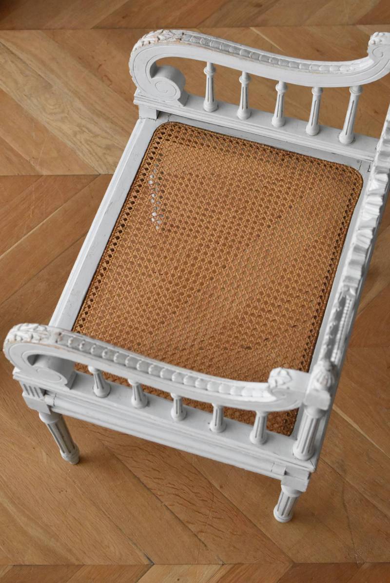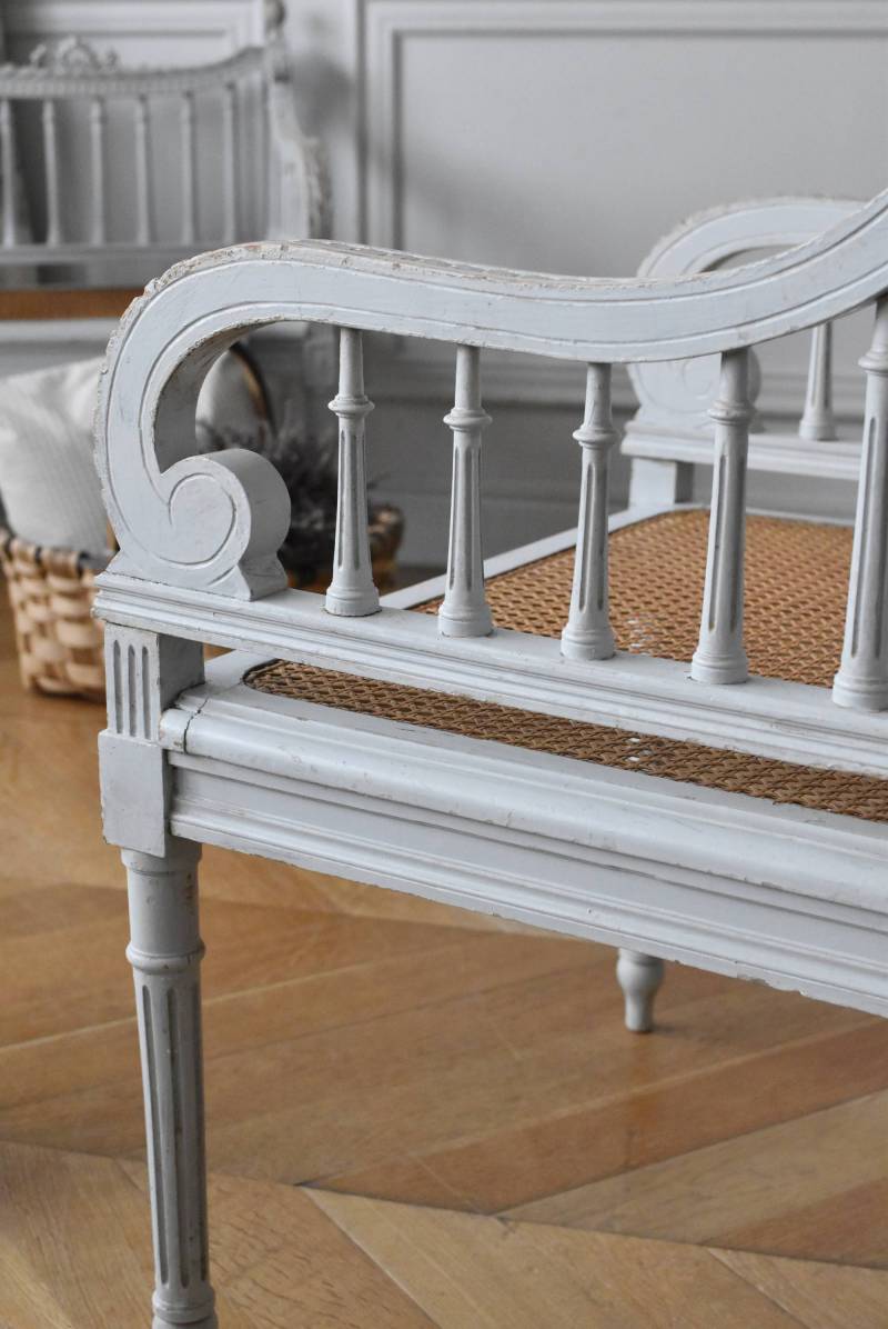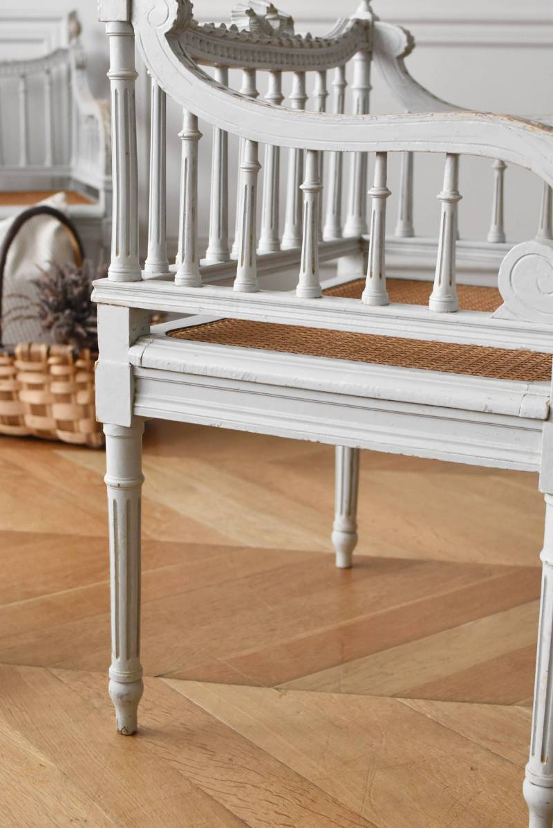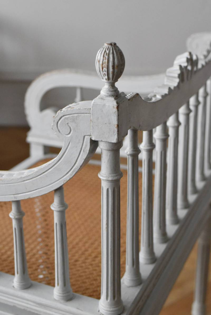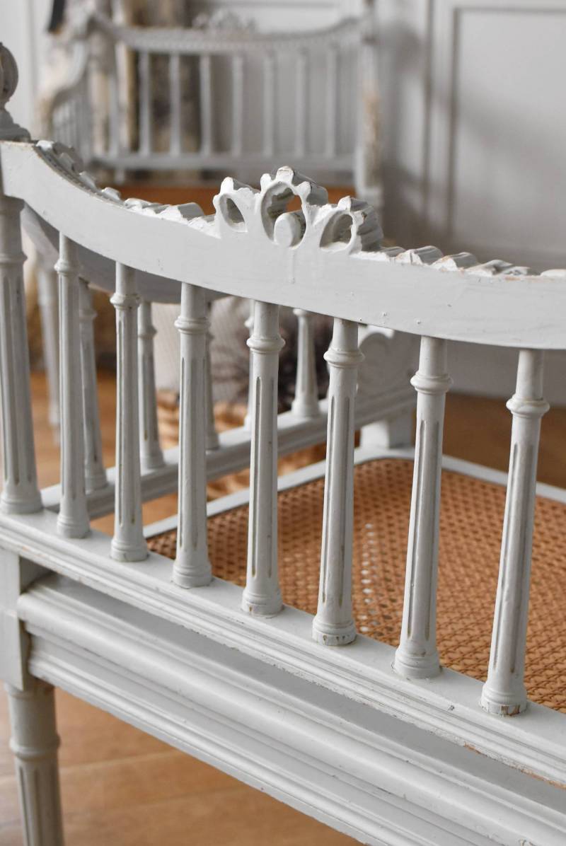 フランス.19世紀後半のアンティークアームチェア。 柱廊を連想させるような華奢な縦ラインで囲まれ、すっきりとした印象ながらもどこか風格のある佇まいです。背もたれトップには柔らかさが見事に表現されたリボン装飾も繊細で、緩やかな曲線を描くアームに施された細やかな連続模様を楽しめたりと洗練された美しさを感じられます。 ルイ16世スタイルならではの魅力がギュッと詰まっており、素材ならではのぬくもりのある座面の籐部分も買い付け当時のままのものとなりますが、しっかりとハリがあり目立つような穴あきなどはありません。同じデザインの アームチェア.Bがあり、それぞれでの販売となりますが、ペアとして揃えるのもおすすめです。 W 約57.5cm D 約46.5cm H 約77.5cm 座面までH 約40cm アームまでH 約60.5cm こちらの商品の配送について