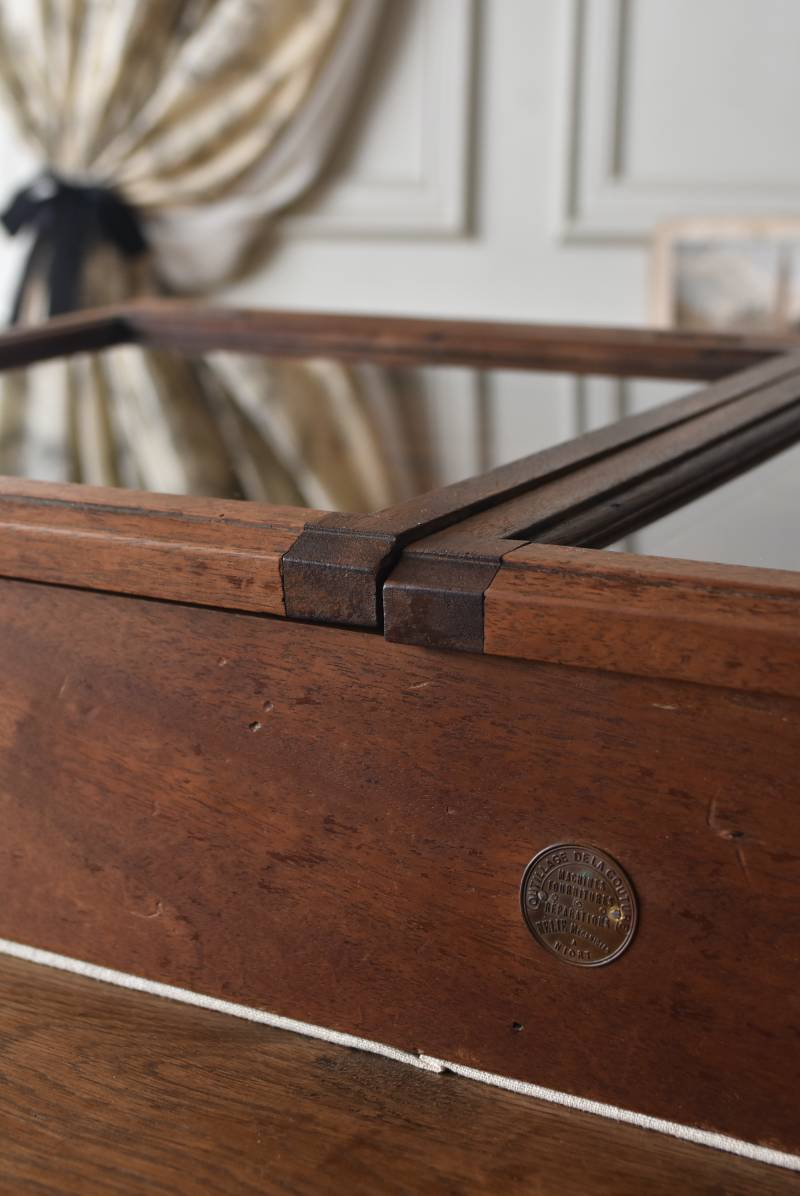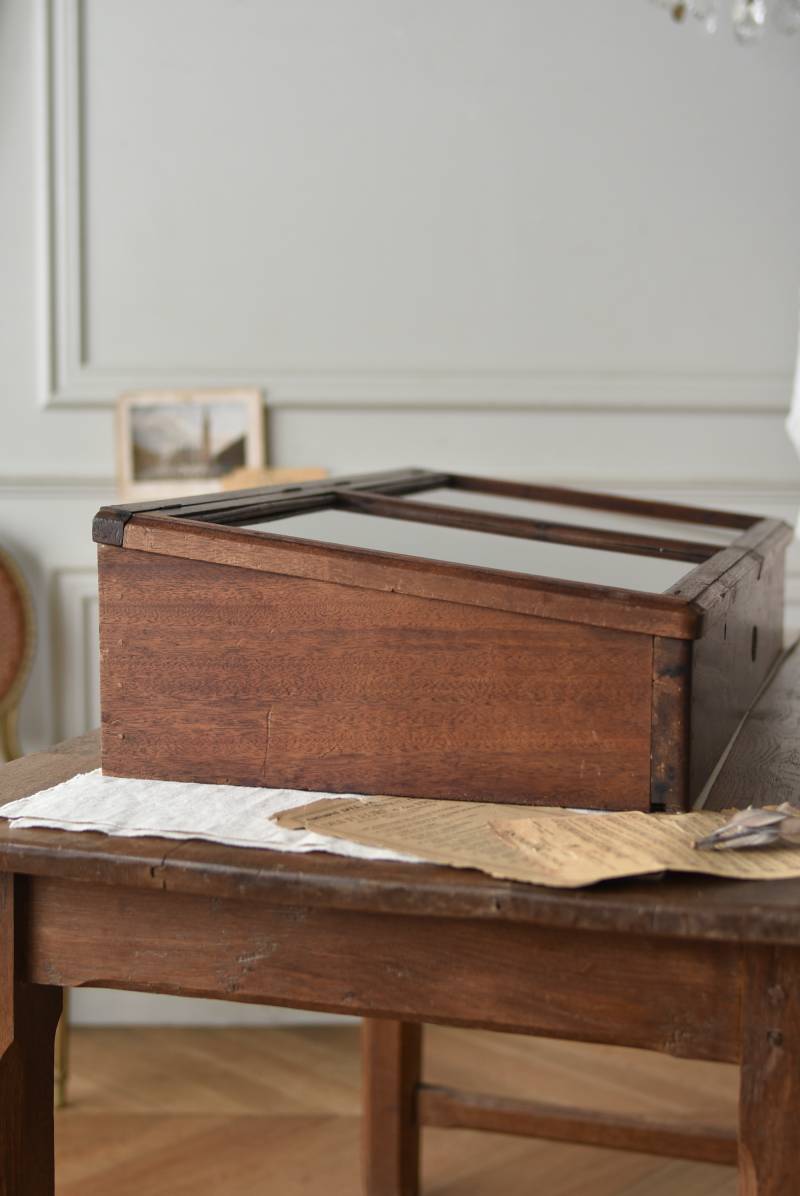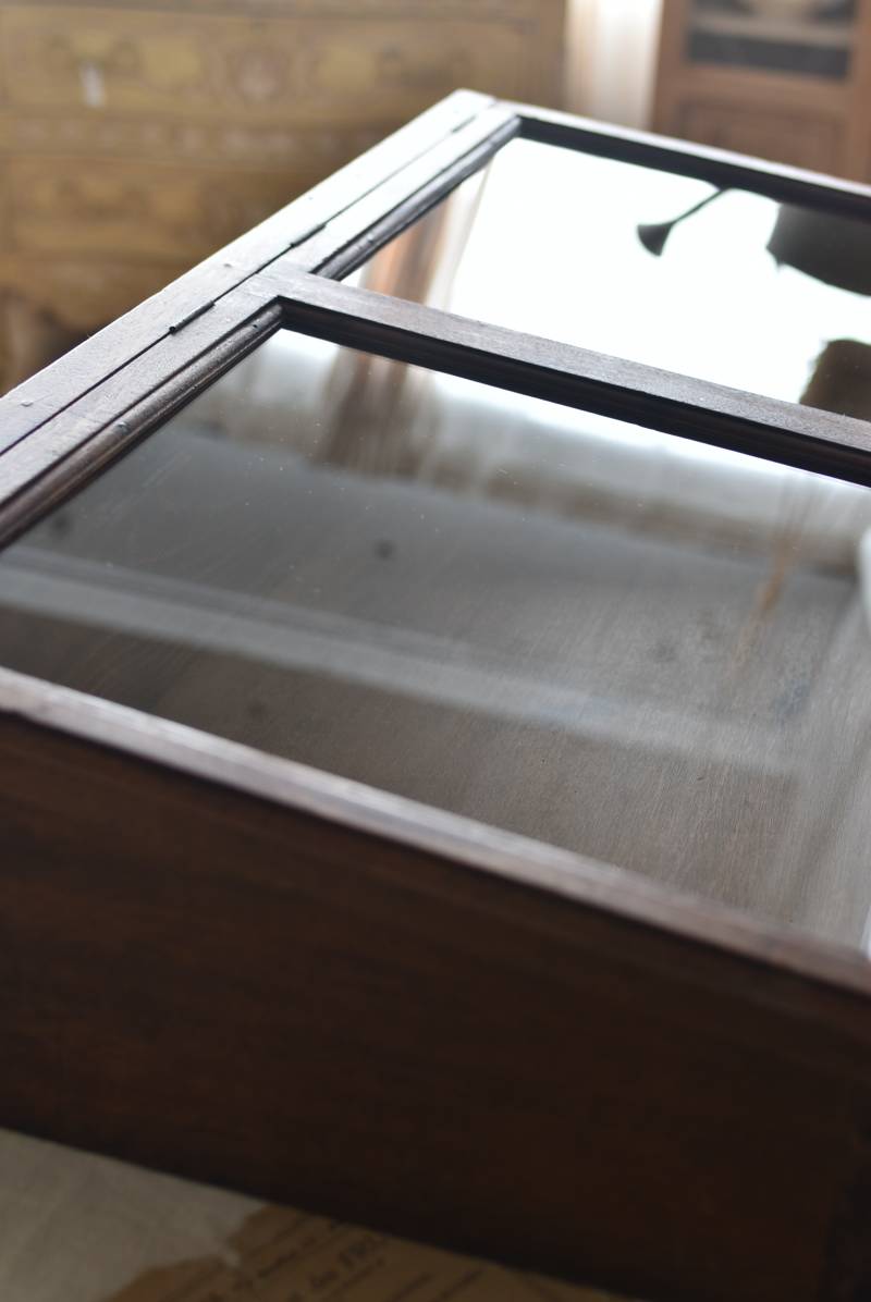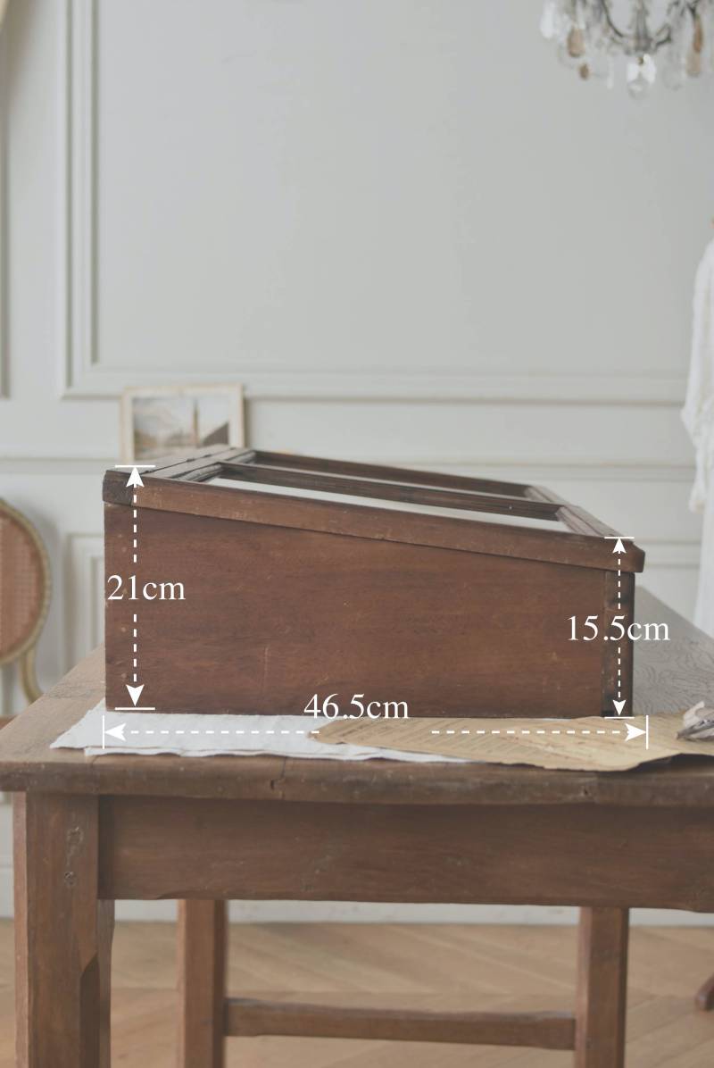フランスのアンティークショーケース。 こっくりとしたブラウンカラーのボディは長く使い込まれてきた濃淡ある表情で、深みのある重厚な佇まい。ガラス扉は2つに区切られているので出し入れもしやすく、手前がやや低い形状で卓上でも中のものを確認しやすいデザインとなっています。正面には金属製の丸いラベルが取り付けられており、おそらくフランス・ニオールのお店で使われていたもの。 華美すぎないシンプルな姿で中に飾ったものをより素敵に魅せ、ショップ什器としてもしっかりと活躍してくれるアイテムです。 ディスプレイで底に敷いた黒のファブリックなどは付属しません。 W 約90cm D 約46.5cm H 約21cm 内寸 W約83.3cm×D約39.7cm×深さ約12~17cm こちらの商品の配送について