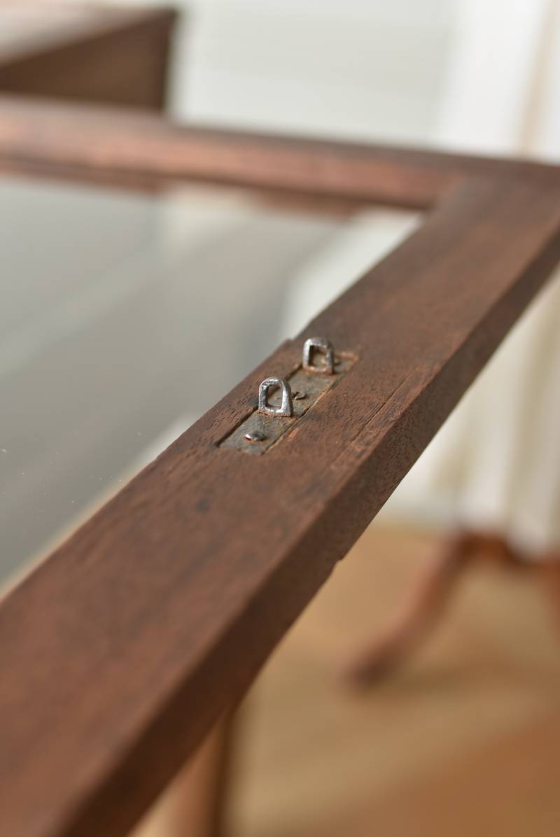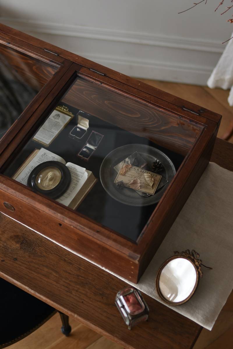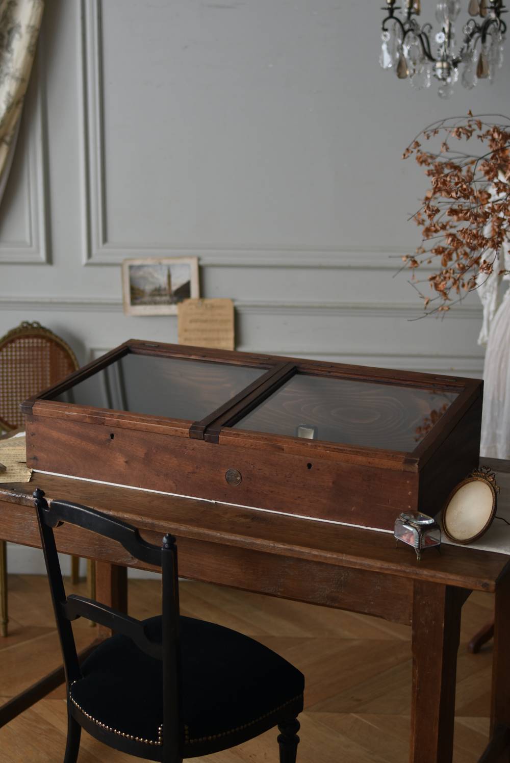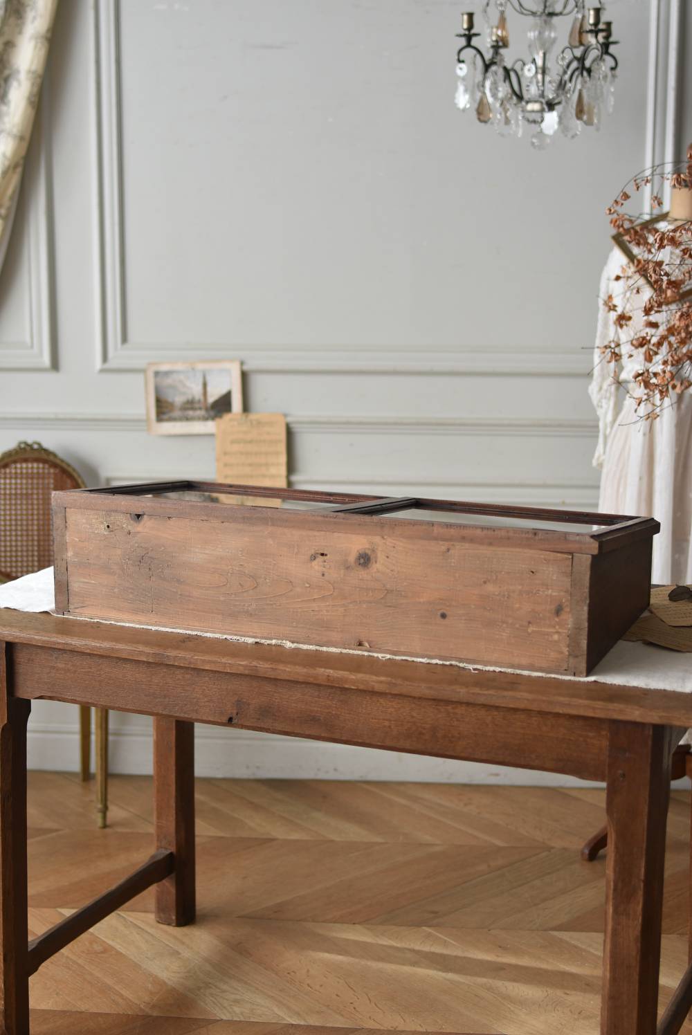 フランスのアンティークショーケース。 こっくりとしたブラウンカラーのボディは長く使い込まれてきた濃淡ある表情で、深みのある重厚な佇まい。ガラス扉は2つに区切られているので出し入れもしやすく、手前がやや低い形状で卓上でも中のものを確認しやすいデザインとなっています。正面には金属製の丸いラベルが取り付けられており、おそらくフランス・ニオールのお店で使われていたもの。 華美すぎないシンプルな姿で中に飾ったものをより素敵に魅せ、ショップ什器としてもしっかりと活躍してくれるアイテムです。 ディスプレイで底に敷いた黒のファブリックなどは付属しません。 W 約90cm D 約46.5cm H 約21cm 内寸 W約83.3cm×D約39.7cm×深さ約12~17cm こちらの商品の配送について