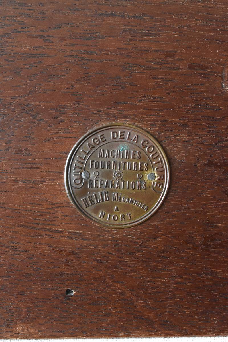 金属製のラベルには『裁縫道具』『機械修理』などの文字と『HELIE(名称)』『NIORT(ニオール)』などの情報が刻印されています。