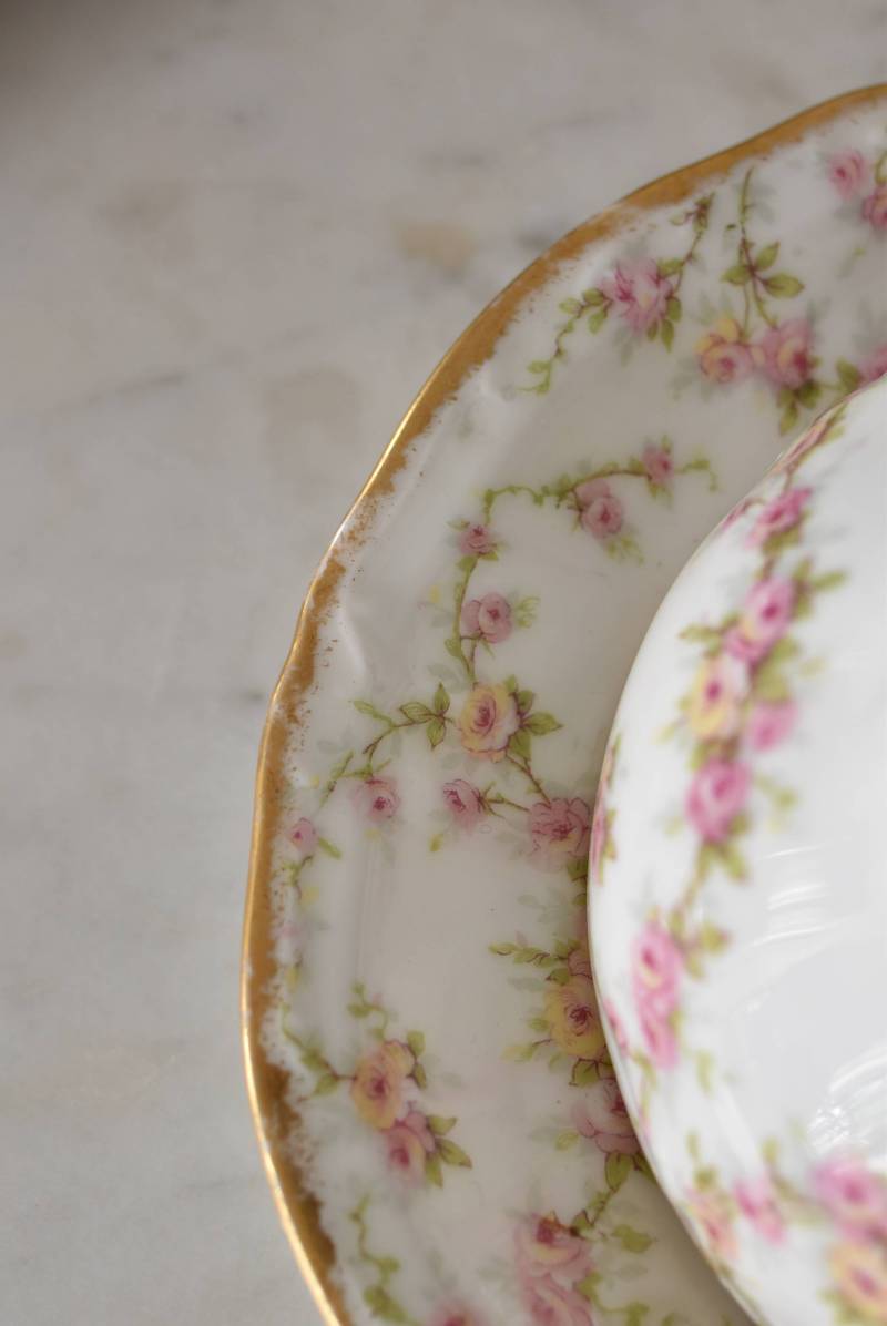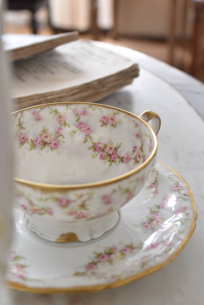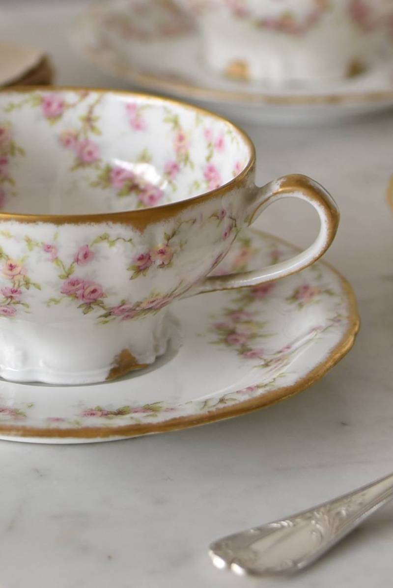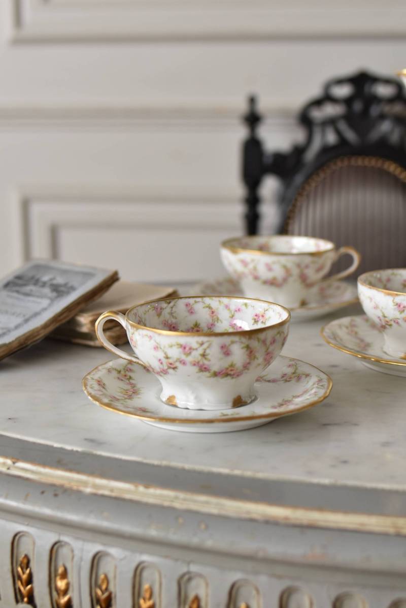フランス・Emile Bourgeois(エミールブルジョワ)のティーカップ&ソーサー。 淡いピンクやイエローに色づいた薔薇のようなお花が連なり、しなやかに流れるような曲線が多用されたフェミニンな雰囲気を纏っています。ゴールドによって縁取られた気品高い姿で、よく見ると繊細な植物レリーフが合わさっており、思わず眺めていたくなるようなデザインです。 金彩模様の擦れなどはありますが、目立つようなカケはありません。カップ内側までもデザインされた華やかさがあり、卓上に彩りをもたらしてくれます。それぞれでの販売となりますが、同じシリーズの食器で揃える事が出来ます。 Emile Bourgeois カップ W 約11.5cm D 約9.5cm H 約5cm ソーサのサイズ 直径 約14.5cm H 約1.8cm