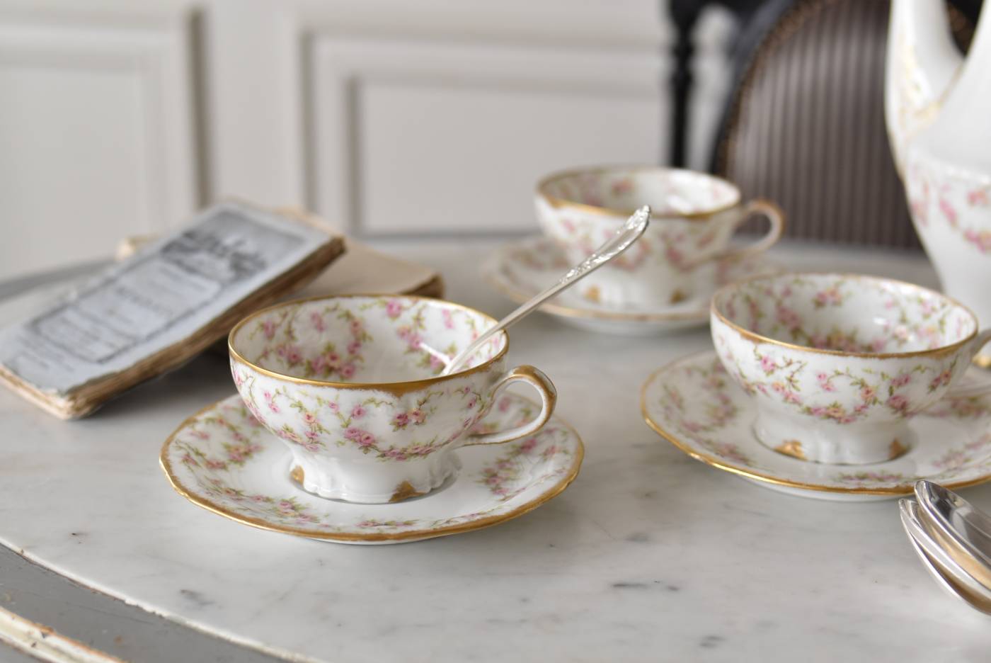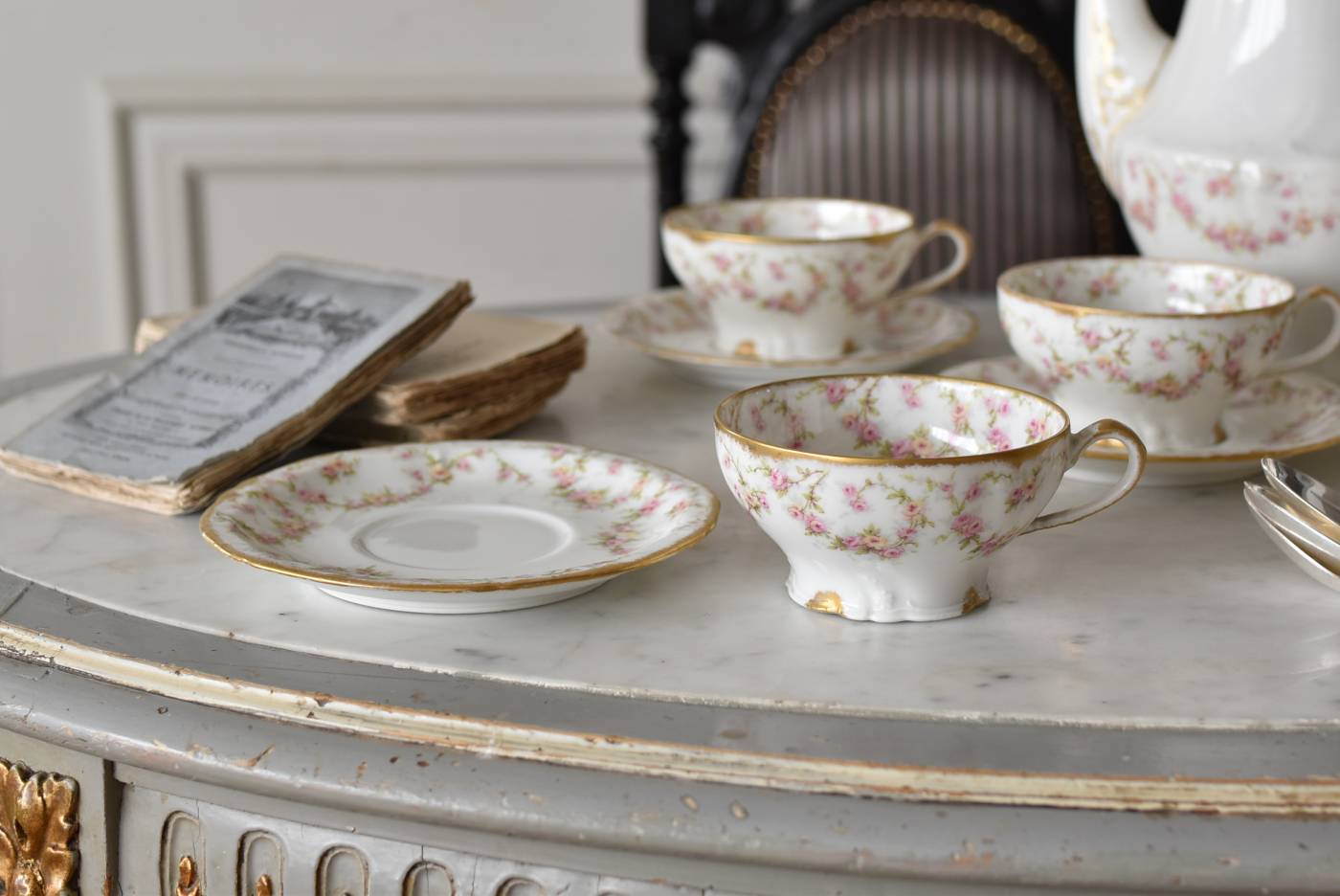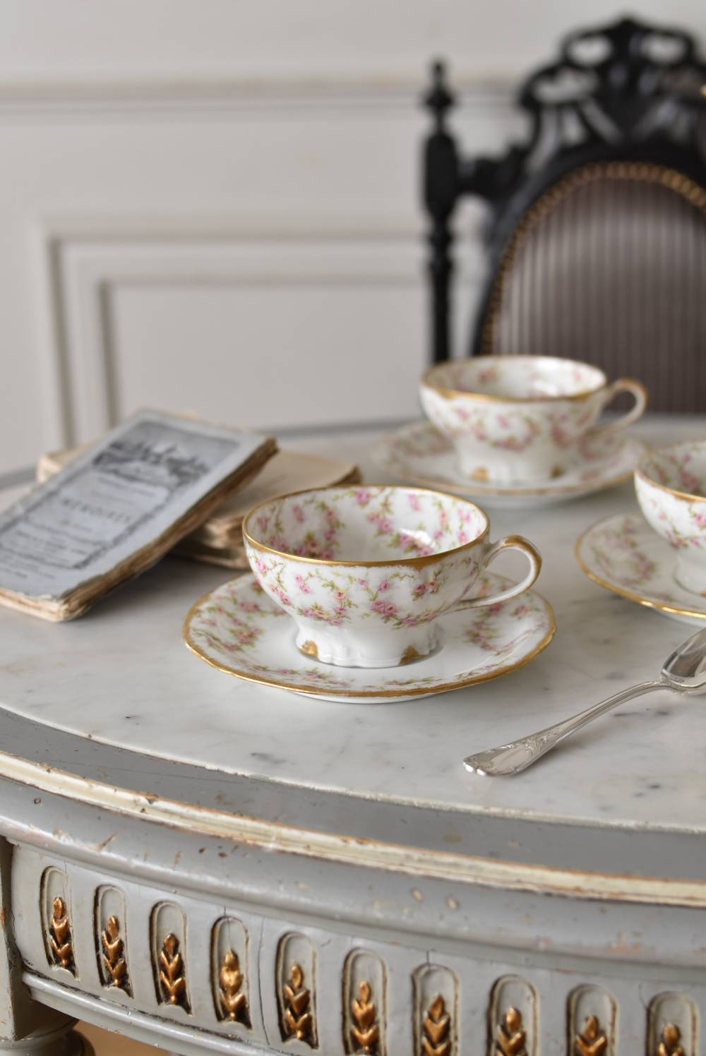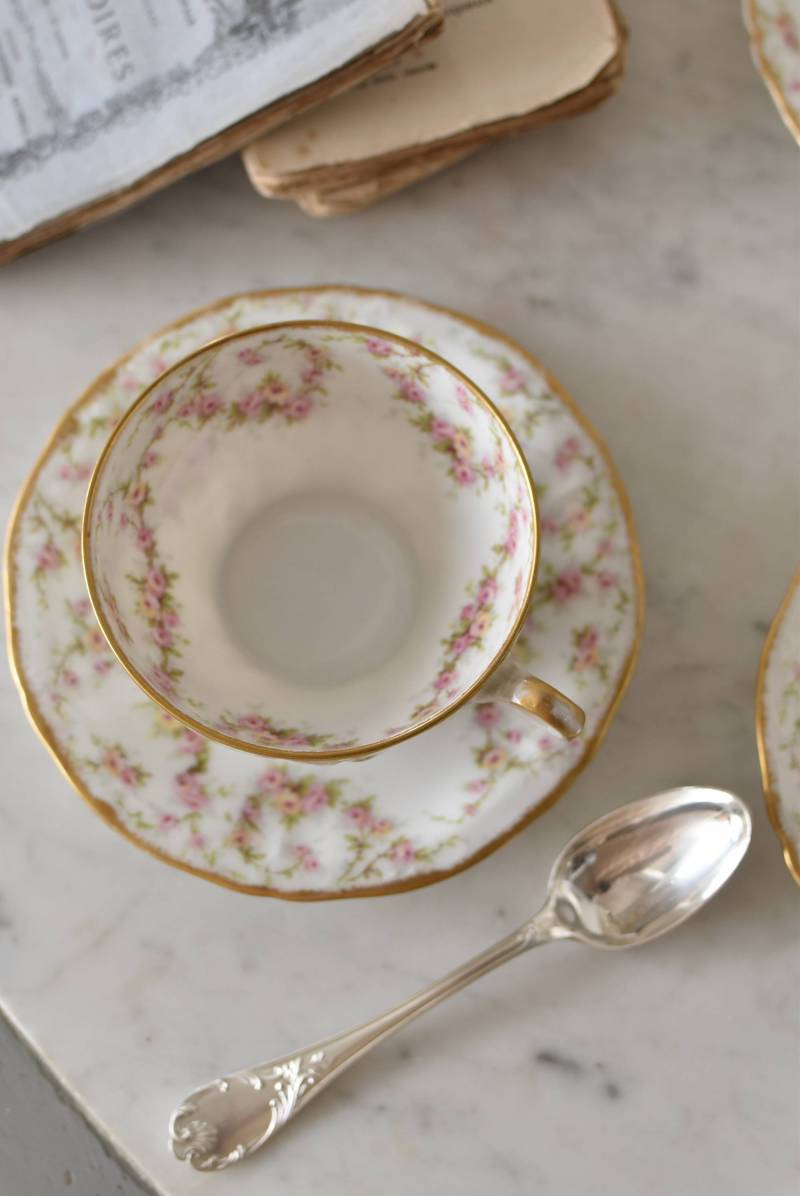 フランス・Emile Bourgeois(エミールブルジョワ)のティーカップ&ソーサー。 淡いピンクやイエローに色づいた薔薇のようなお花が連なり、しなやかに流れるような曲線が多用されたフェミニンな雰囲気を纏っています。ゴールドによって縁取られた気品高い姿で、よく見ると繊細な植物レリーフが合わさっており、思わず眺めていたくなるようなデザインです。 金彩模様の擦れなどはありますが、目立つようなカケはありません。カップ内側までもデザインされた華やかさがあり、卓上に彩りをもたらしてくれます。それぞれでの販売となりますが、同じシリーズの食器で揃える事が出来ます。 Emile Bourgeois カップ W 約11.5cm D 約9.5cm H 約5cm ソーサのサイズ 直径 約14.5cm H 約1.8cm