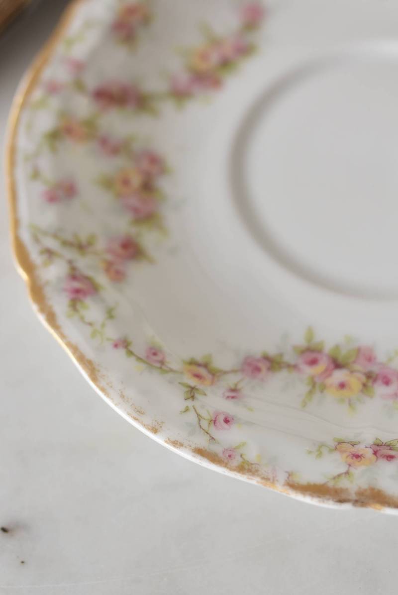フランス・Emile Bourgeois(エミールブルジョワ)のティーカップ&ソーサー。 淡いピンクやイエローに色づいた薔薇のようなお花が連なり、しなやかに流れるような曲線が多用されたフェミニンな雰囲気を纏っています。ゴールドによって縁取られた気品高い姿で、よく見ると繊細な植物レリーフが合わさっており、思わず眺めていたくなるようなデザインです。 金彩模様の擦れなどはありますが、目立つようなカケはありません。カップ内側までもデザインされた華やかさがあり、卓上に彩りをもたらしてくれます。それぞれでの販売となりますが、同じシリーズの食器で揃える事が出来ます。 Emile Bourgeois カップ W 約11.5cm D 約9.5cm H 約5cm ソーサのサイズ 直径 約14.5cm H 約1.8cm