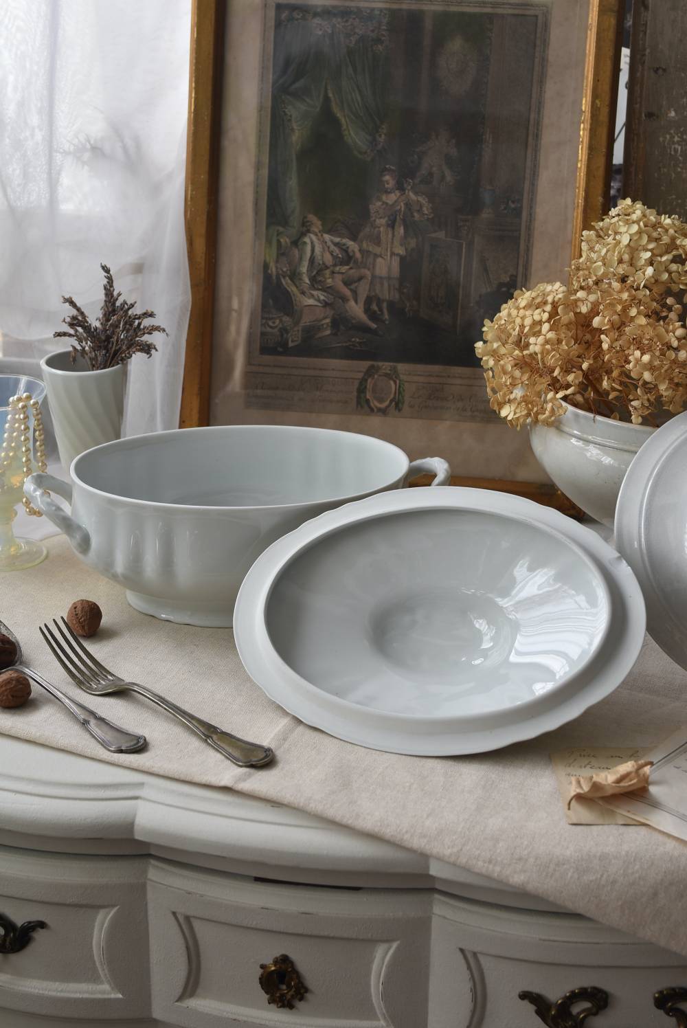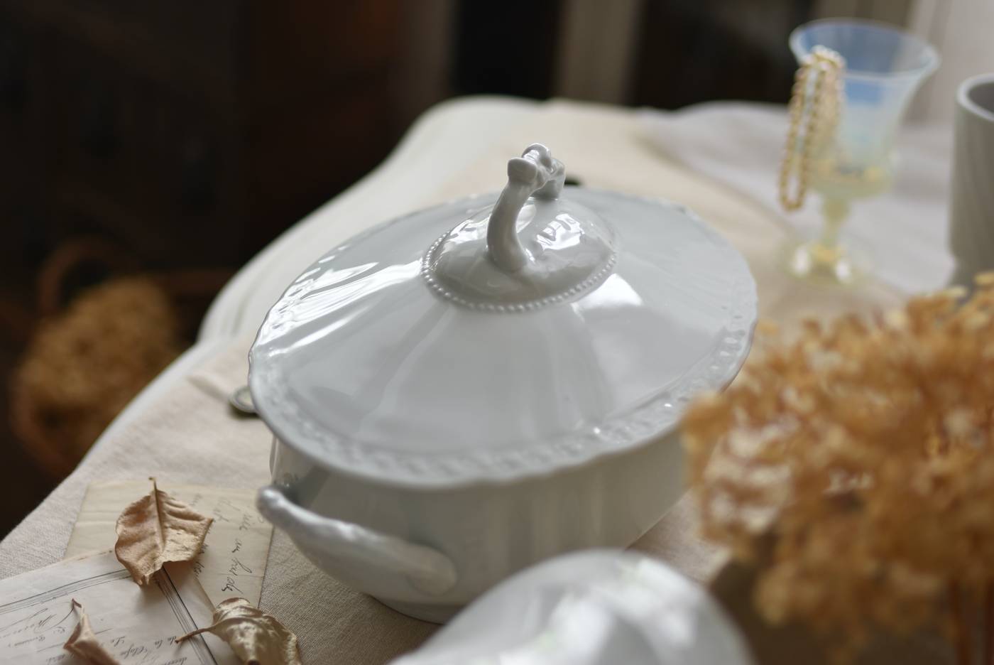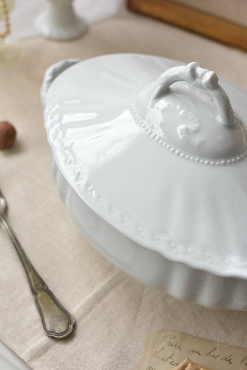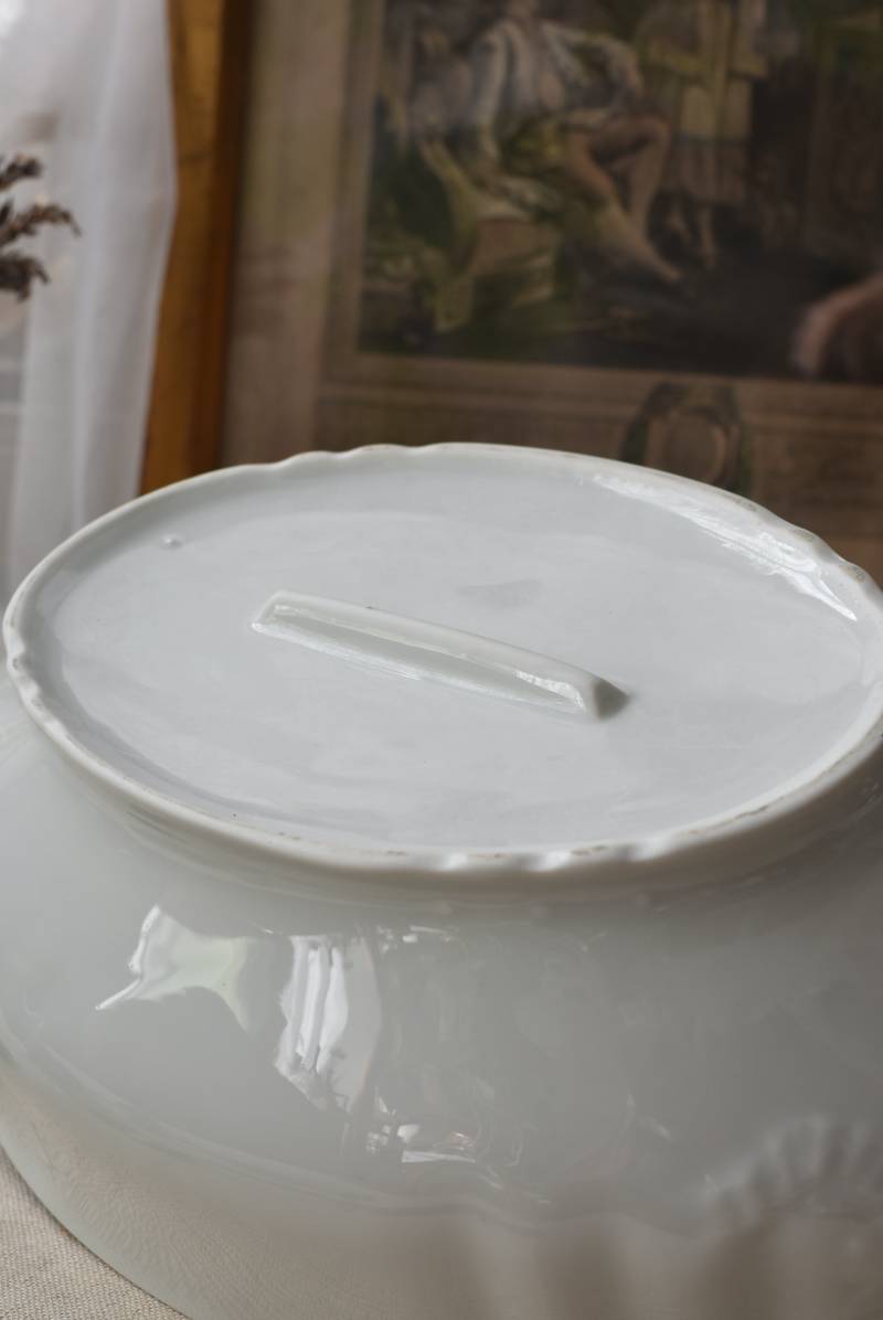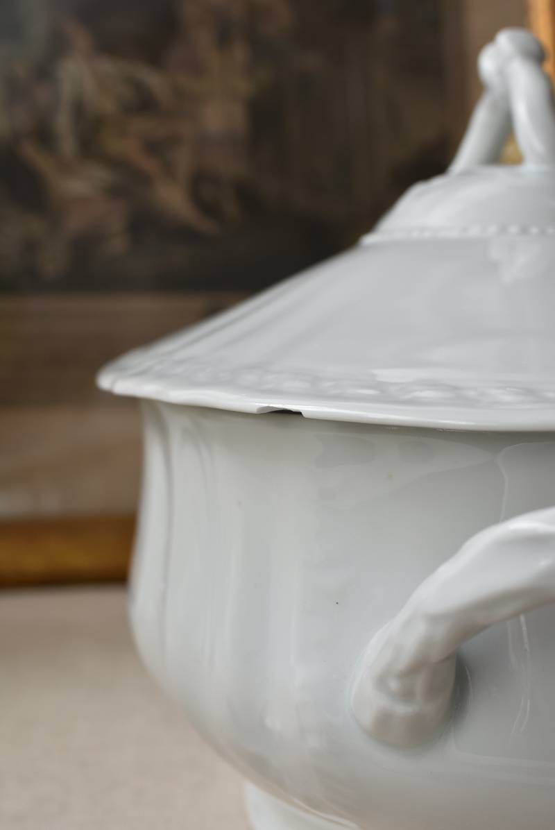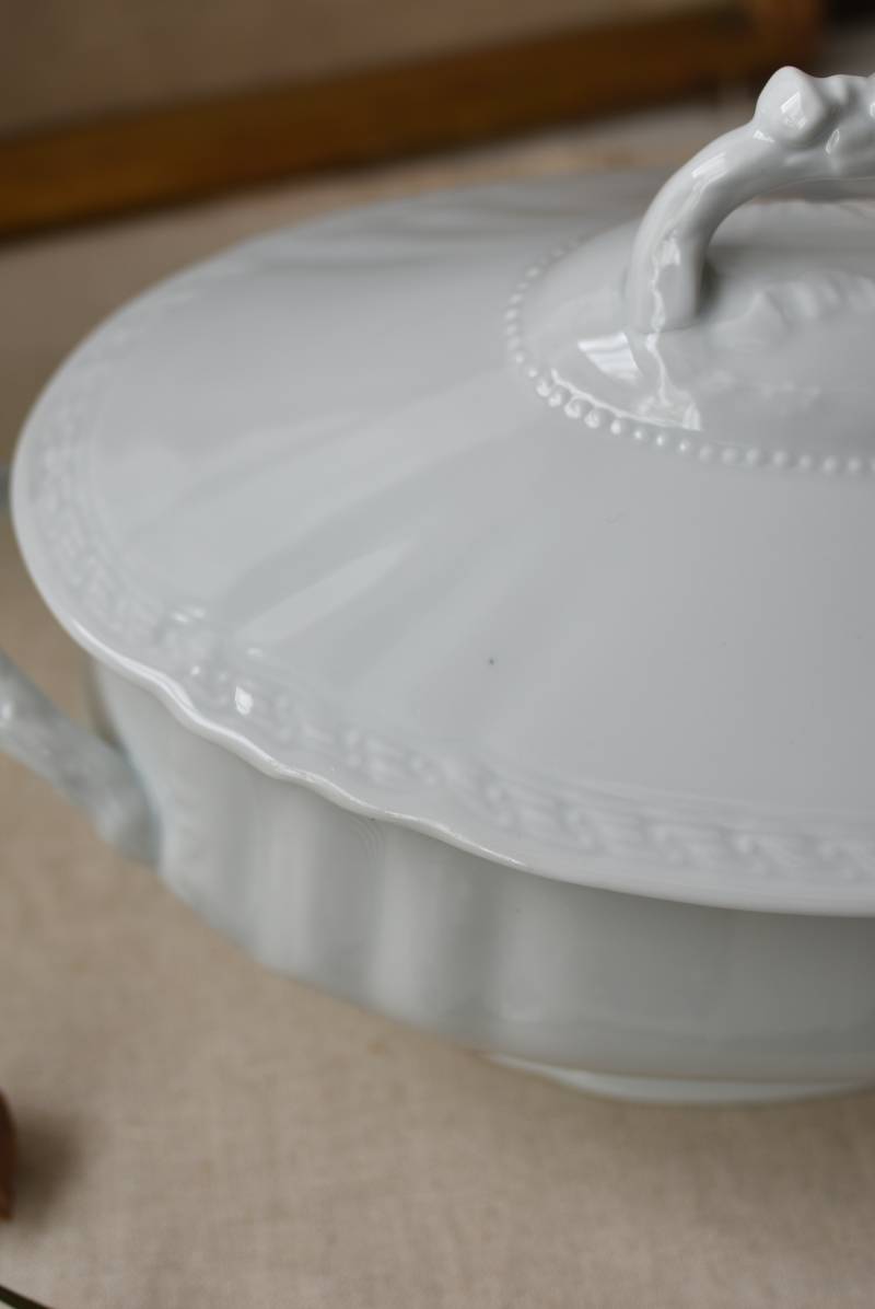 艶やかな磁器製のボディはやや横長シルエットで、両サイドに華奢なハンドルがあしらわれた優美な佇まい。リボンやパールレリーフ、植物を模した細やかな装飾が可憐な印象をもたらし、表面のさりげない波打ちラインが独自の表情を楽しませてくれるデザインです。蓋の裏縁に欠けが見受けられます。