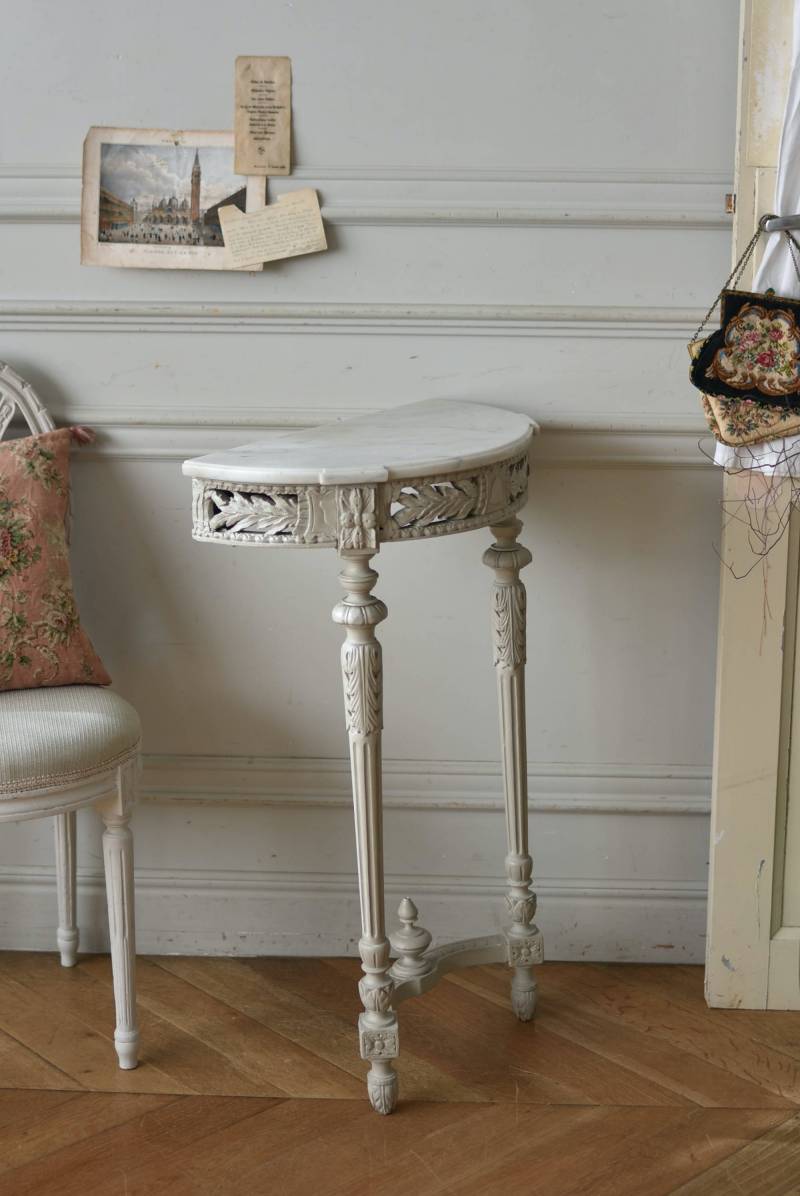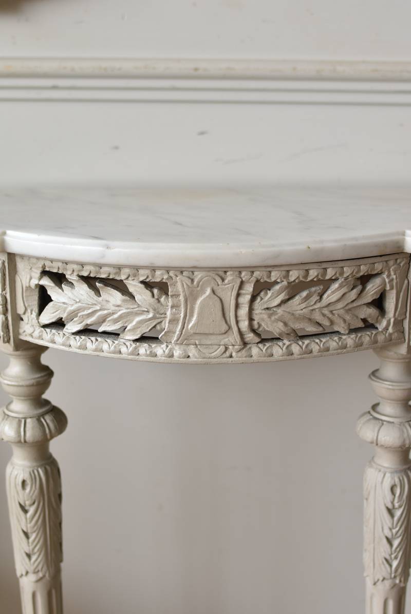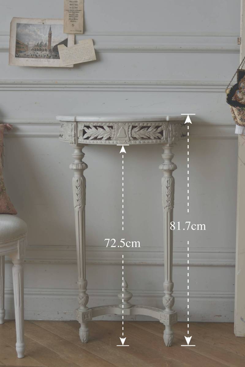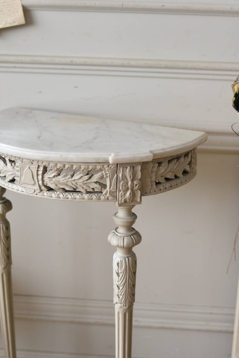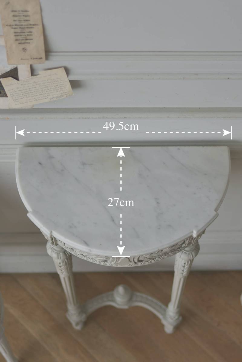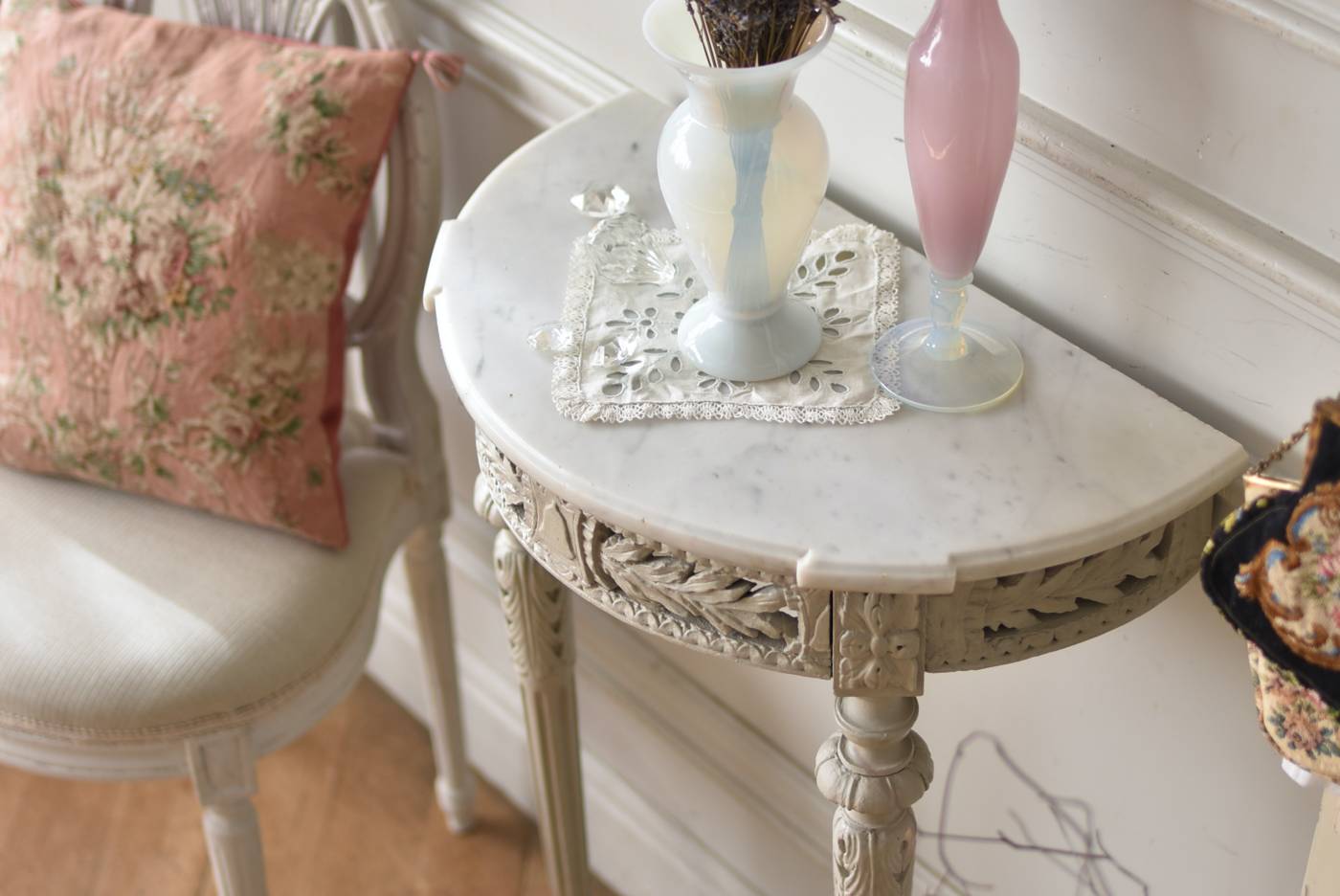フランスのアンティークコンソールテーブル。 天板にホワイトを基調とした半月型のマーブルストーンがあしらわれ、素材ならではの高級感を楽しめる佇まい。ベルやアカンサスの葉をモチーフとした彫り模様や幕板部の透かし彫りが美しく、インテリアとしても絵になる装飾的なデザインです。 天板はボディに固定されており動きません。脚元に多少の歪み、天板にキズやシミ、亀裂が見受けられます。 比較的コンパクトなサイズで空間に取り入れやすく、背面の金具で壁面に固定して気品高い壁面ディスプレイを演出してくれるアイテムです。 W 約49.5cm D 約27cm H 約81.7cm 幕板までのH 約72.5cm こちらの商品の配送について