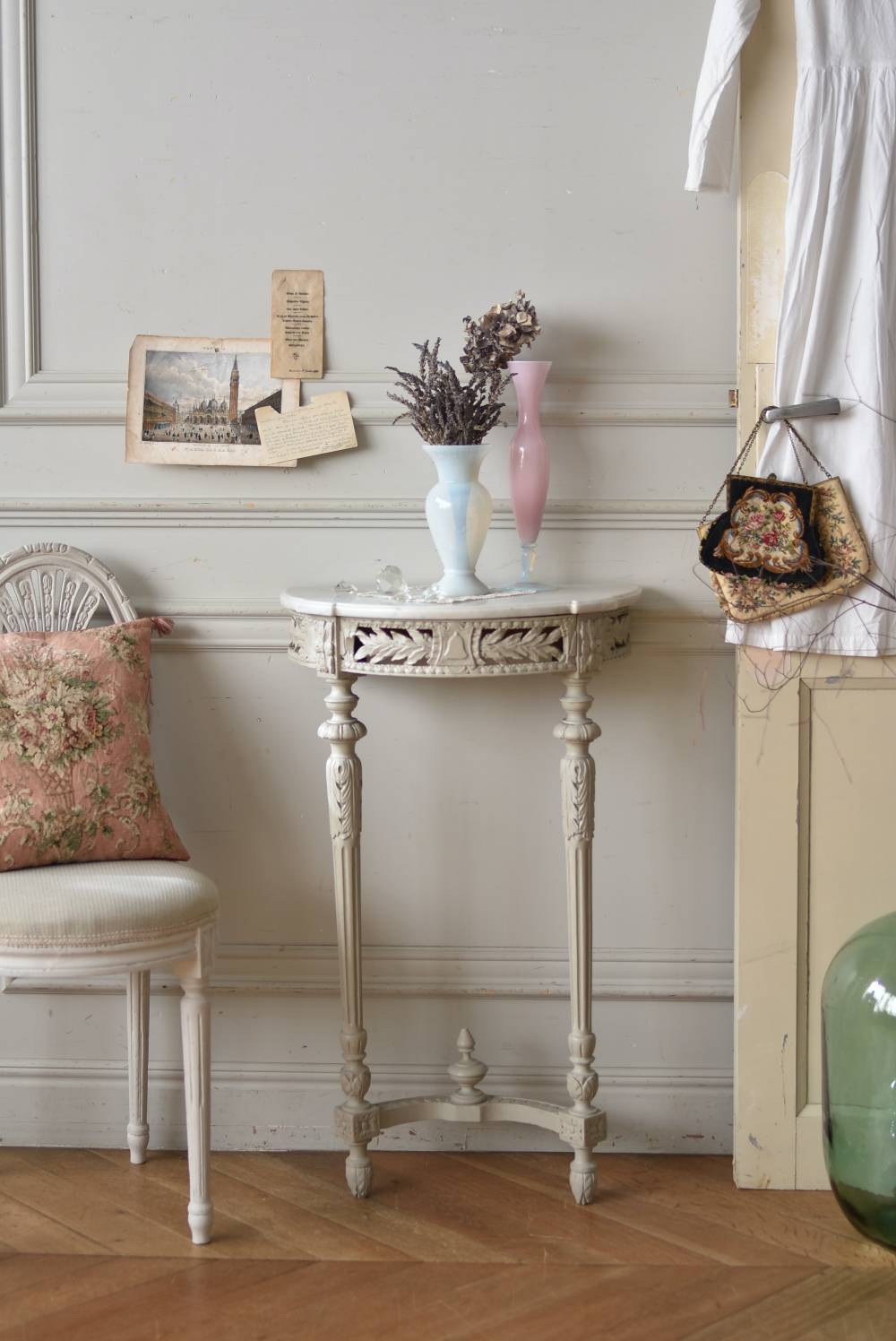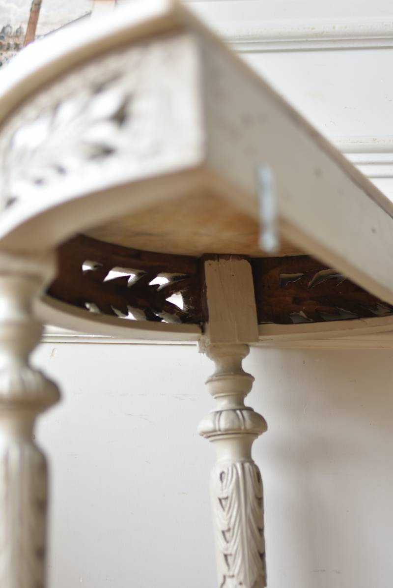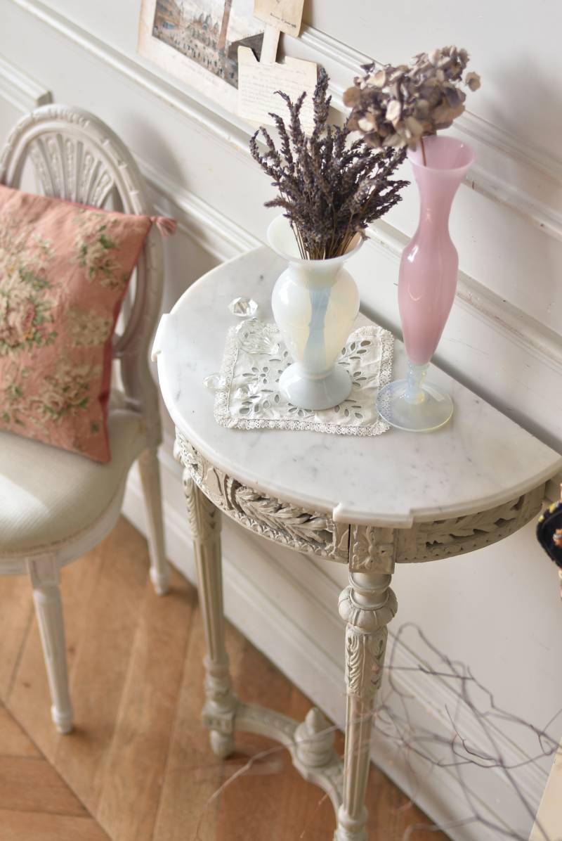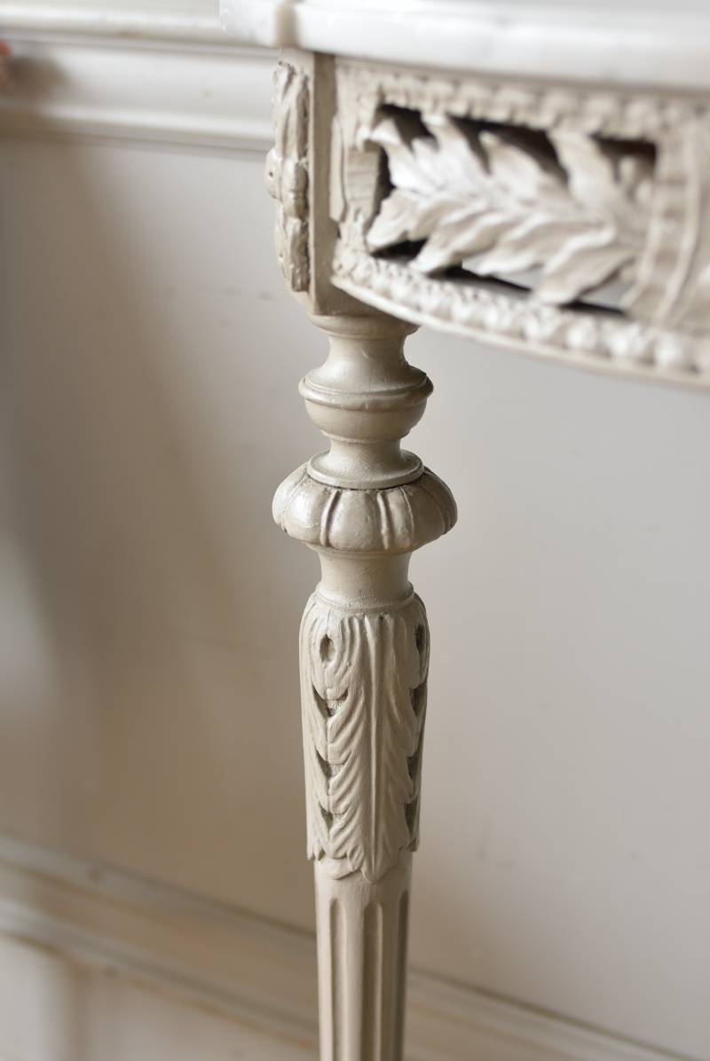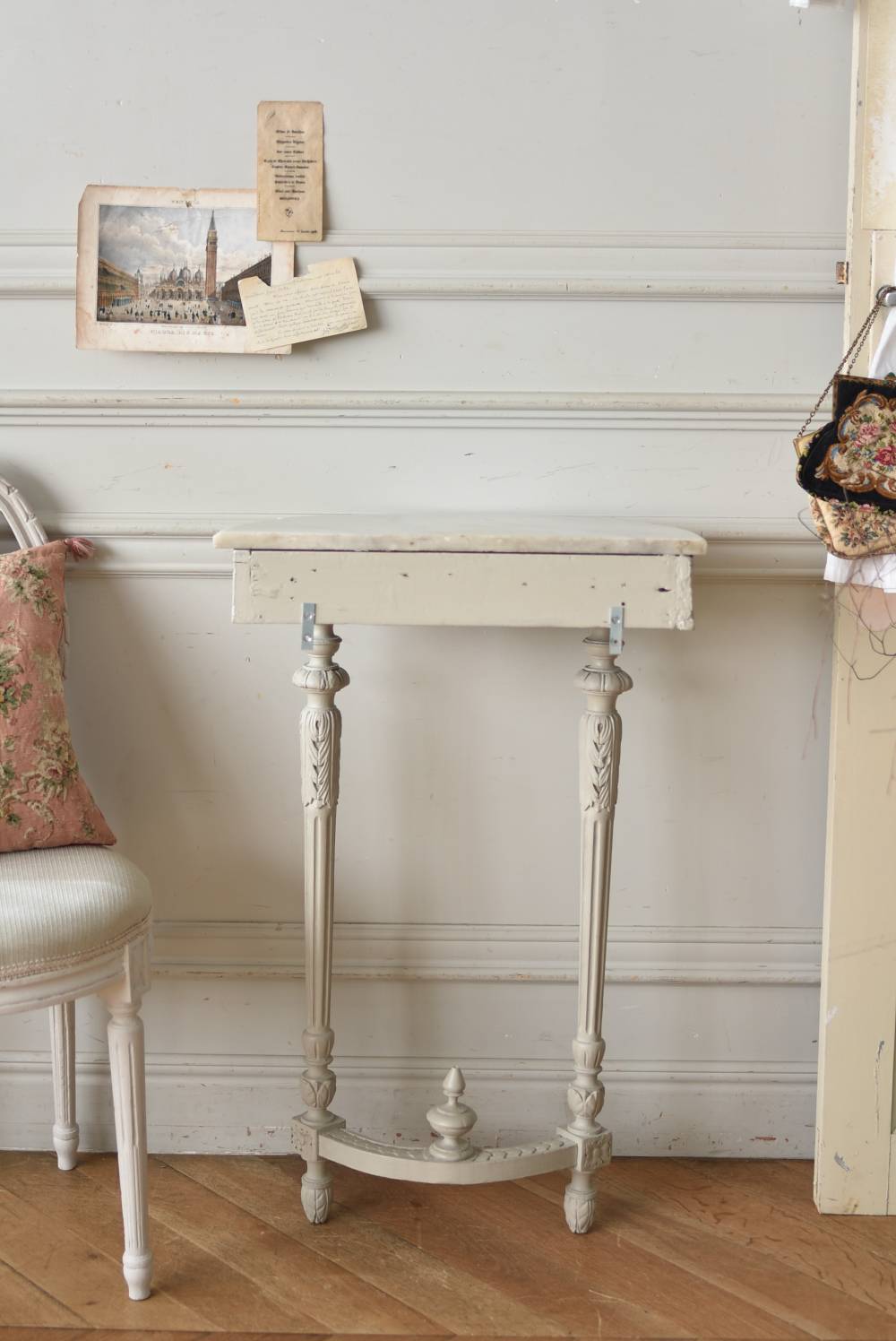 フランスのアンティークコンソールテーブル。 天板にホワイトを基調とした半月型のマーブルストーンがあしらわれ、素材ならではの高級感を楽しめる佇まい。ベルやアカンサスの葉をモチーフとした彫り模様や幕板部の透かし彫りが美しく、インテリアとしても絵になる装飾的なデザインです。 天板はボディに固定されており動きません。脚元に多少の歪み、天板にキズやシミ、亀裂が見受けられます。 比較的コンパクトなサイズで空間に取り入れやすく、背面の金具で壁面に固定して気品高い壁面ディスプレイを演出してくれるアイテムです。 W 約49.5cm D 約27cm H 約81.7cm 幕板までのH 約72.5cm こちらの商品の配送について