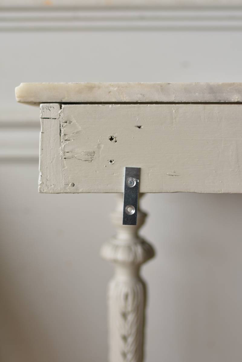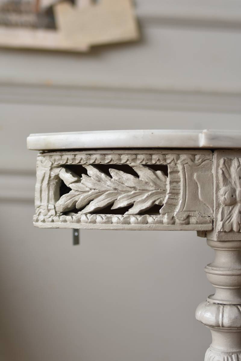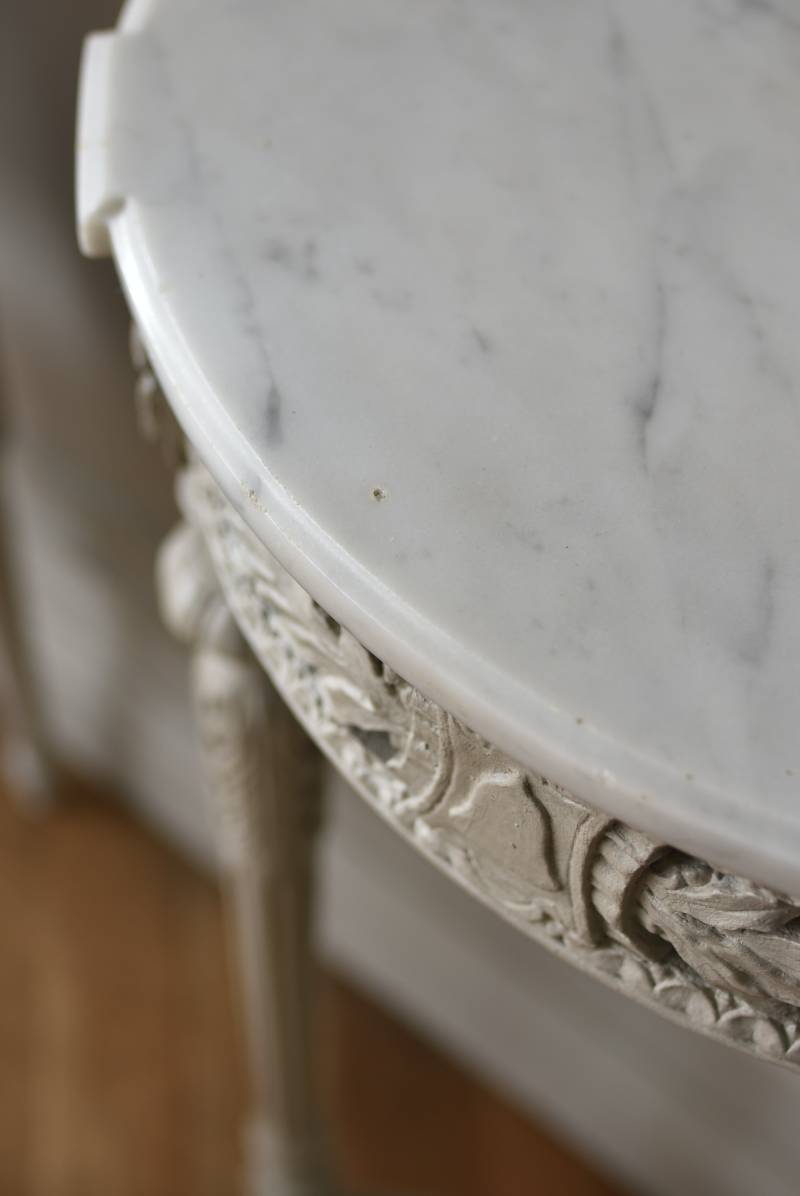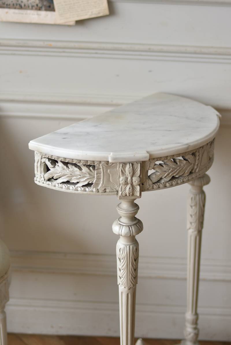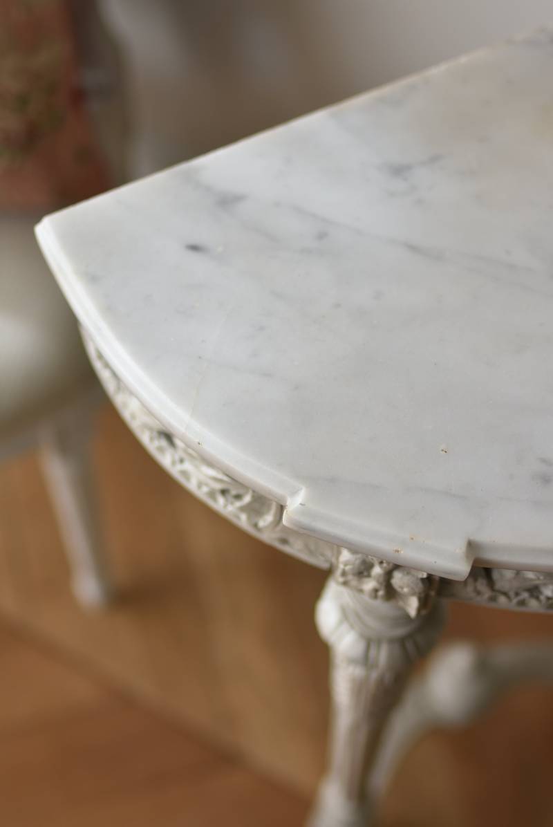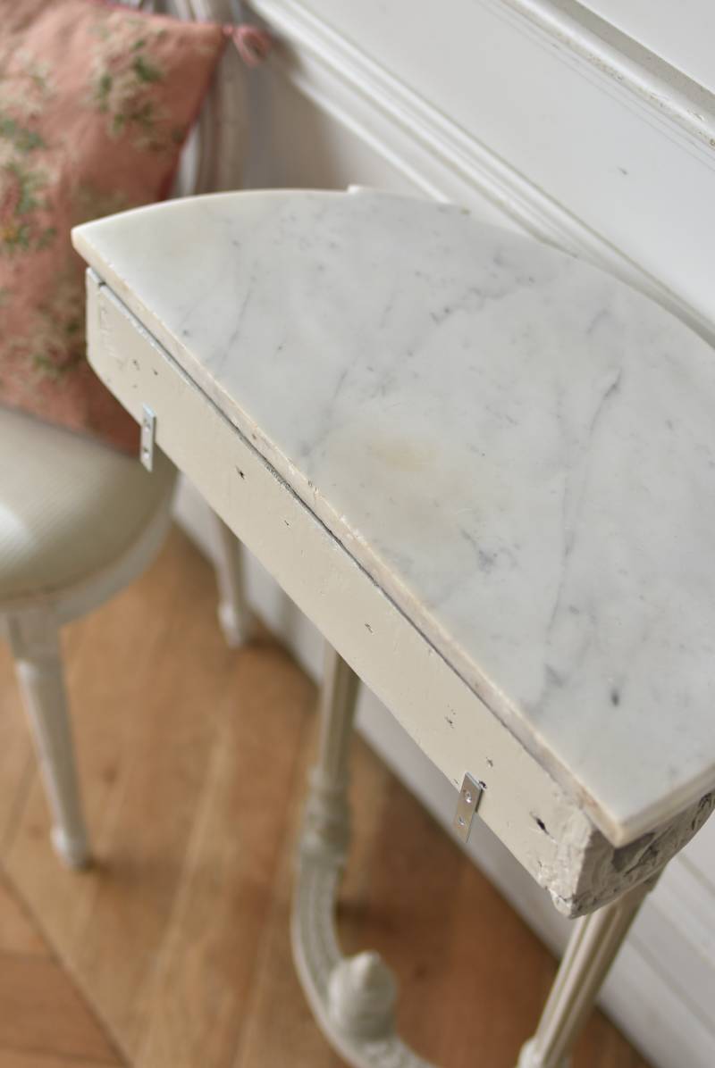 フランスのアンティークコンソールテーブル。 天板にホワイトを基調とした半月型のマーブルストーンがあしらわれ、素材ならではの高級感を楽しめる佇まい。ベルやアカンサスの葉をモチーフとした彫り模様や幕板部の透かし彫りが美しく、インテリアとしても絵になる装飾的なデザインです。 天板はボディに固定されており動きません。脚元に多少の歪み、天板にキズやシミ、亀裂が見受けられます。 比較的コンパクトなサイズで空間に取り入れやすく、背面の金具で壁面に固定して気品高い壁面ディスプレイを演出してくれるアイテムです。 W 約49.5cm D 約27cm H 約81.7cm 幕板までのH 約72.5cm こちらの商品の配送について