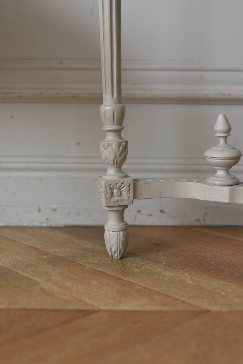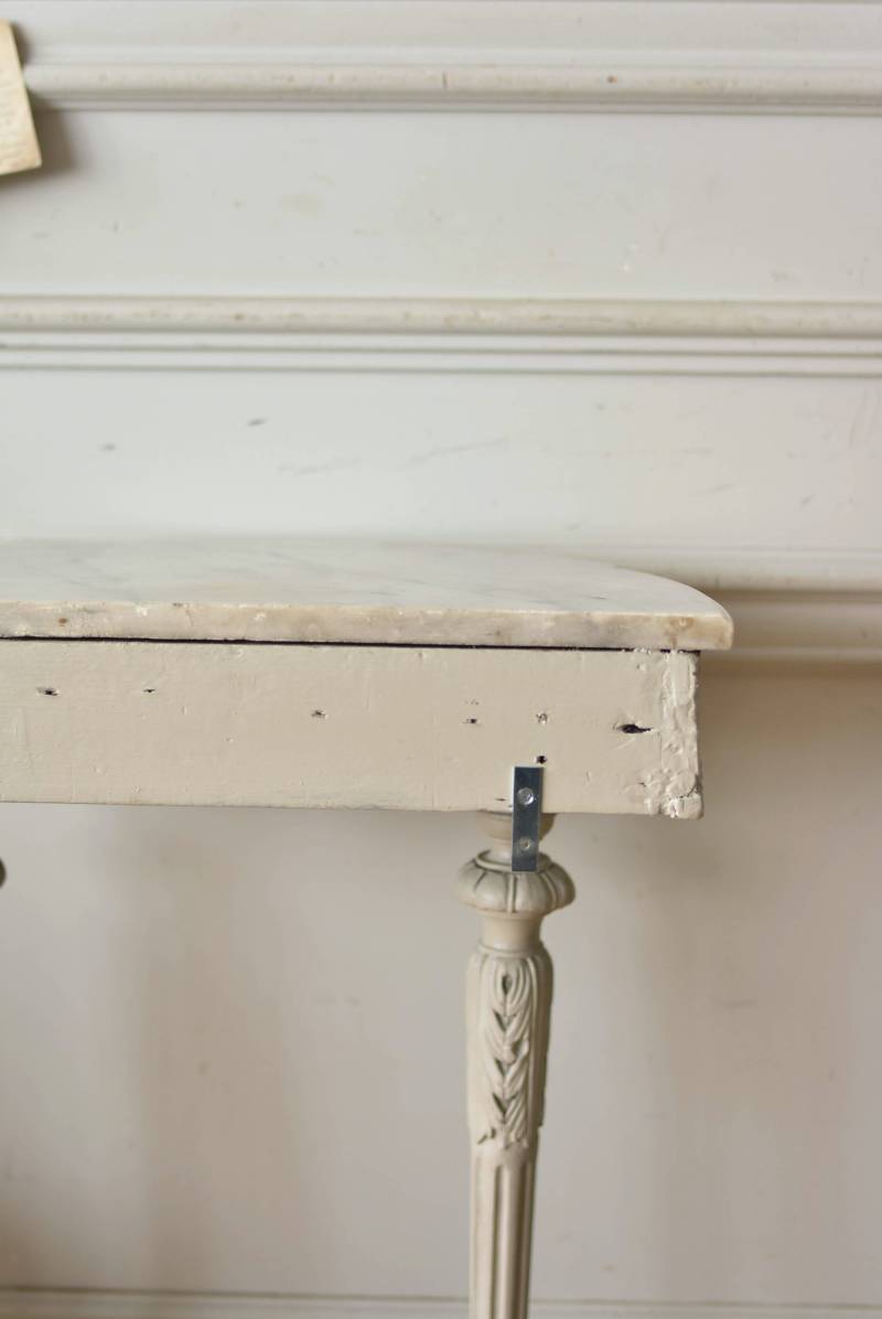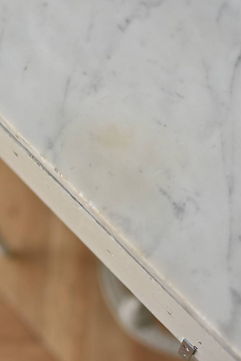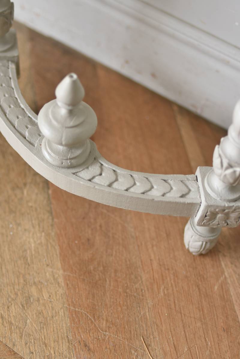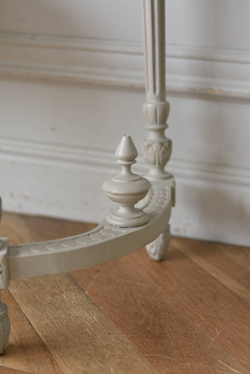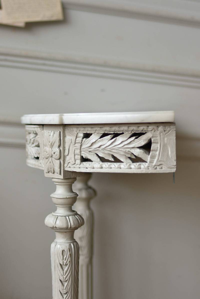 フランスのアンティークコンソールテーブル。 天板にホワイトを基調とした半月型のマーブルストーンがあしらわれ、素材ならではの高級感を楽しめる佇まい。ベルやアカンサスの葉をモチーフとした彫り模様や幕板部の透かし彫りが美しく、インテリアとしても絵になる装飾的なデザインです。 天板はボディに固定されており動きません。脚元に多少の歪み、天板にキズやシミ、亀裂が見受けられます。 比較的コンパクトなサイズで空間に取り入れやすく、背面の金具で壁面に固定して気品高い壁面ディスプレイを演出してくれるアイテムです。 W 約49.5cm D 約27cm H 約81.7cm 幕板までのH 約72.5cm こちらの商品の配送について