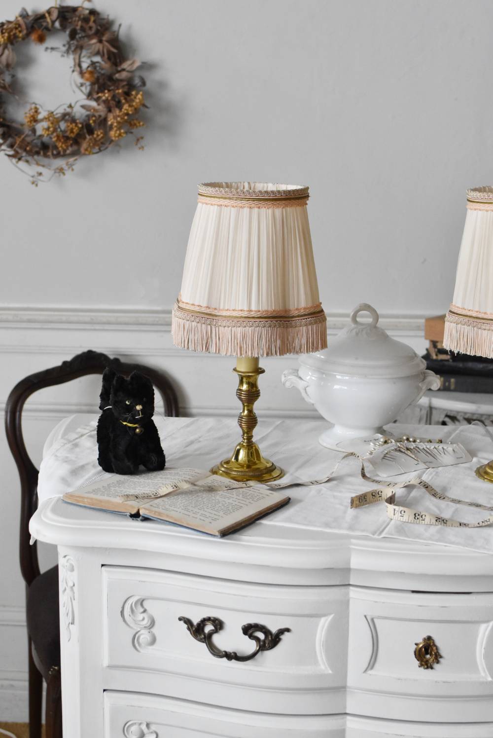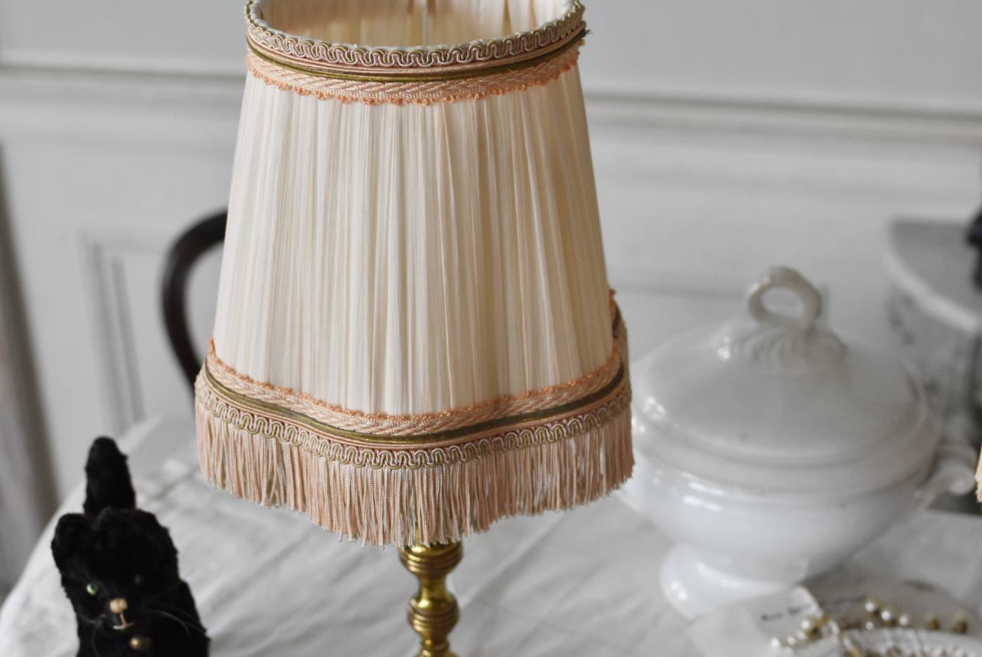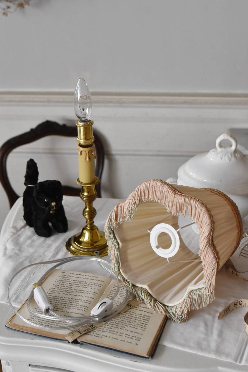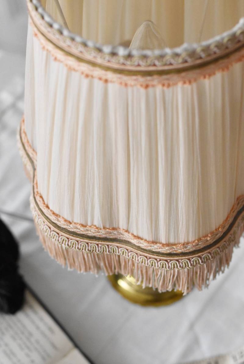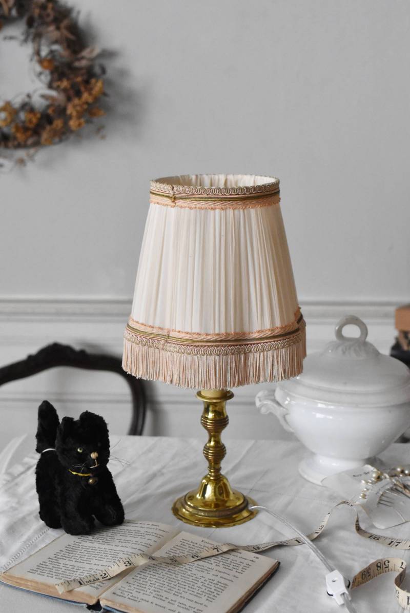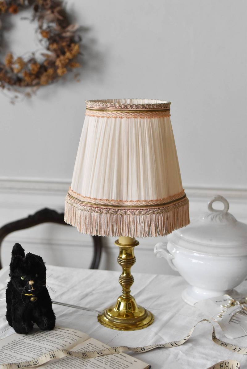 フランスのテーブルランプ。 細やかなギャザーがあしらわれた柔らかな布地に、ピンクやグリーンなどの淡いカラーのリボンやフリンジが合わさったフェミニンな姿で光を優しく包み込んでくれます。凸凹としたシルエットにリングが重ねられたような真鍮製の土台も個性的で、艶やかなゴールドカラーとなった上品な佇まいです。 ソケット・コード・スイッチは新しい物に交換済みです。 電球は付属しません。それぞれでの販売となりますが、同じデザインのテーブルランプ.Bがあります。 直径 約21cm H 約37cm 土台直径 約10cm 電球口径 E17 *60W以下をご使用下さい。
