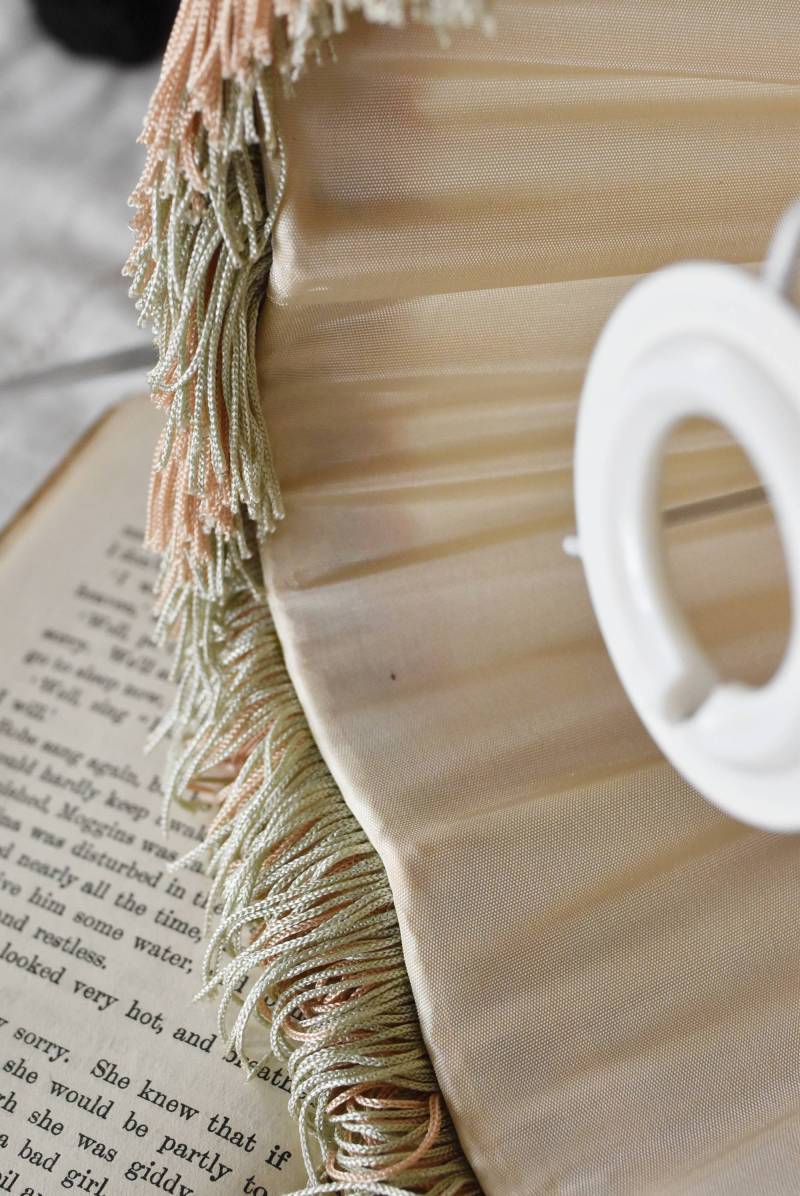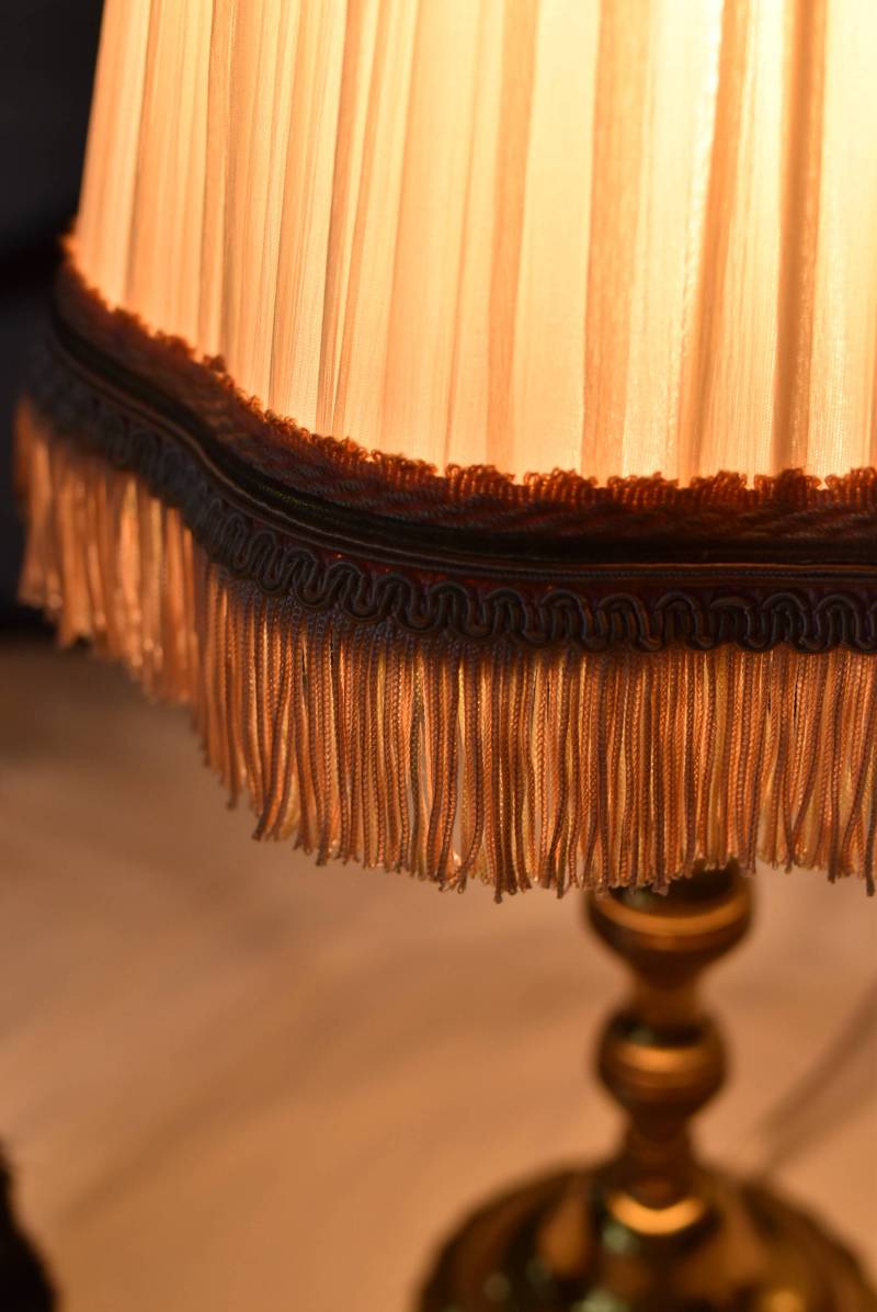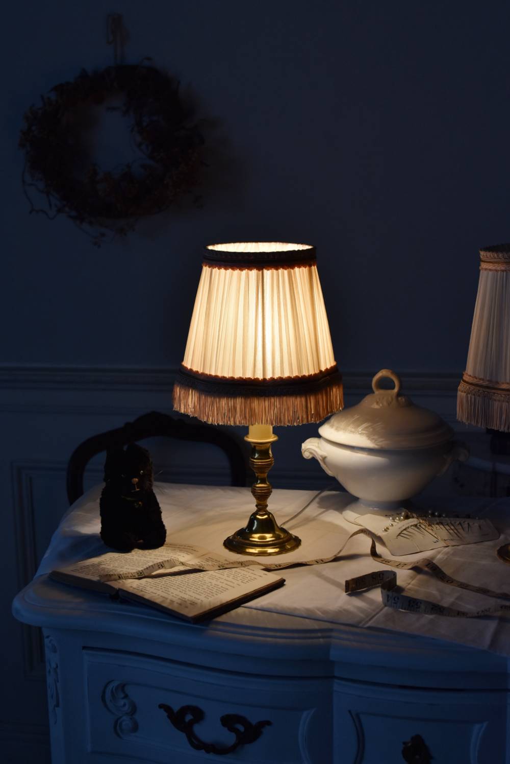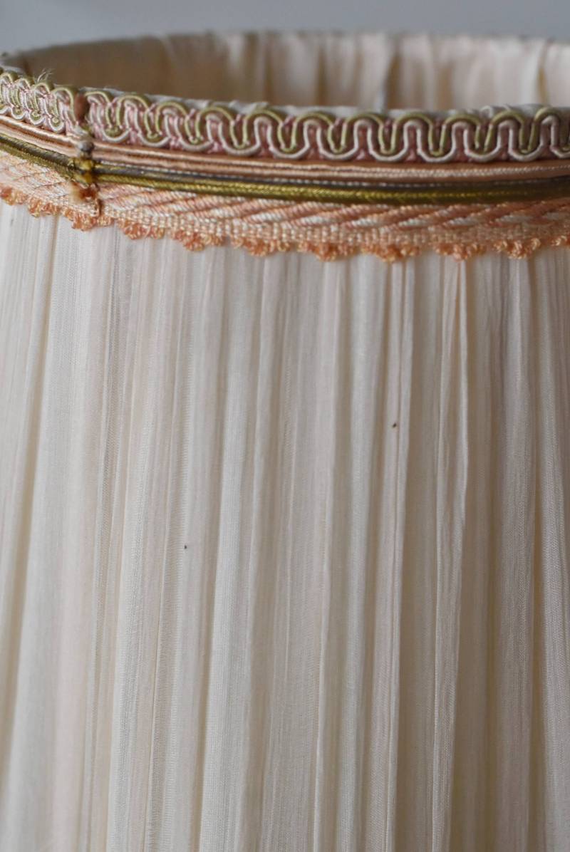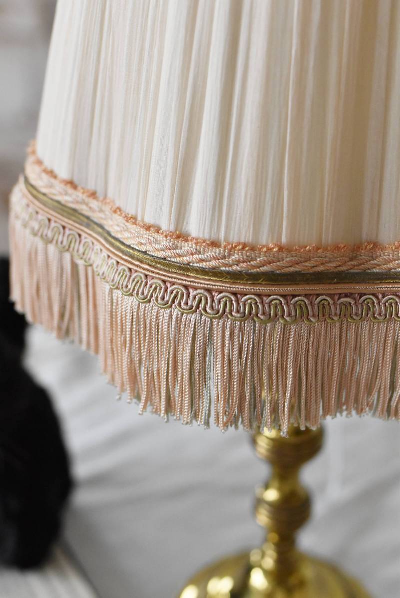 フランスのテーブルランプ。 細やかなギャザーがあしらわれた柔らかな布地に、ピンクやグリーンなどの淡いカラーのリボンやフリンジが合わさったフェミニンな姿で光を優しく包み込んでくれます。凸凹としたシルエットにリングが重ねられたような真鍮製の土台も個性的で、艶やかなゴールドカラーとなった上品な佇まいです。 ソケット・コード・スイッチは新しい物に交換済みです。 電球は付属しません。それぞれでの販売となりますが、同じデザインのテーブルランプ.Bがあります。 直径 約21cm H 約37cm 土台直径 約10cm 電球口径 E17 *60W以下をご使用下さい。