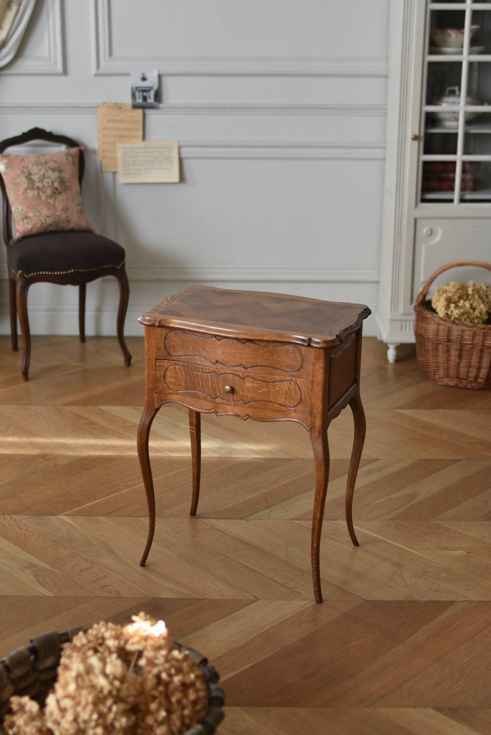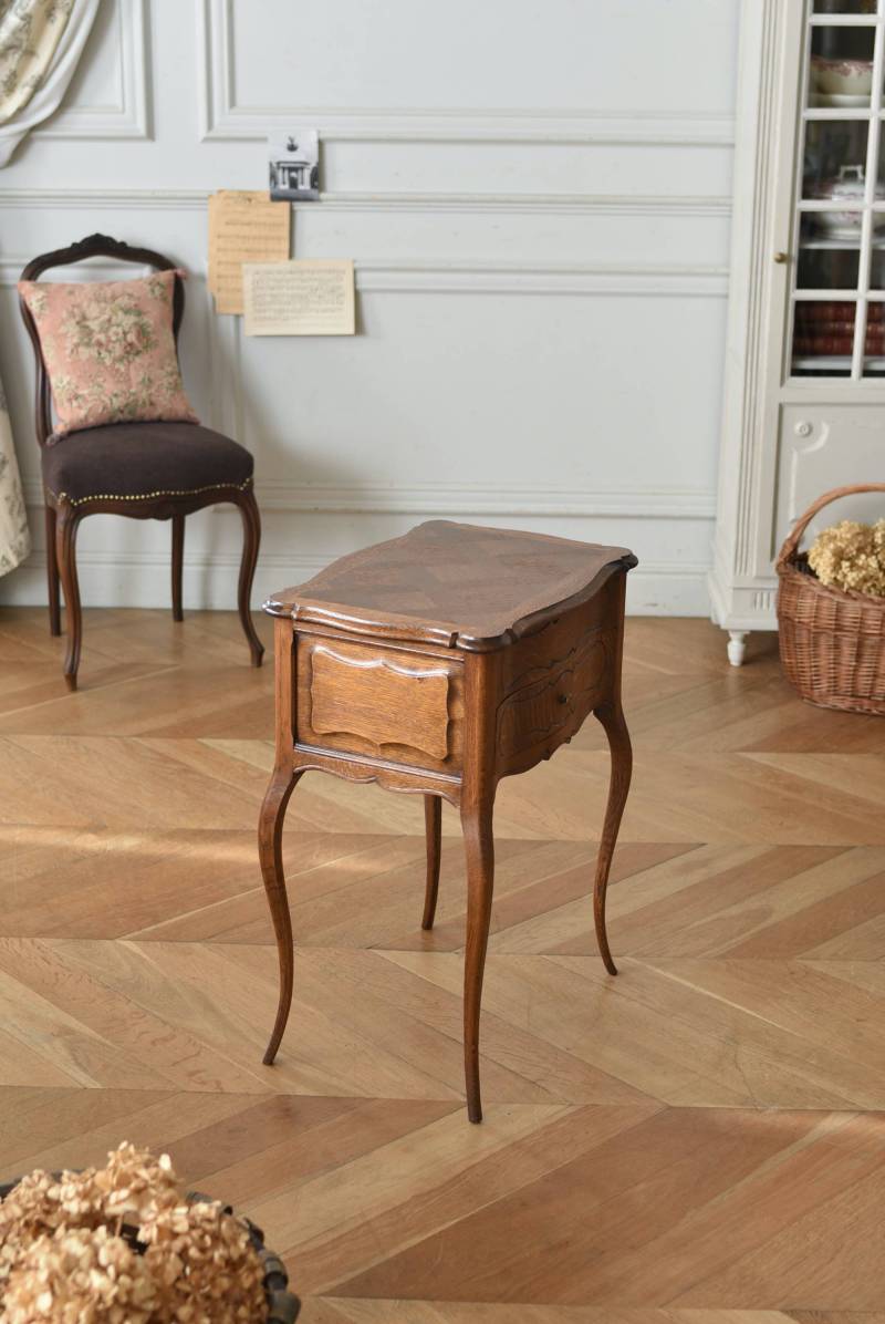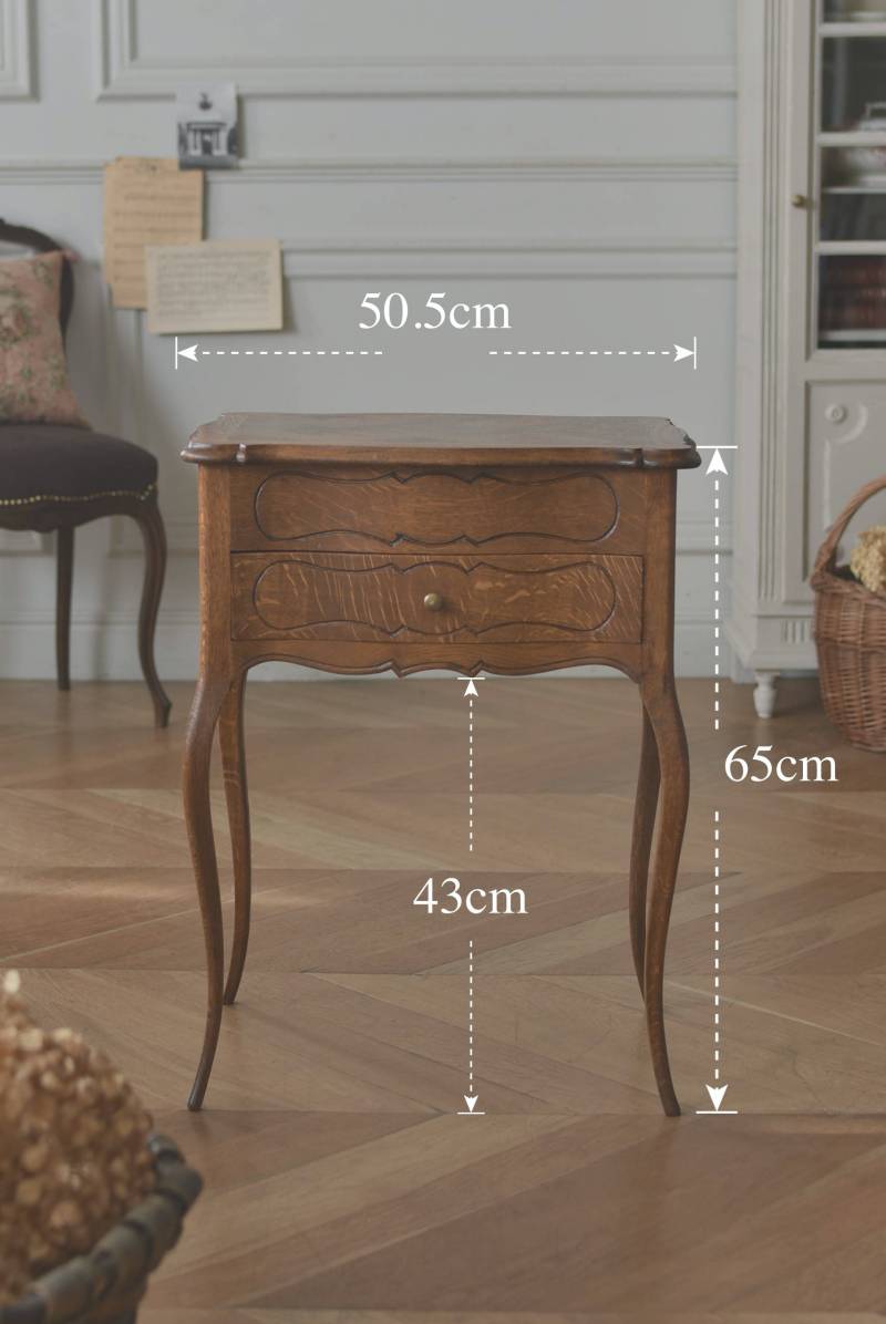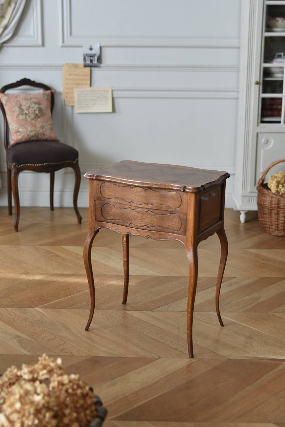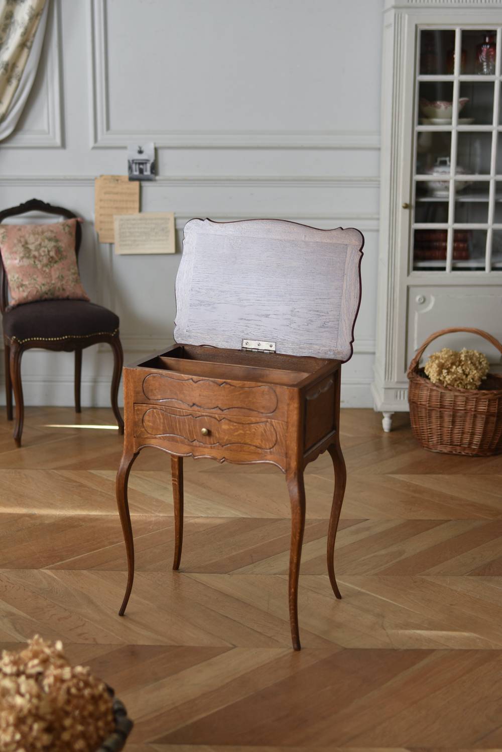 フランス1930年頃のサイドテーブル。 ミルクチョコレートのような柔らかなブラウンカラーでまとまった落ち着きある姿で、小ぶりなボディとすらりと伸びる華奢な脚元が特徴的。細やかな造形の縁ラインや表面に施されたシンプルな彫り装飾が、フランスらしい優雅なイメージをもたらしてくれます。突板模様が美しい天板を開くと仕切りのついた収納スペースが顔を出し、2段の引き出しのように見える正面は上段がダミー、下段に引き出しが1つ設けられたユニークな作りに。 コンパクトなサイズ感でお部屋にも取り入れやすく、再塗装を行った艶やかな質感でクラシカルテイストの空間にも映えるアイテムです。 W 約50.5cm D 約35.5cm H 約65cm 内寸 W約40cm×D約24cm×深さ約7cm 引き出し内寸 W約36cm×D約21.5cm×H約7.3cm こちらの商品の配送について